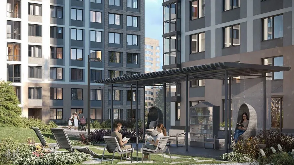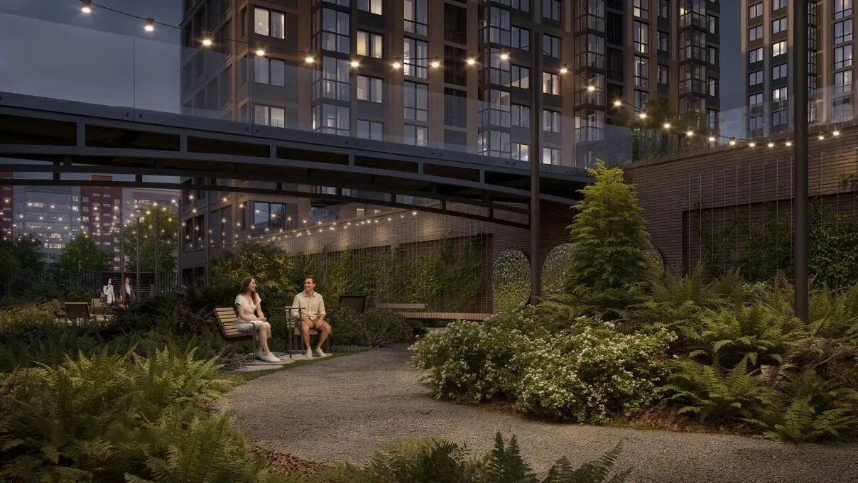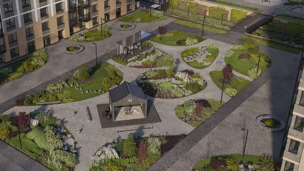 Двор комплекса закрыт для транспорта и разделён на две концептуальные зоны, символизирующие правое и левое полушария гениального интеллекта. Первая часть — тихое, созерцательное пространство с библио‑беседкой и лежаками для медитации. Вторая — территория для общения и обмена эмоциями. Обе зоны соединяет пешеходный мост, под которым проложен прогулочный променад с зонами отдыха и бранч‑зоной.