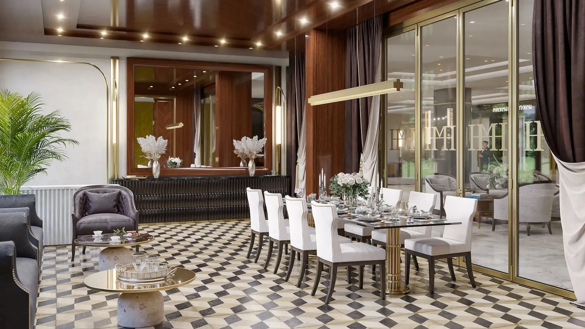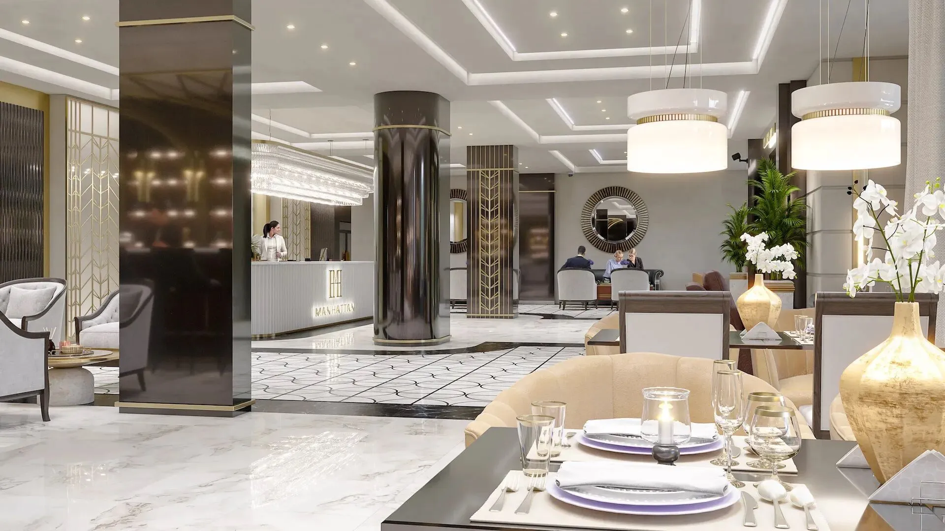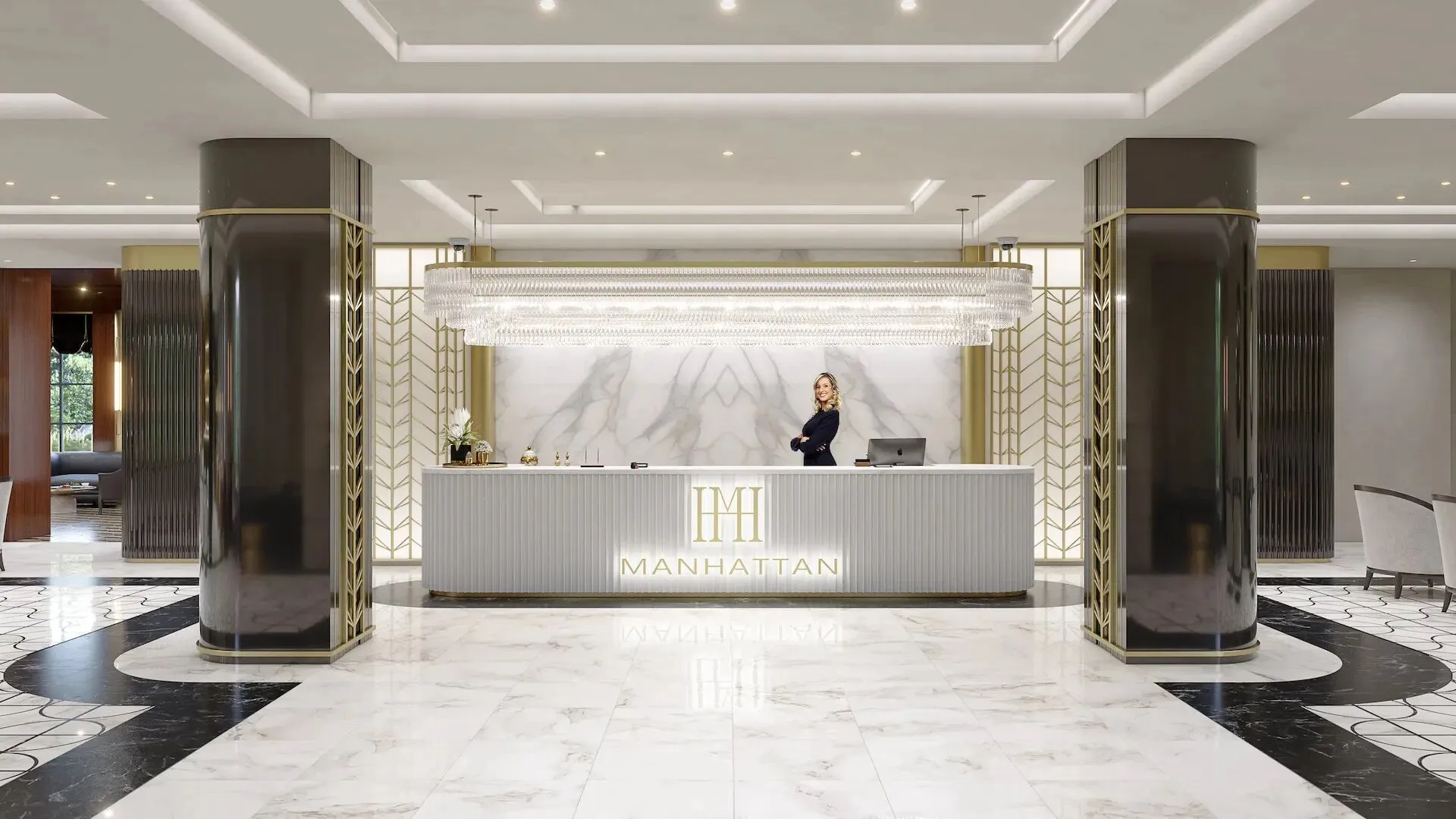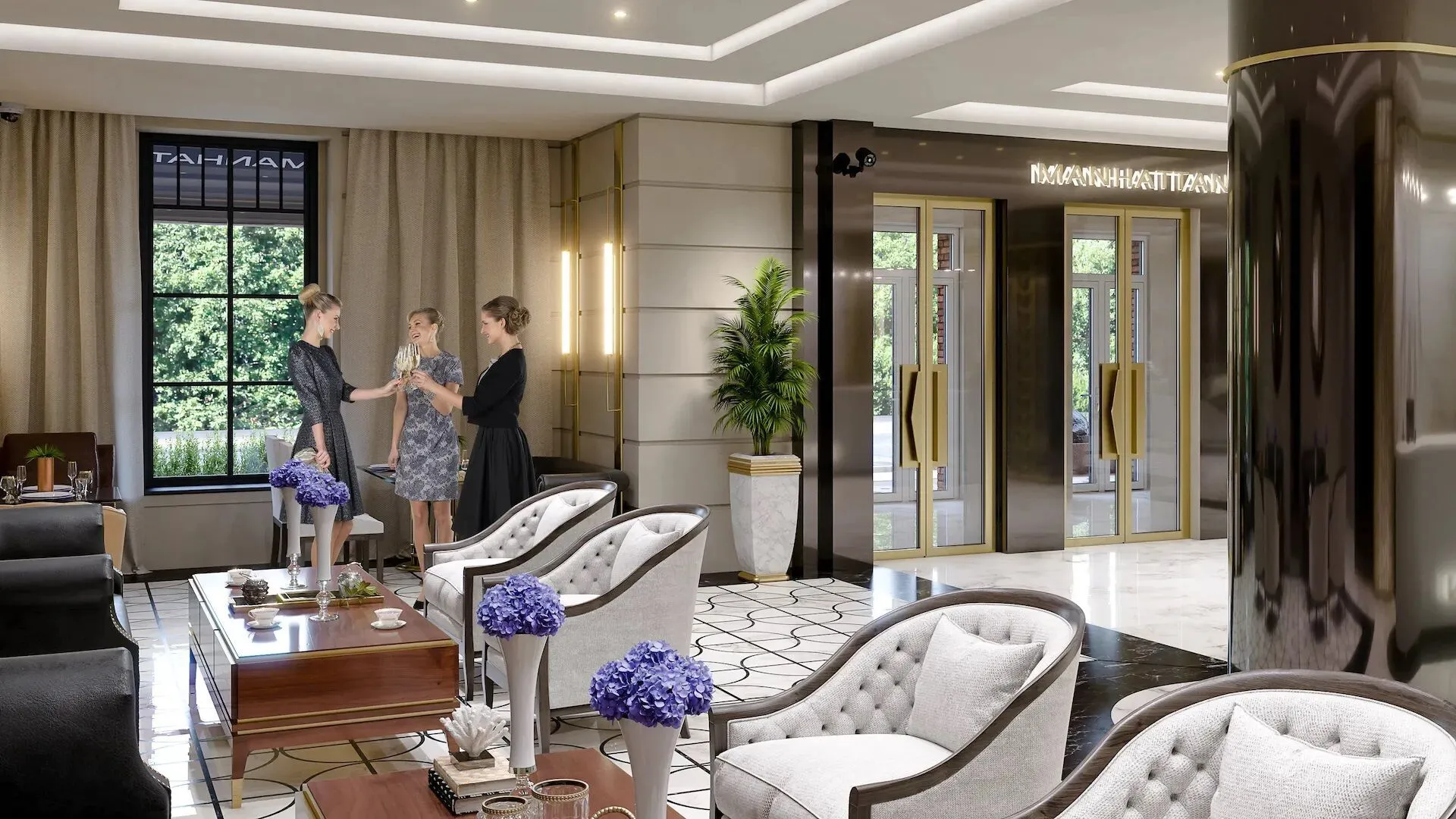 Общественные пространства и сервис соответствуют уровню пятизвёздочного отеля. Просторное лобби площадью около 400 м отделано итальянским мрамором и ценными породами дерева. Здесь размещены лаундж‑бар, wellness‑центр, переговорная и колясочная. Работает круглосуточный консьерж‑сервис. Для управления комфортом внедрена система «Умный дом»: с её помощью можно контролировать видеонаблюдение, освещение, климат‑контроль и бытовые устройства через смартфон.