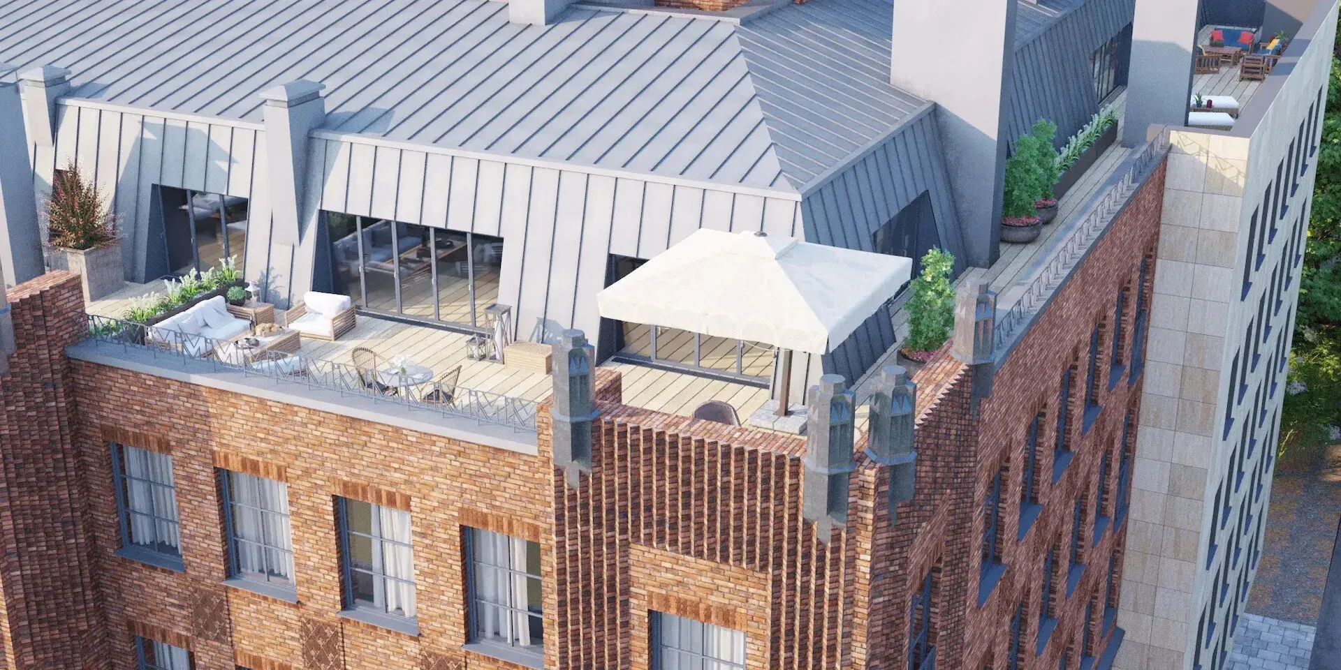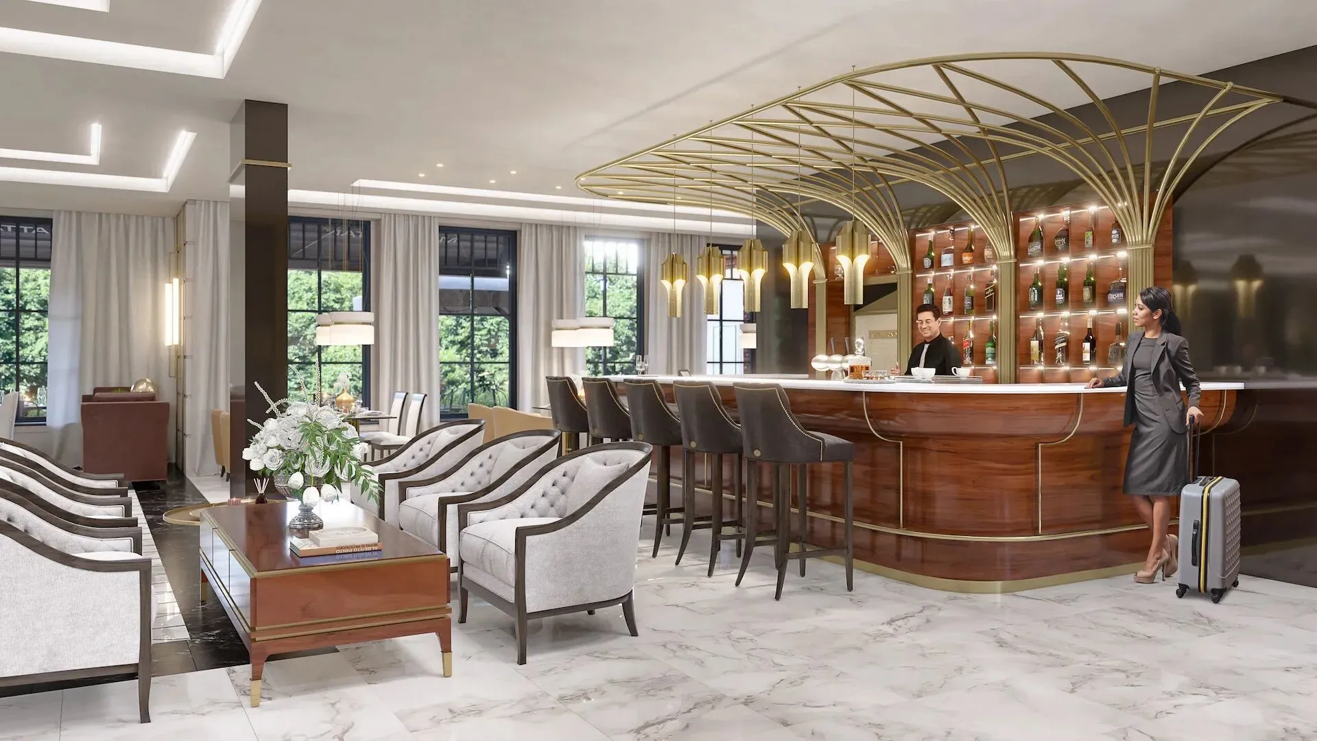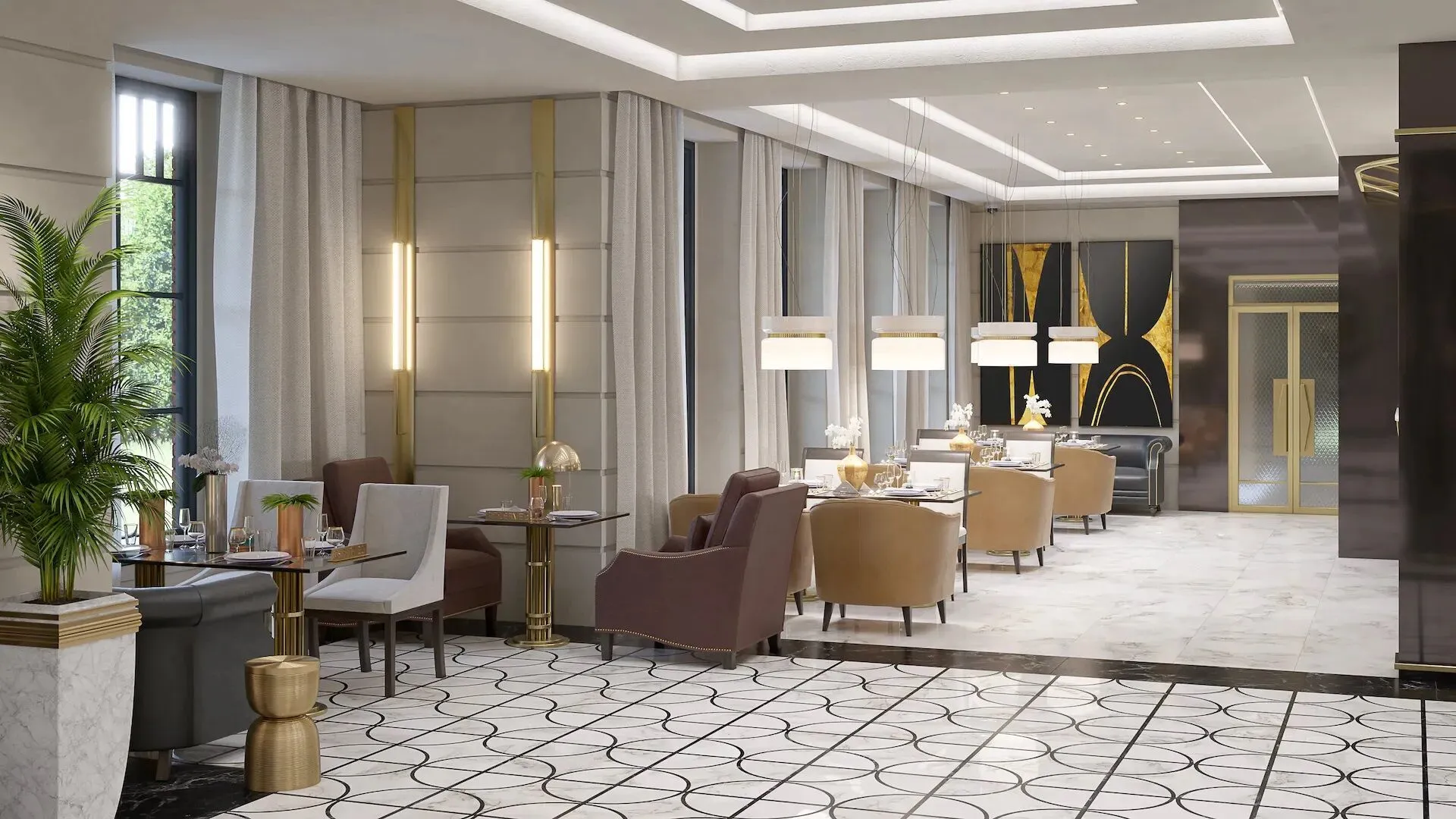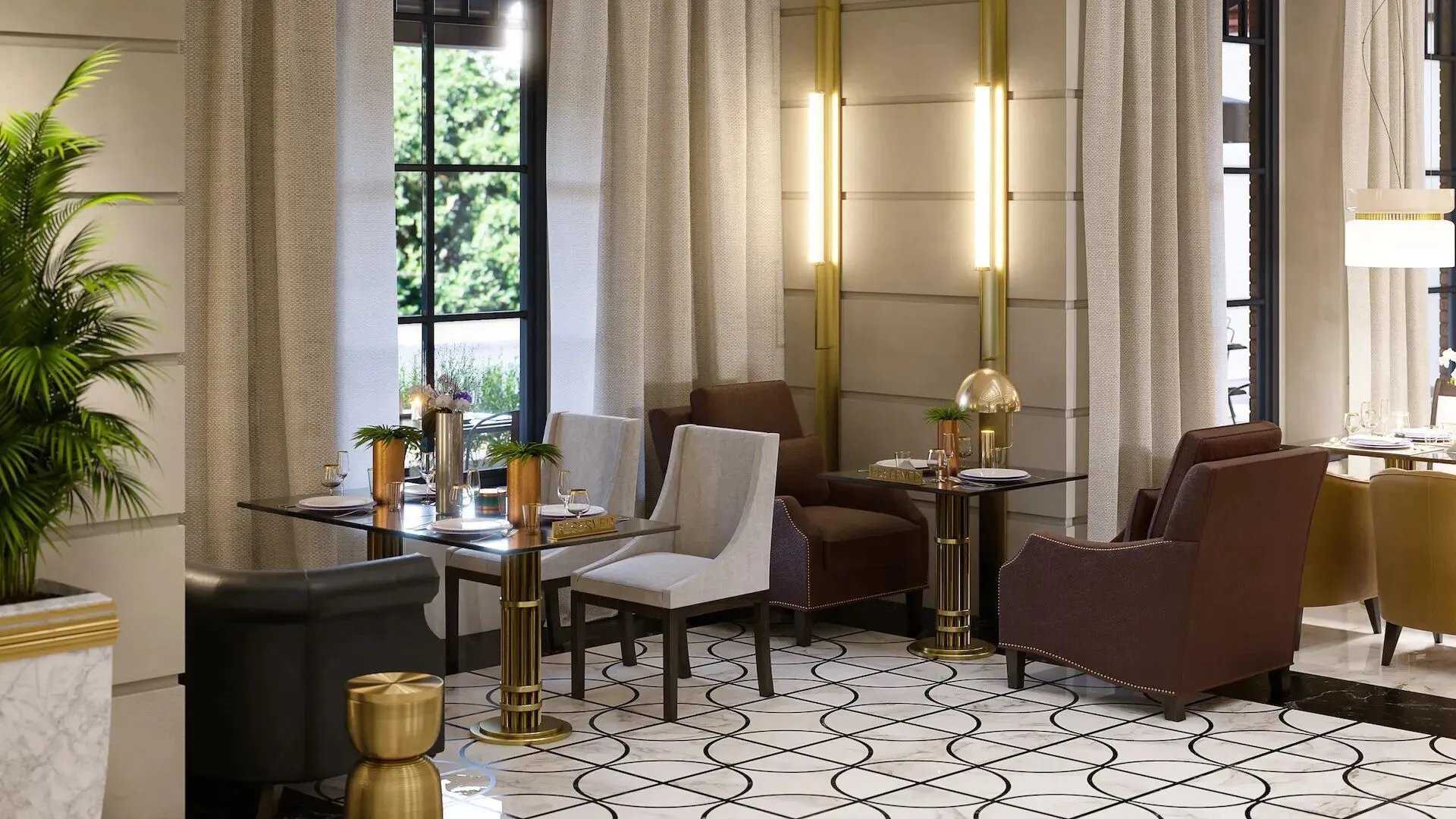 Общественные пространства и сервис соответствуют уровню пятизвёздочного отеля. Просторное лобби площадью около 400 м отделано итальянским мрамором и ценными породами дерева. Здесь размещены лаундж‑бар, wellness‑центр, переговорная и колясочная. Работает круглосуточный консьерж‑сервис. Для управления комфортом внедрена система «Умный дом»: с её помощью можно контролировать видеонаблюдение, освещение, климат‑контроль и бытовые устройства через смартфон.