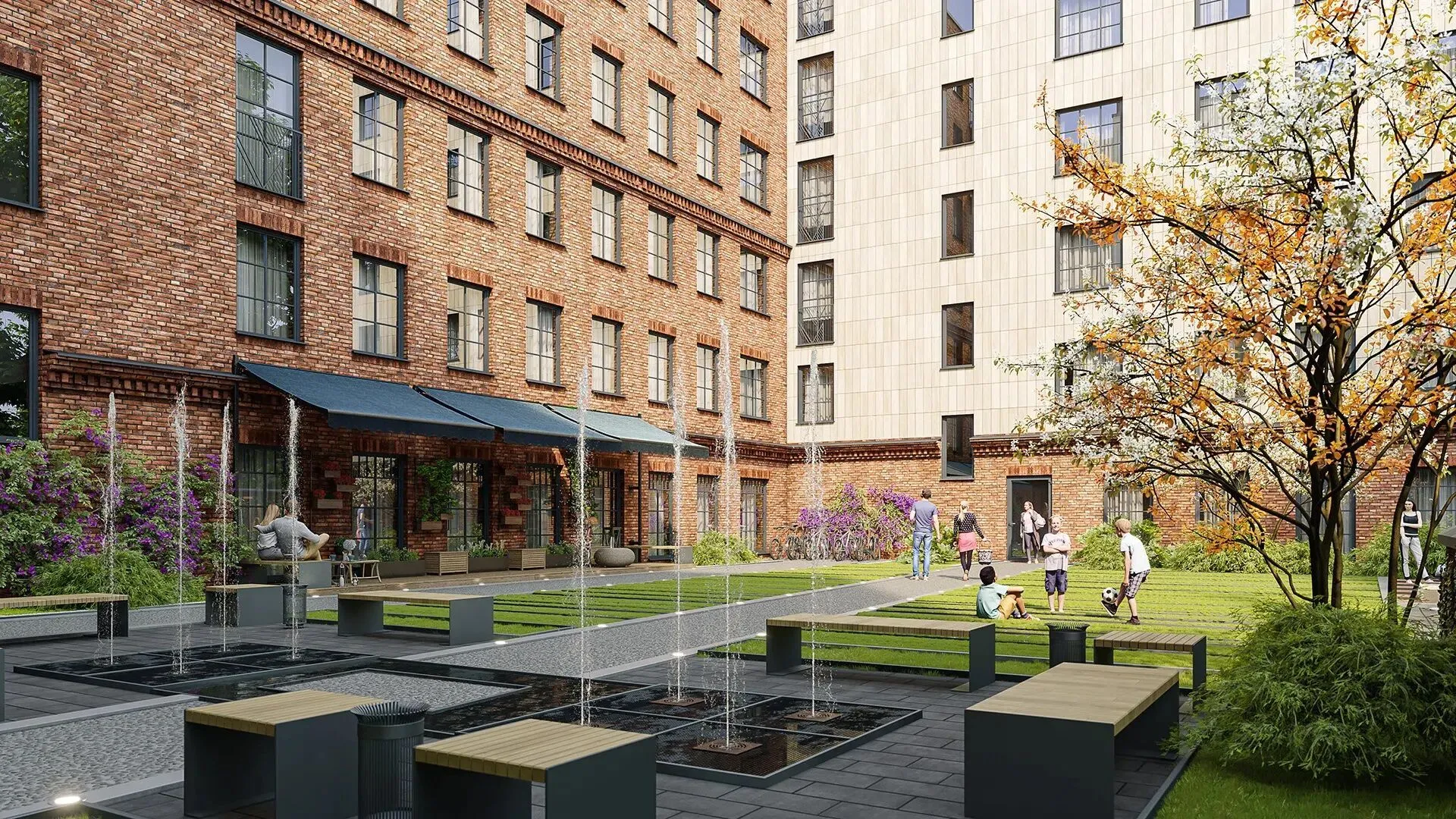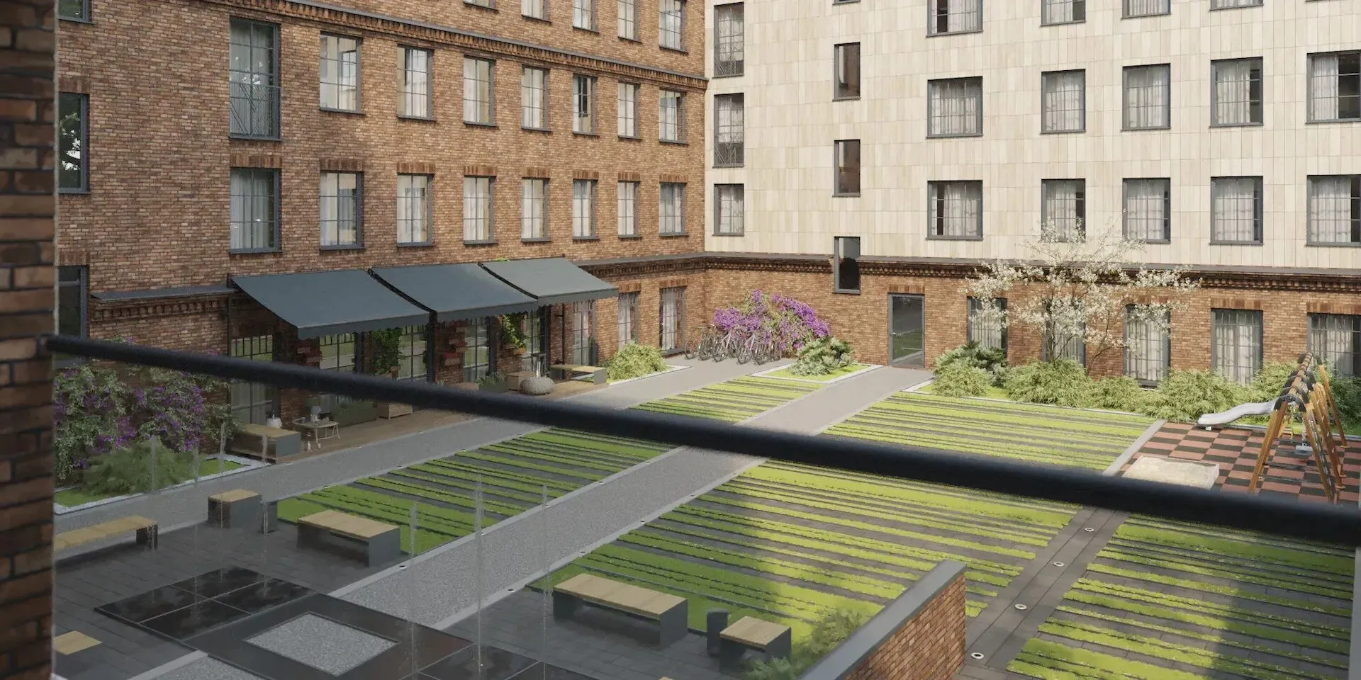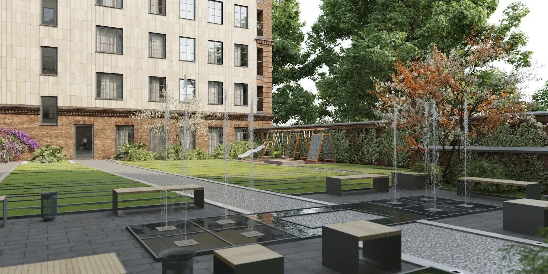 Территория комплекса закрыта и охраняется. Внутренний двор оформлен в стиле минимализма: центральное место занимает фонтан, по периметру устроены зоны отдыха, утопающие в зелени. Для детей оборудована игровая площадка. Действует система видеонаблюдения и автоматическая система доступа.