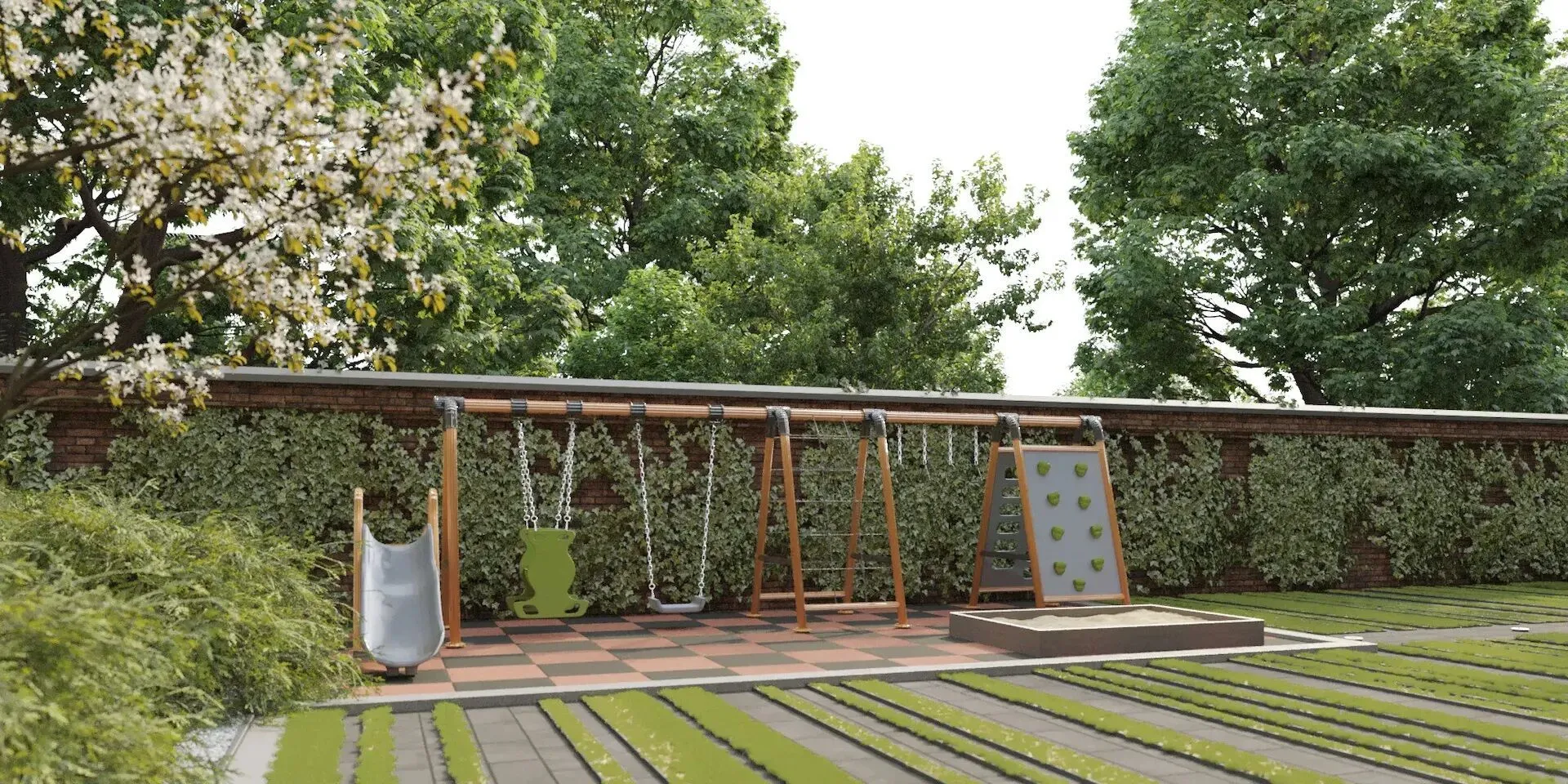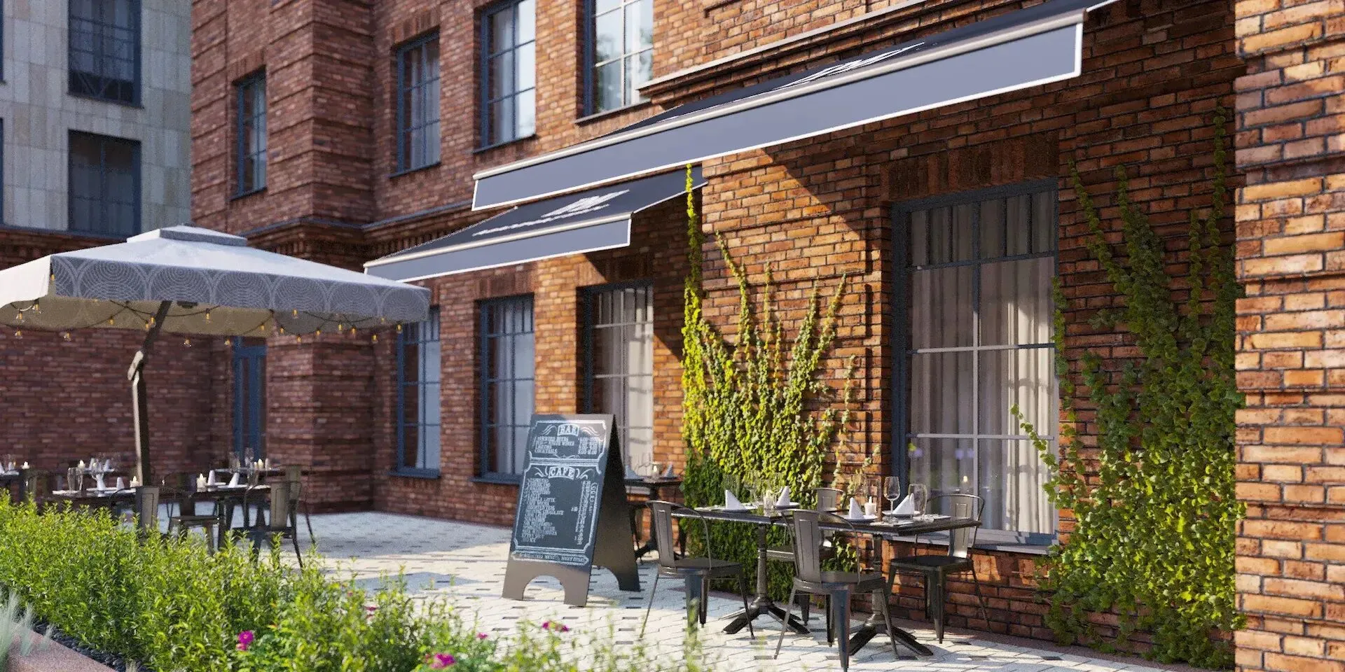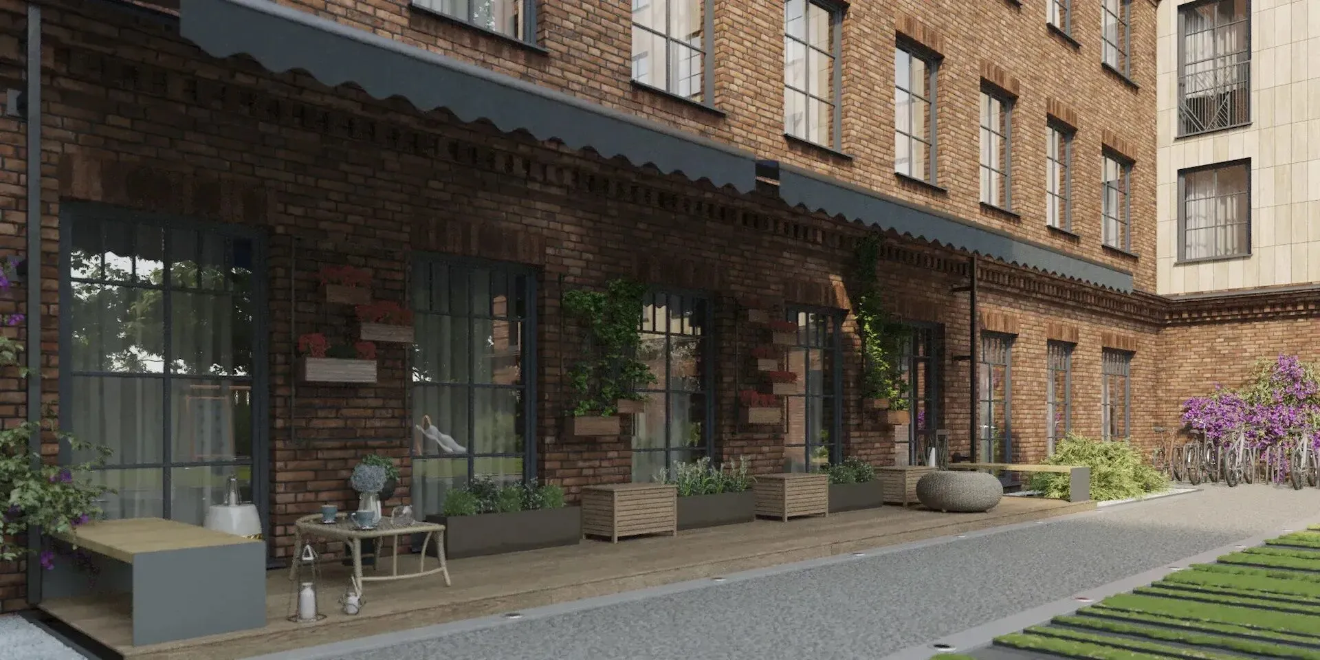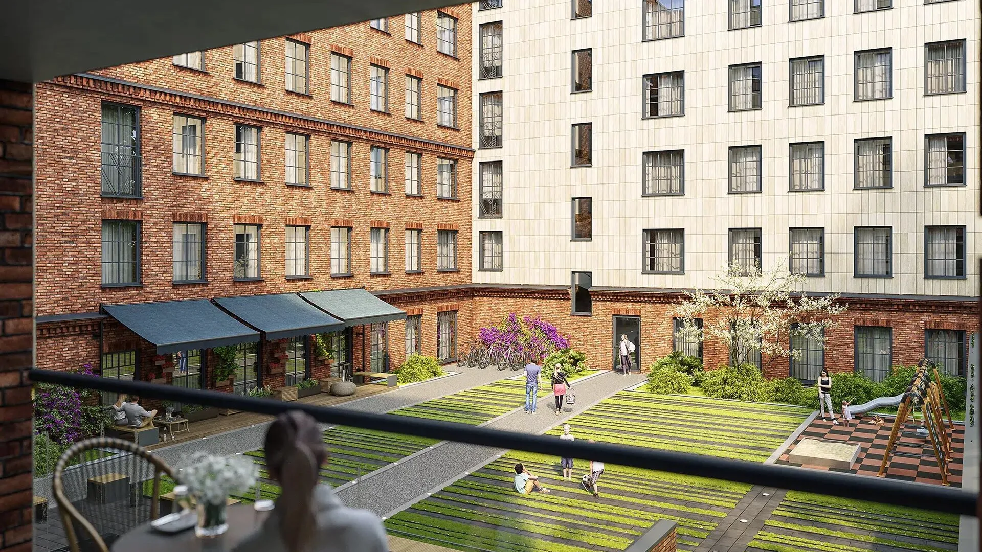 Территория комплекса закрыта и охраняется. Внутренний двор оформлен в стиле минимализма: центральное место занимает фонтан, по периметру устроены зоны отдыха, утопающие в зелени. Для детей оборудована игровая площадка. Действует система видеонаблюдения и автоматическая система доступа.