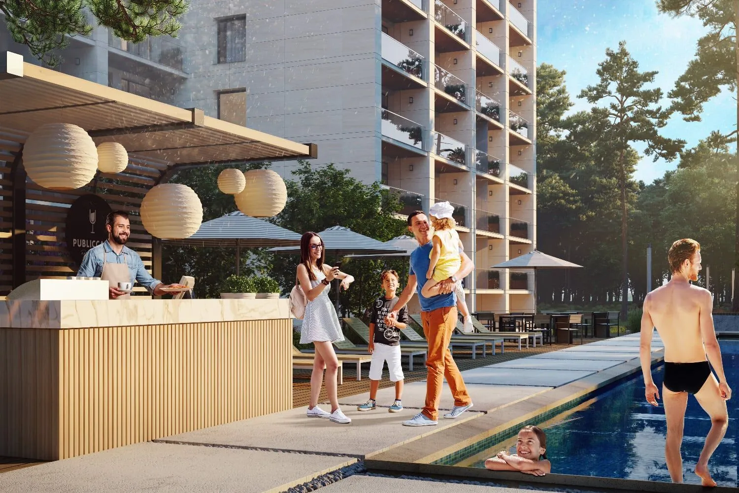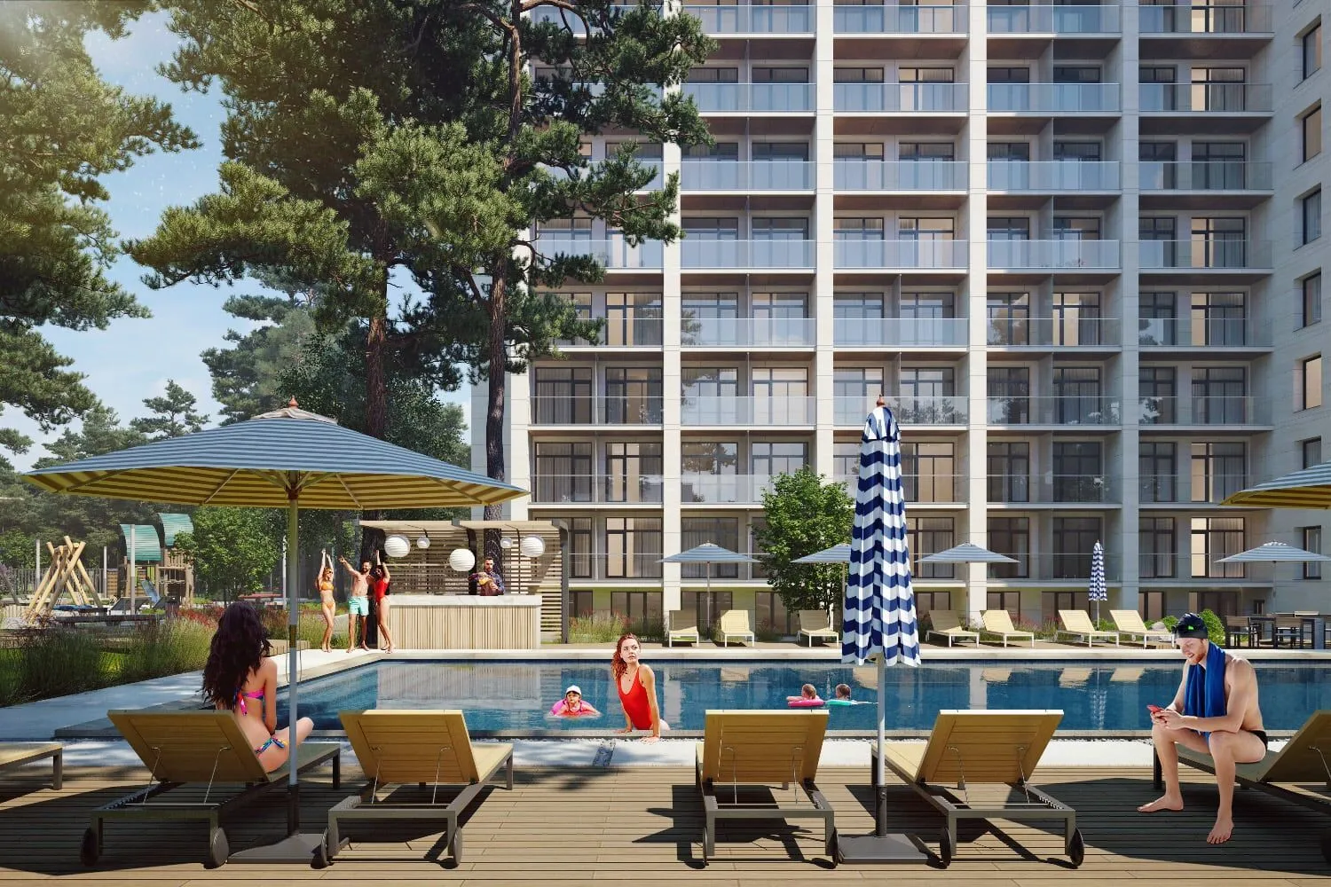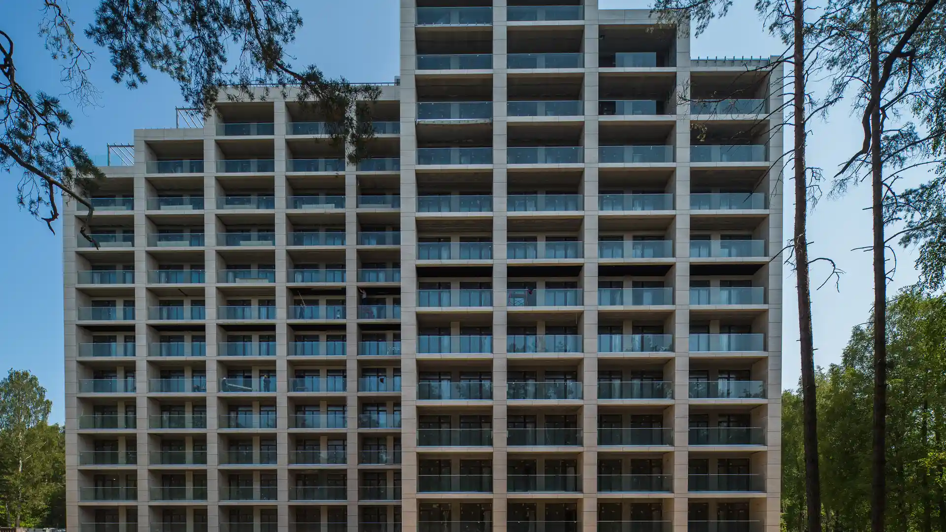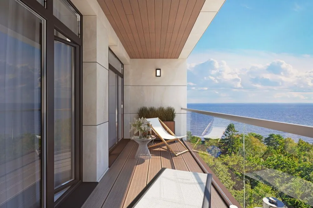Ключевая особенность апартаментов — панорамное остекление, обеспечивающее живописные виды на Финский залив и хвойный лес. На верхних этажах расположены резиденции с саунами и просторными террасами. Площадь юнитов варьируется от 21 до 123 м², высота потолков достигает 3 м.