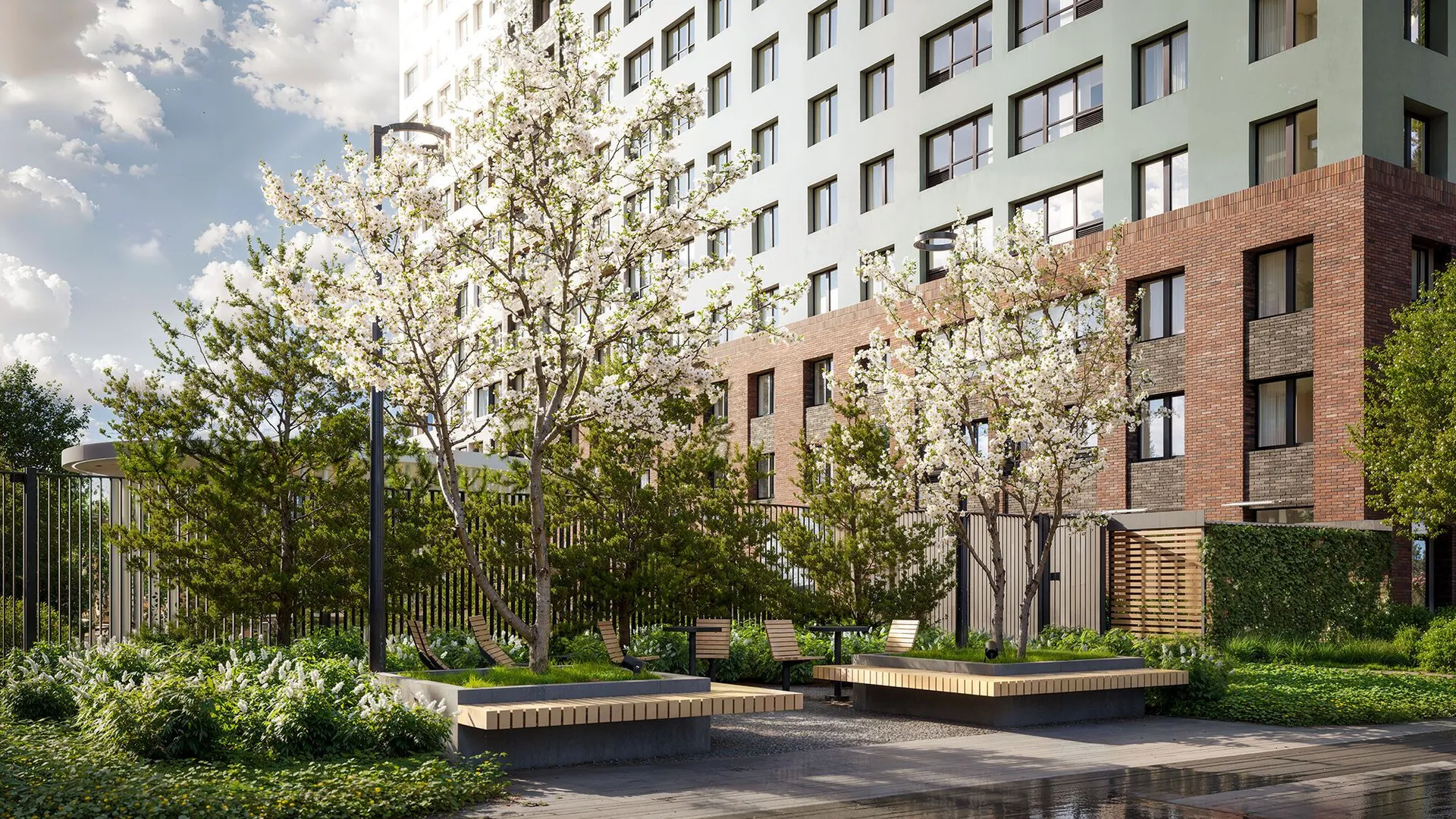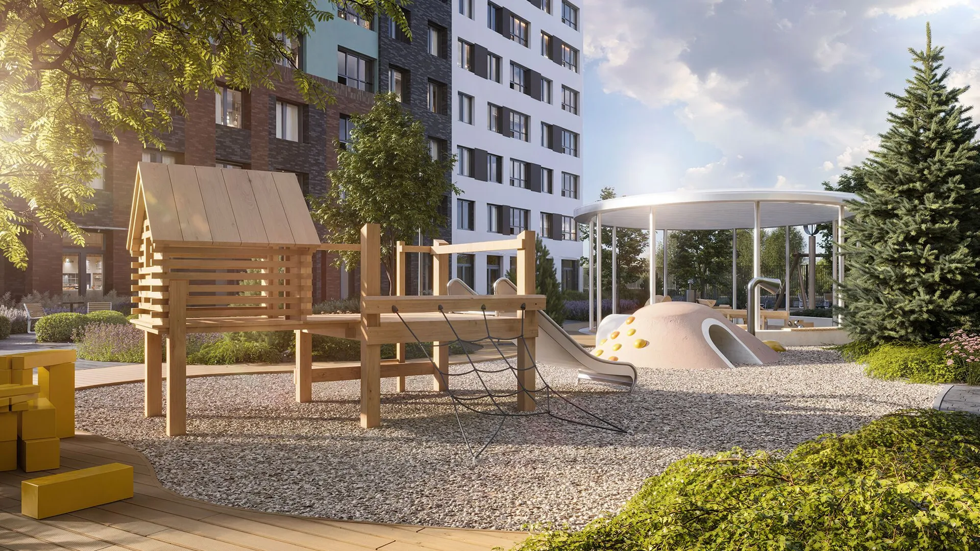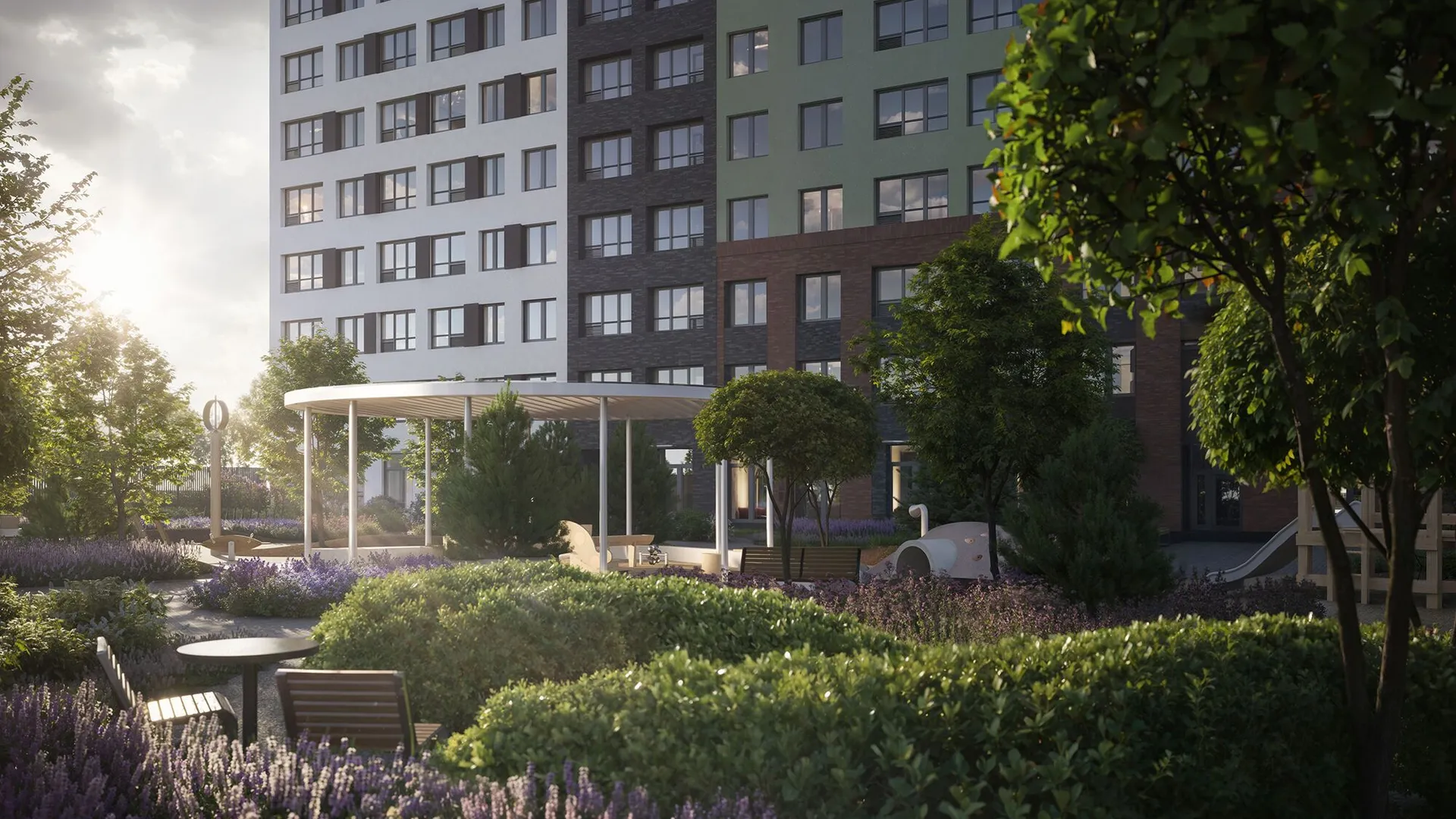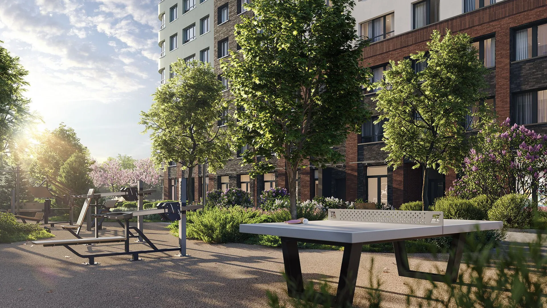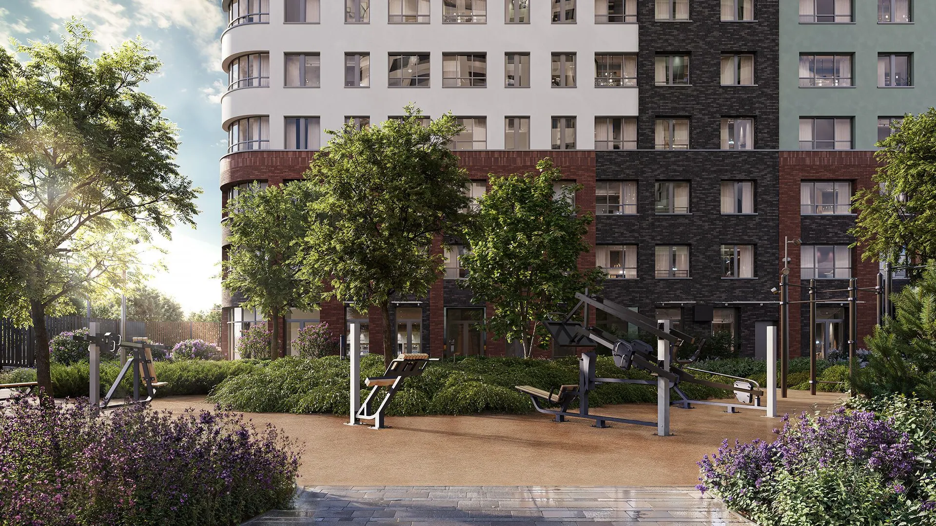 Территория комплекса полностью закрыта от машин и посторонних, охраняется круглосуточно, вход осуществляется по электронному ключу бесконтактного доступа. Дворы разделены прогулочной аллеей с фруктовым садом. Здесь обустроены места для отдыха — беседки с качелями, зелёные кабинеты и лежаки, а также фитнес‑зоны с тренажерами, workout‑комплексом и пространством для йоги. Для детей предусмотрены площадки с безопасным покрытием и современным оборудованием: крытая песочница с водным аттракционом, зона качелей, карусель «Вихрь», туннель и большой лабиринт для подростков.