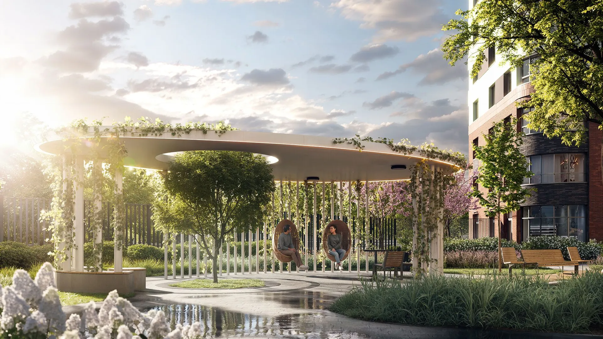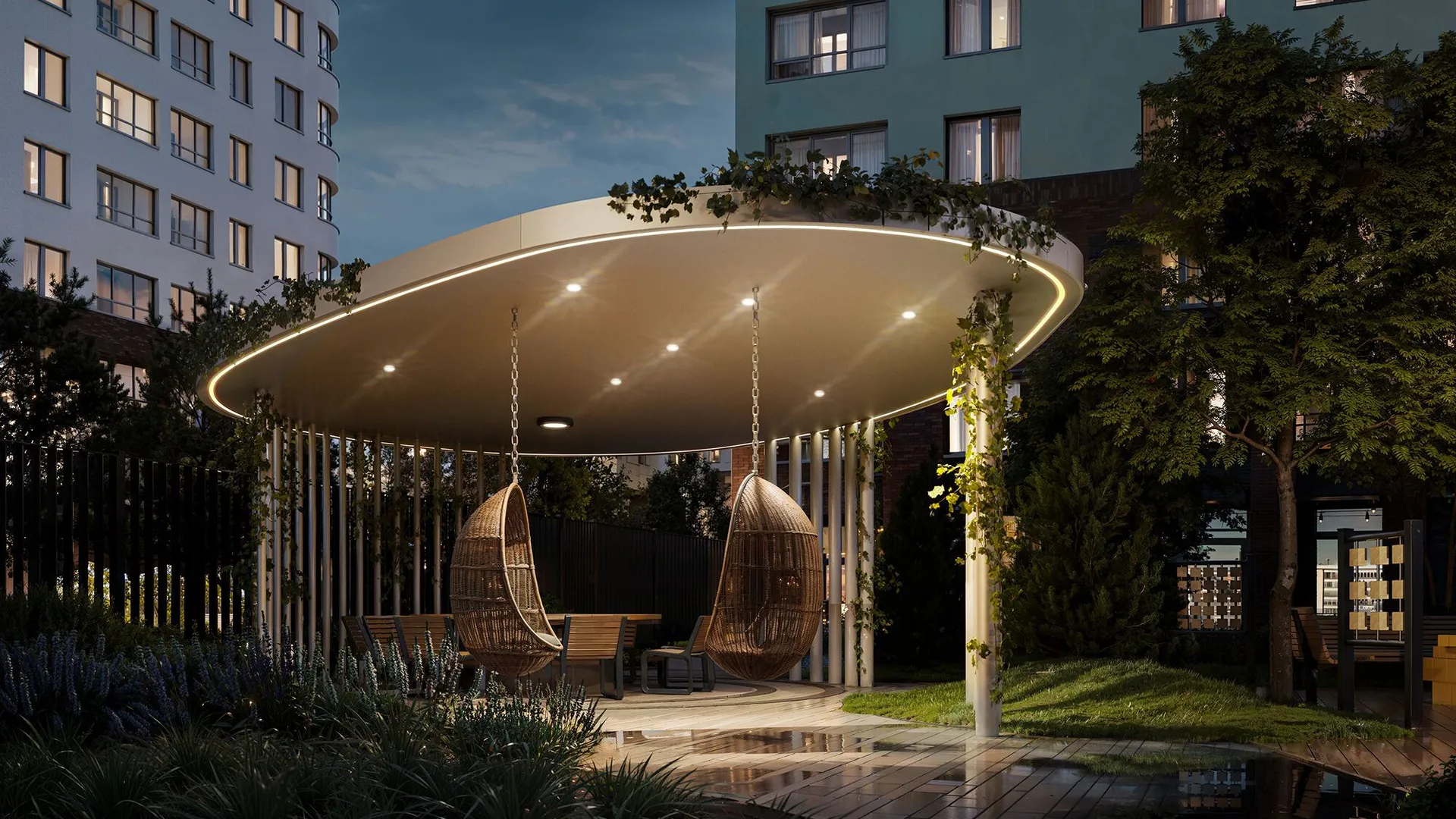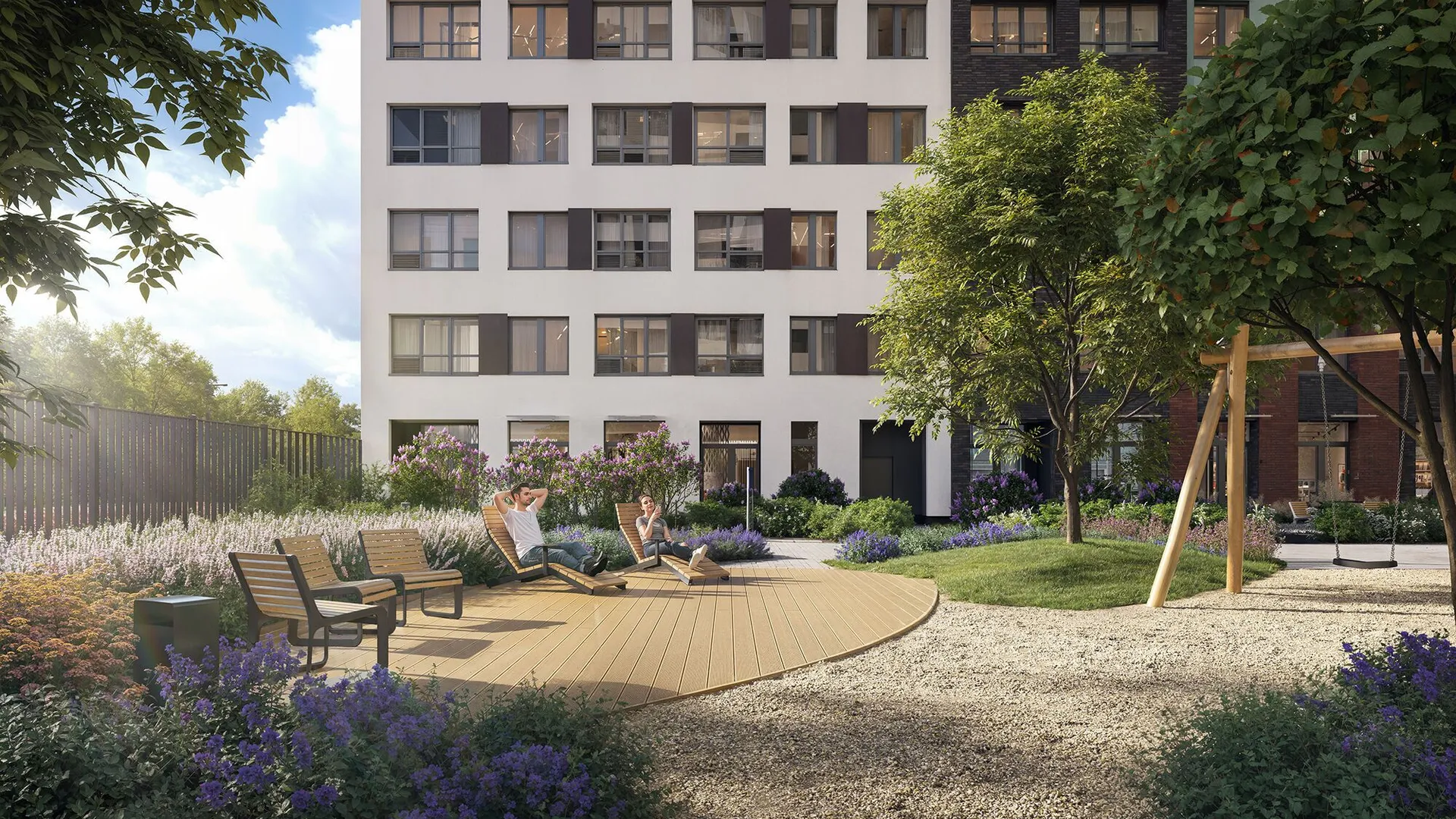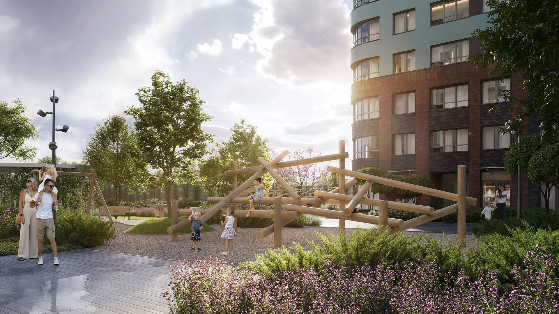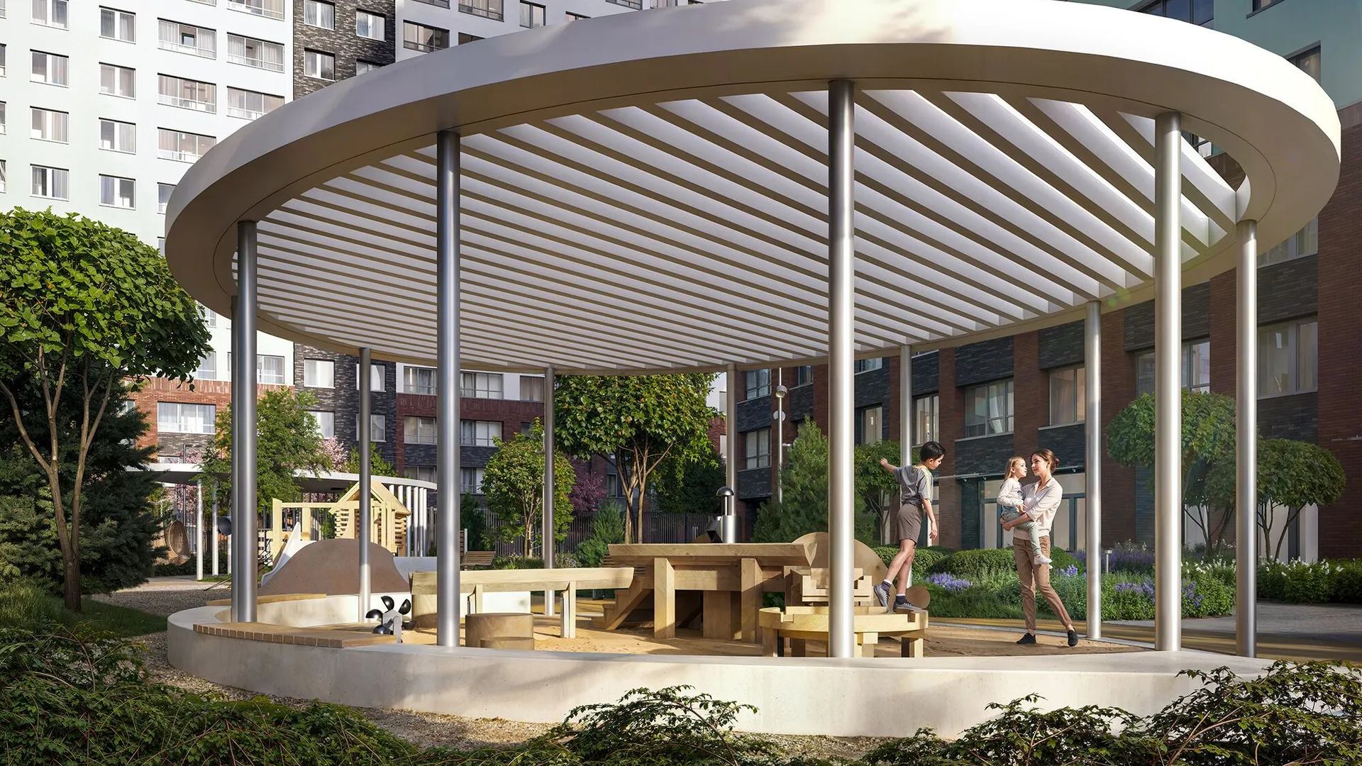 Территория комплекса полностью закрыта от машин и посторонних, охраняется круглосуточно, вход осуществляется по электронному ключу бесконтактного доступа. Дворы разделены прогулочной аллеей с фруктовым садом. Здесь обустроены места для отдыха — беседки с качелями, зелёные кабинеты и лежаки, а также фитнес‑зоны с тренажерами, workout‑комплексом и пространством для йоги. Для детей предусмотрены площадки с безопасным покрытием и современным оборудованием: крытая песочница с водным аттракционом, зона качелей, карусель «Вихрь», туннель и большой лабиринт для подростков.