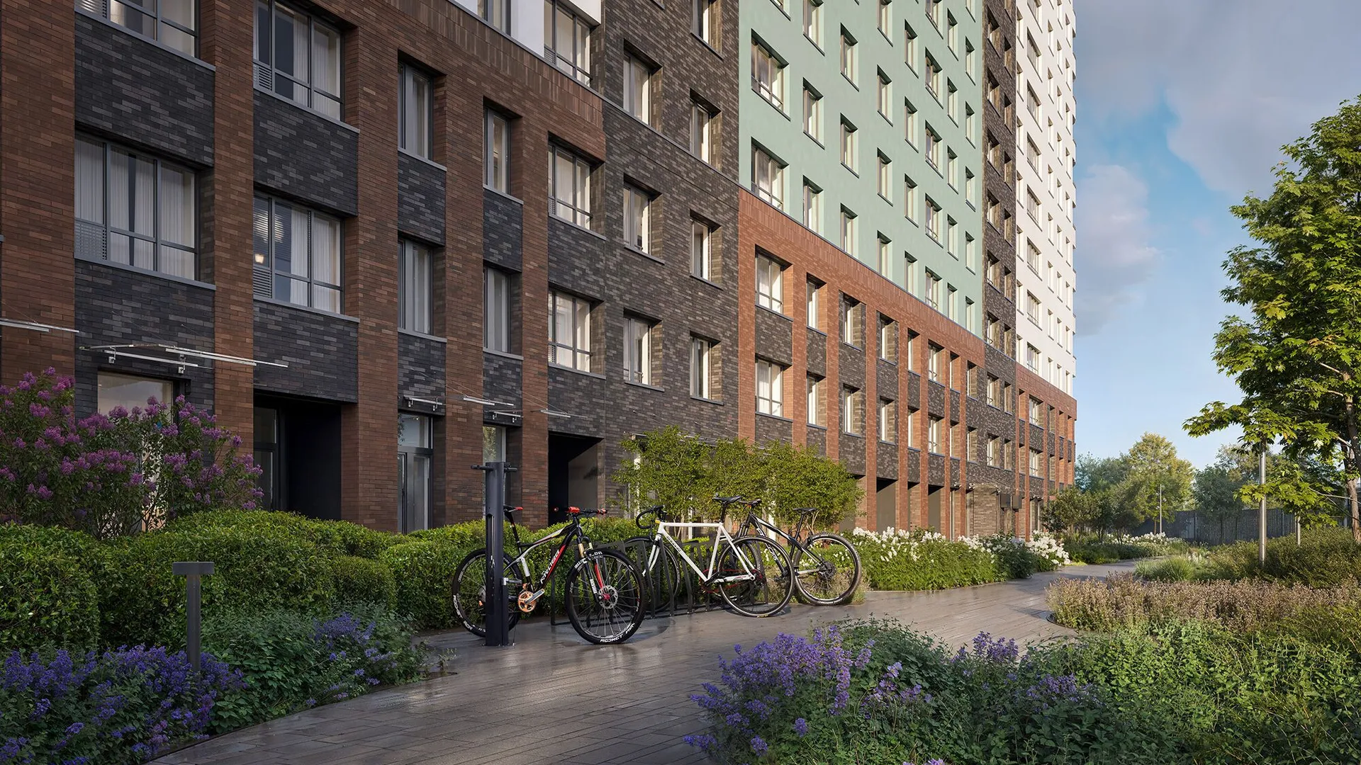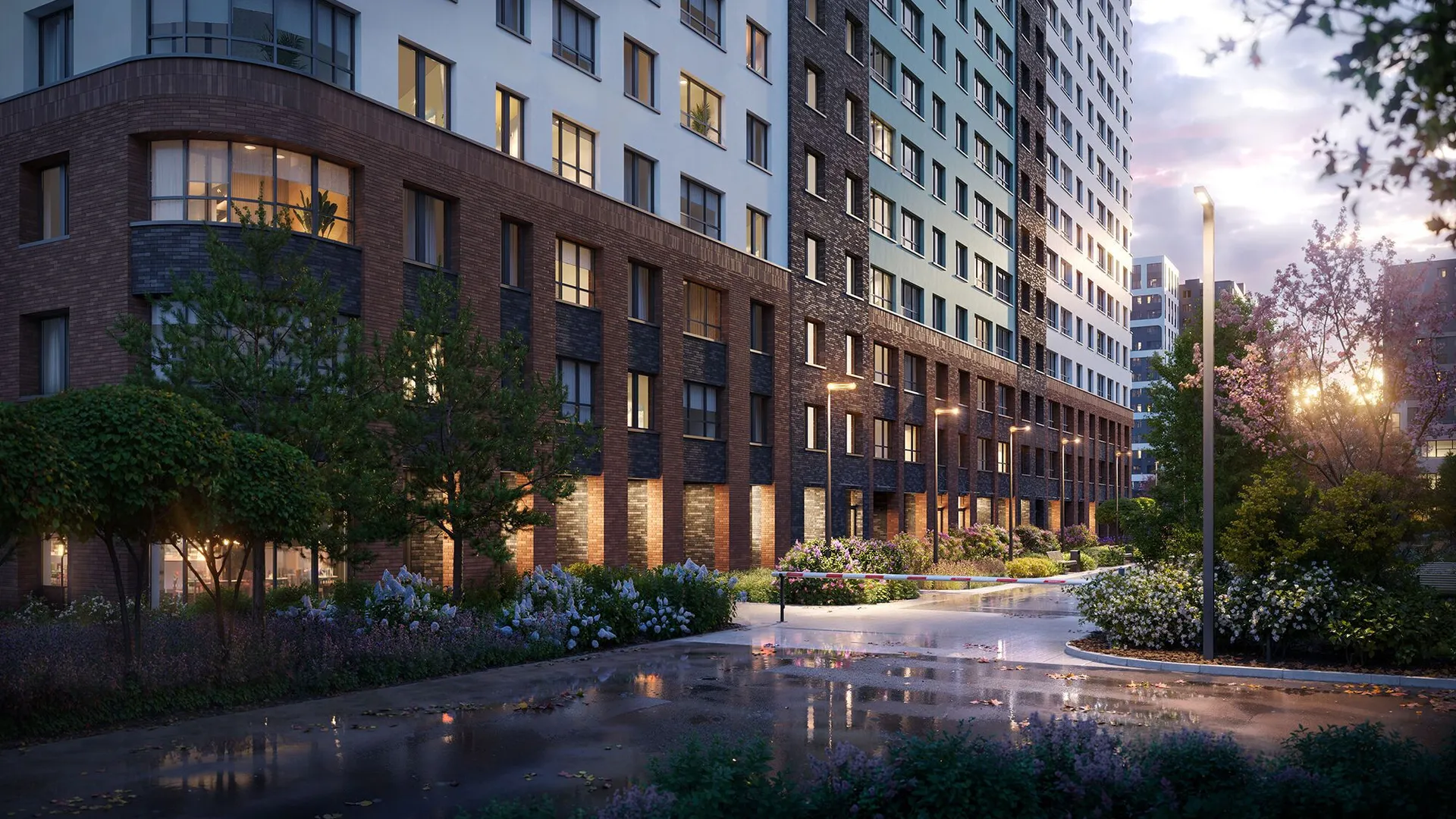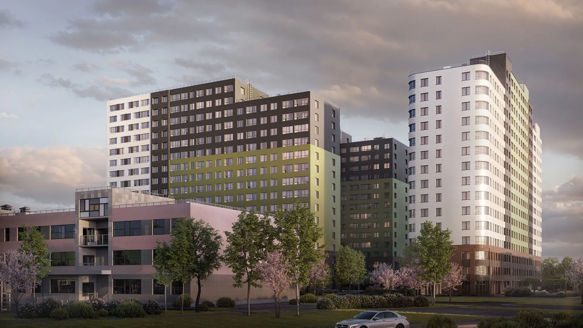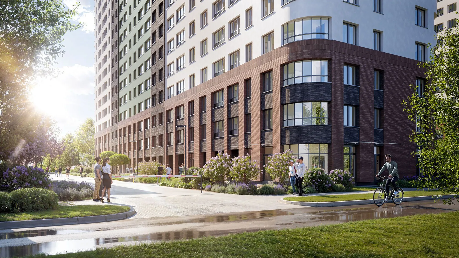 Архитектурное решение сочетает бетонную плитку, имитирующую кирпичную кладку на первых этажах, и декоративную штукатурку светлых оттенков на верхних уровнях. Скругленные углы зданий и разноуровневые фасады формируют узнаваемый облик квартала. Входные группы оформлены единообразно: просторные лобби декорированы натуральными материалами, а центральным элементом выступают световые колонны с флоральными узорами. Подъезды оснащены бесшумными энергоэффективными лифтами.