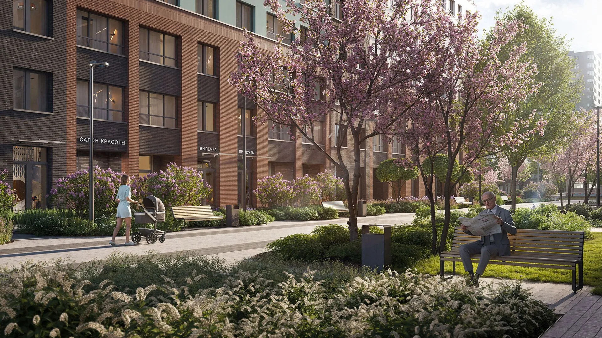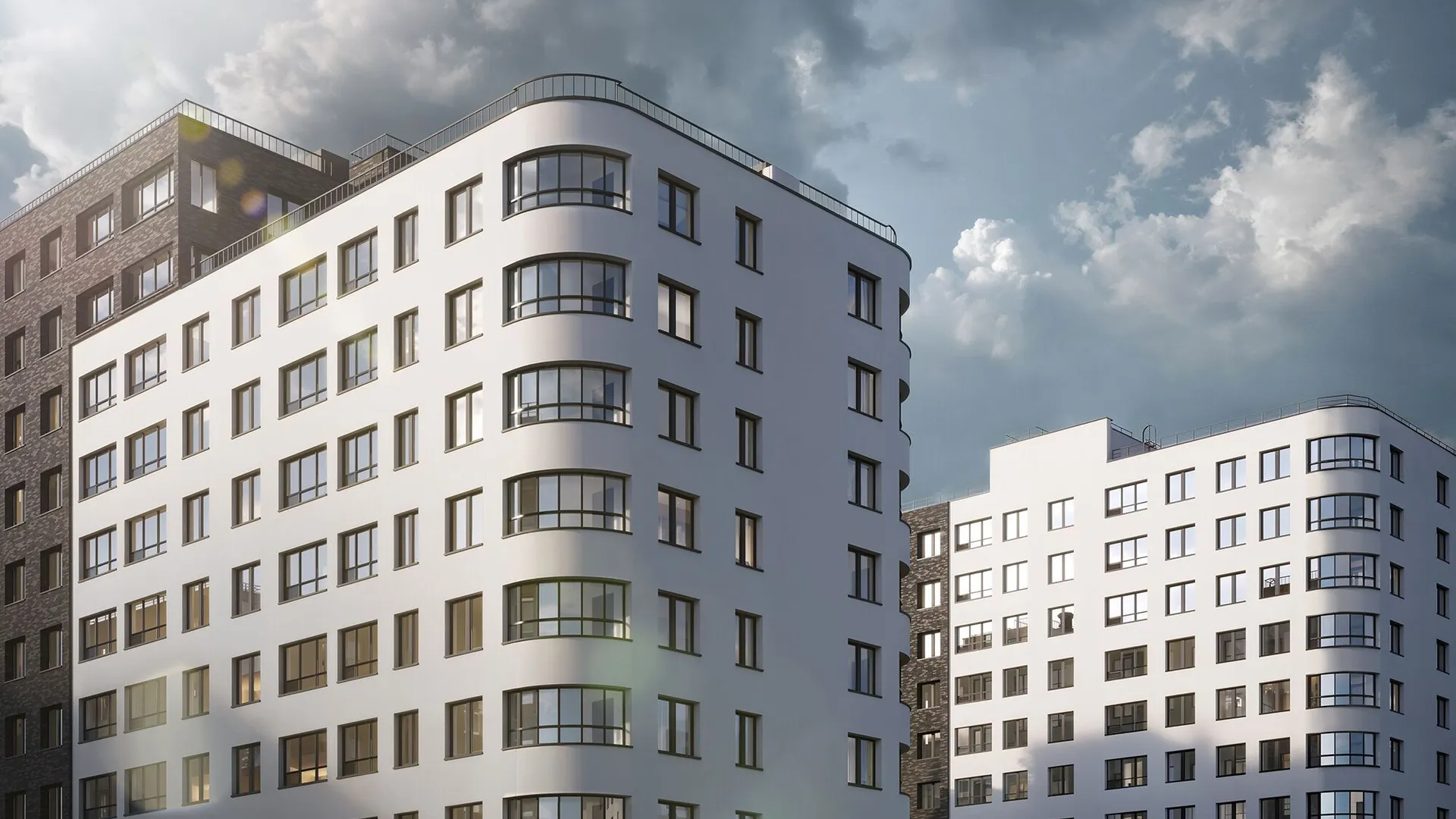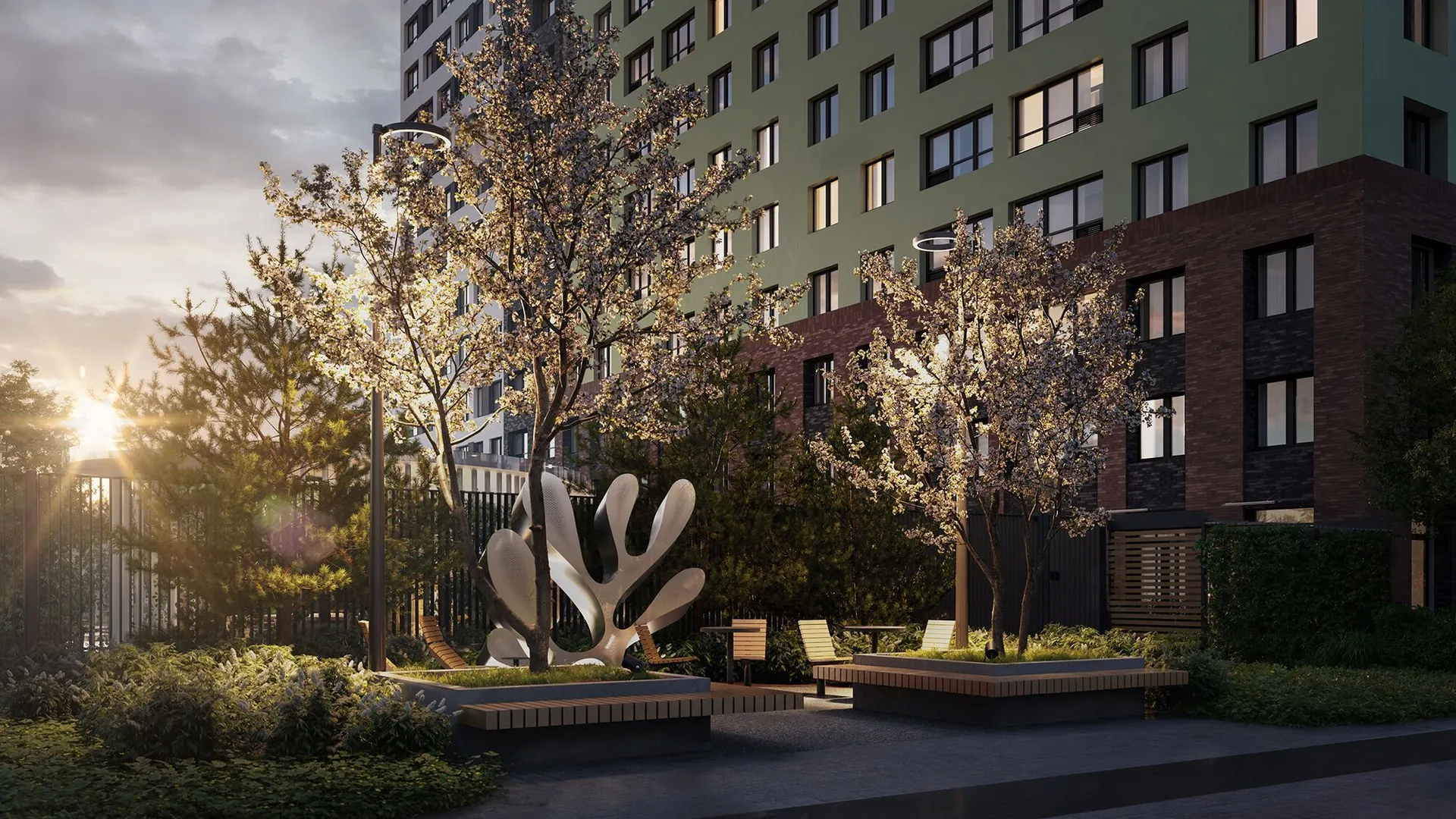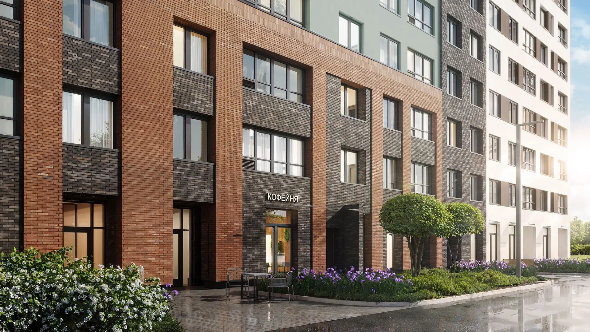 Архитектурное решение сочетает бетонную плитку, имитирующую кирпичную кладку на первых этажах, и декоративную штукатурку светлых оттенков на верхних уровнях. Скругленные углы зданий и разноуровневые фасады формируют узнаваемый облик квартала. Входные группы оформлены единообразно: просторные лобби декорированы натуральными материалами, а центральным элементом выступают световые колонны с флоральными узорами. Подъезды оснащены бесшумными энергоэффективными лифтами.