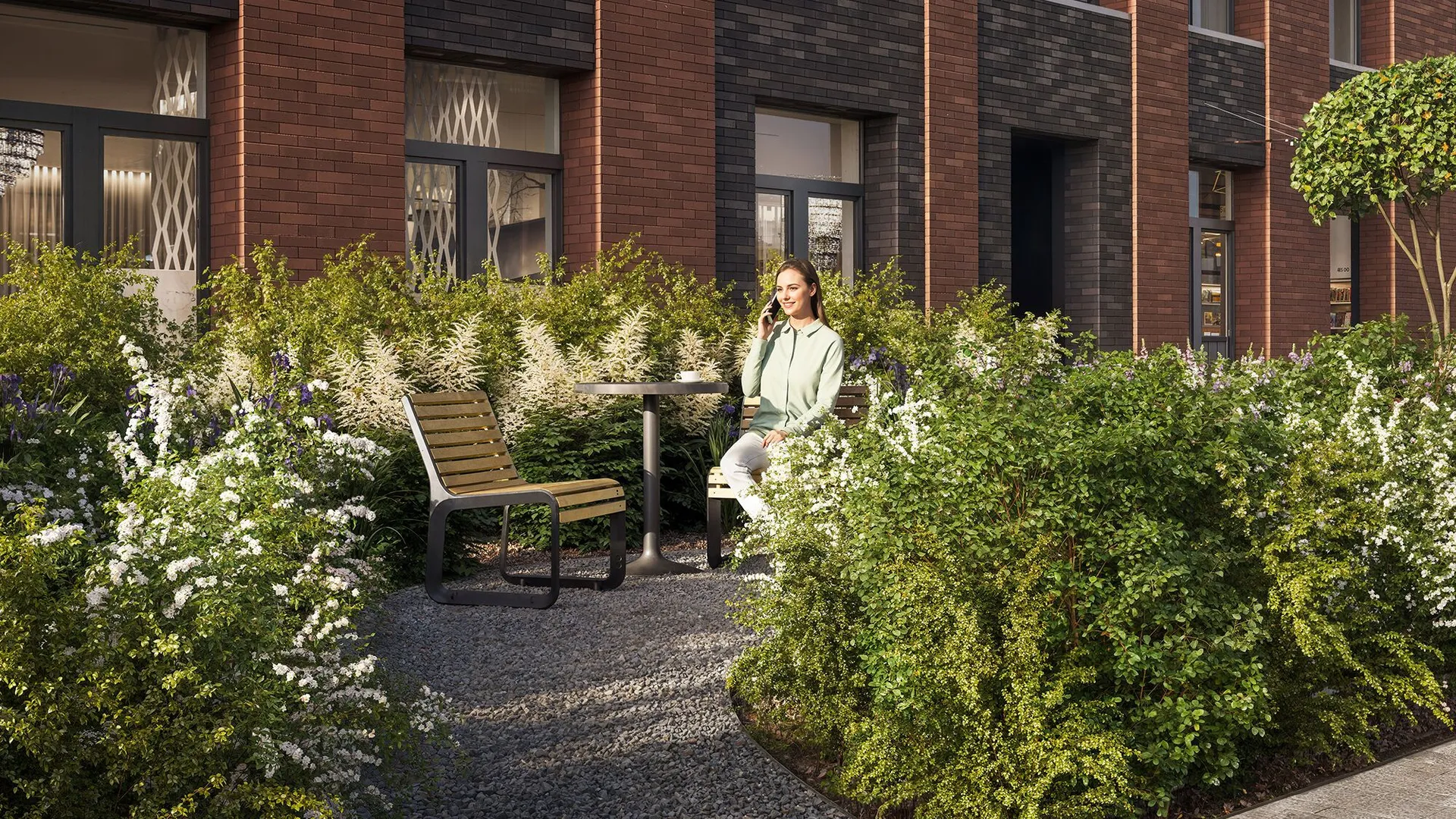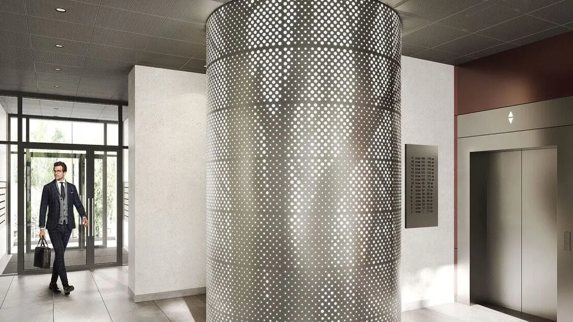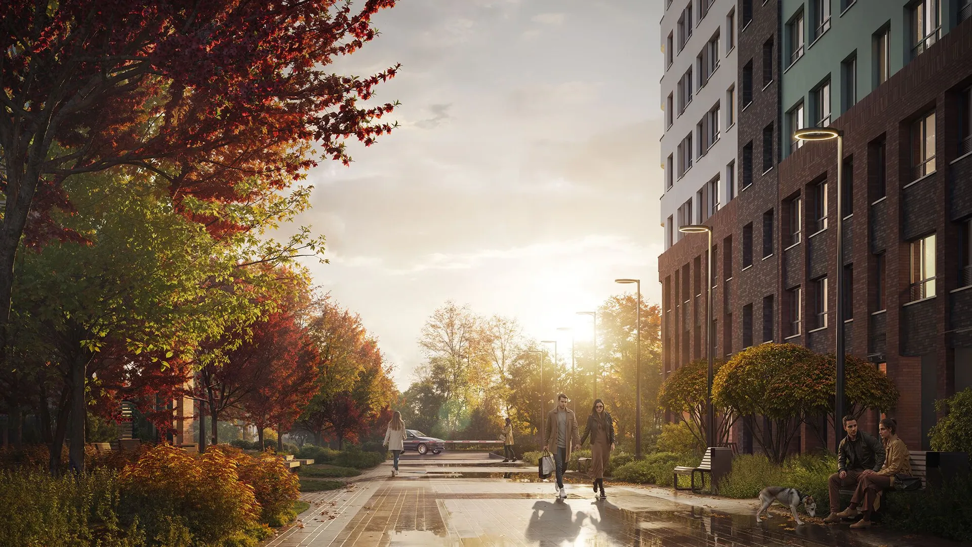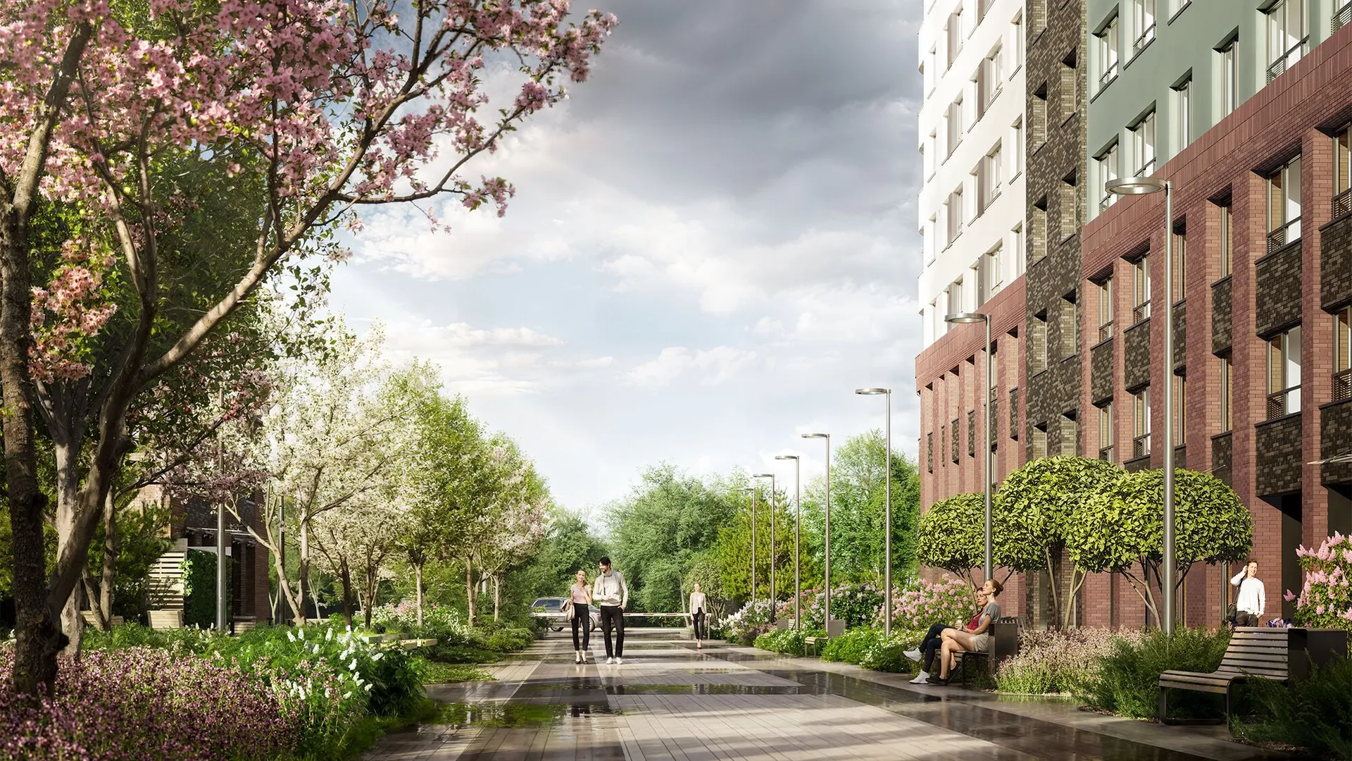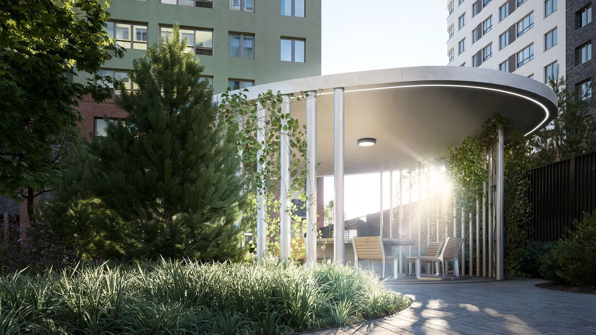 Архитектурное решение сочетает бетонную плитку, имитирующую кирпичную кладку на первых этажах, и декоративную штукатурку светлых оттенков на верхних уровнях. Скругленные углы зданий и разноуровневые фасады формируют узнаваемый облик квартала. Входные группы оформлены единообразно: просторные лобби декорированы натуральными материалами, а центральным элементом выступают световые колонны с флоральными узорами. Подъезды оснащены бесшумными энергоэффективными лифтами.
