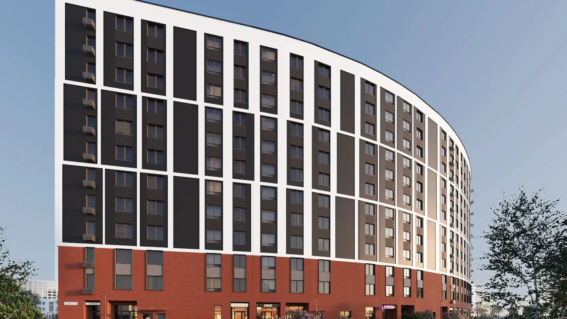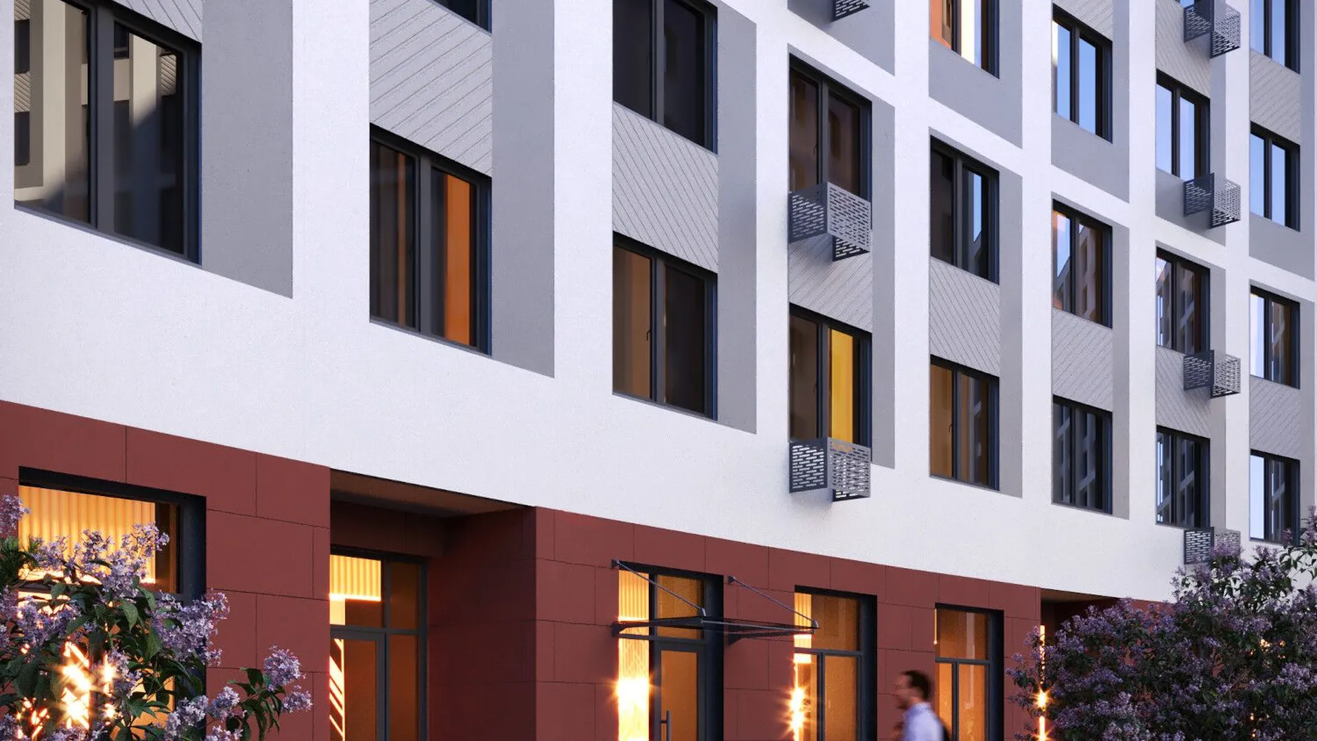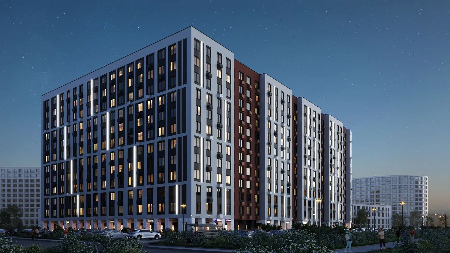 Первая очередь представляет собой 12‑этажное здание, разделённое на 9 секций с индивидуальными входными группами. Некоторые парадные выполнены сквозными — с выходами как во двор, так и на улицу. Фасады решены в современном сдержанном стиле: глубокий кирпичный оттенок сочетается с белым и дополняется тёмно‑серыми акцентами. В вечернее время архитектурный облик подчёркивает дизайнерская подсветка в виде вертикальных белых линий.