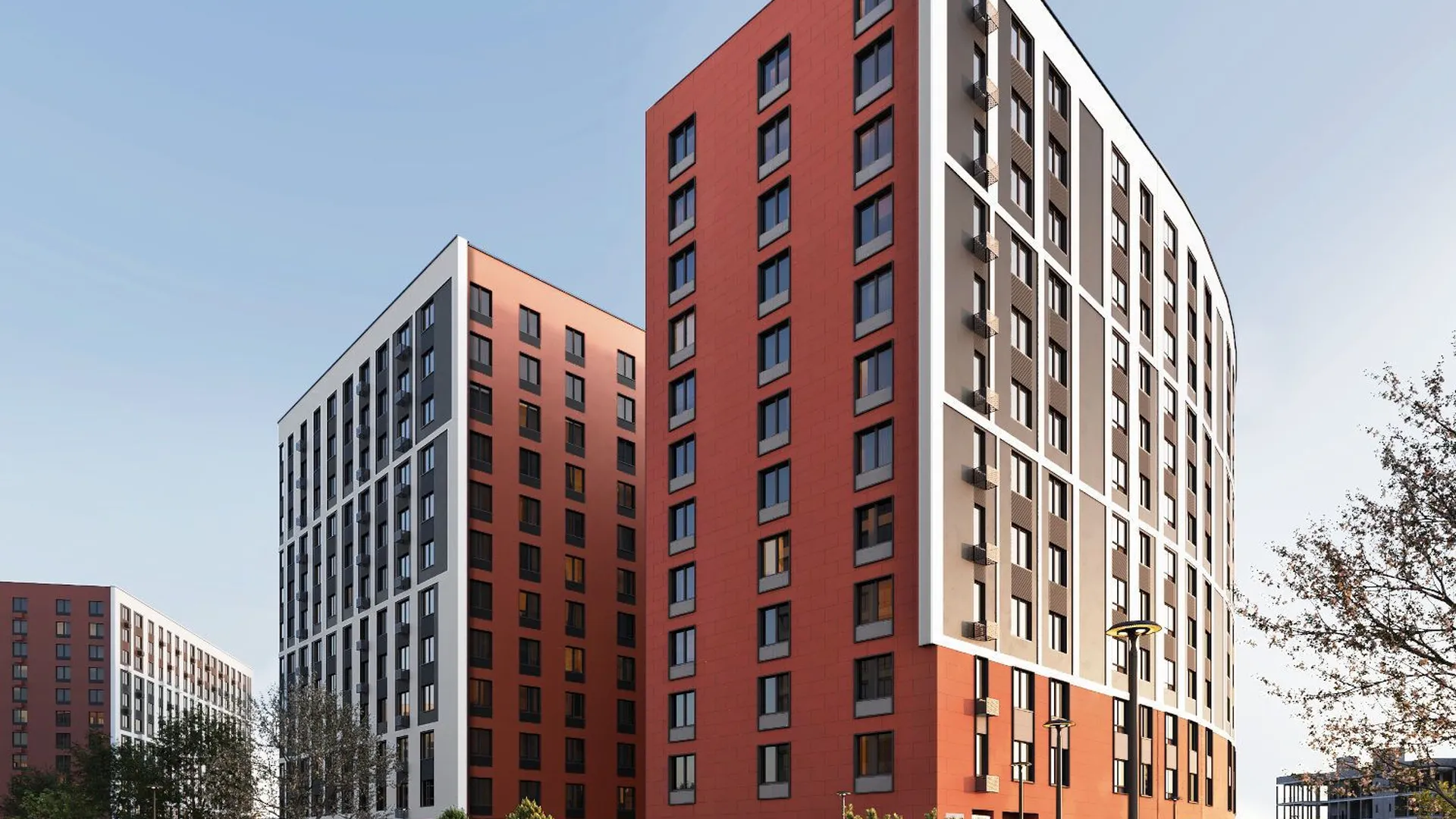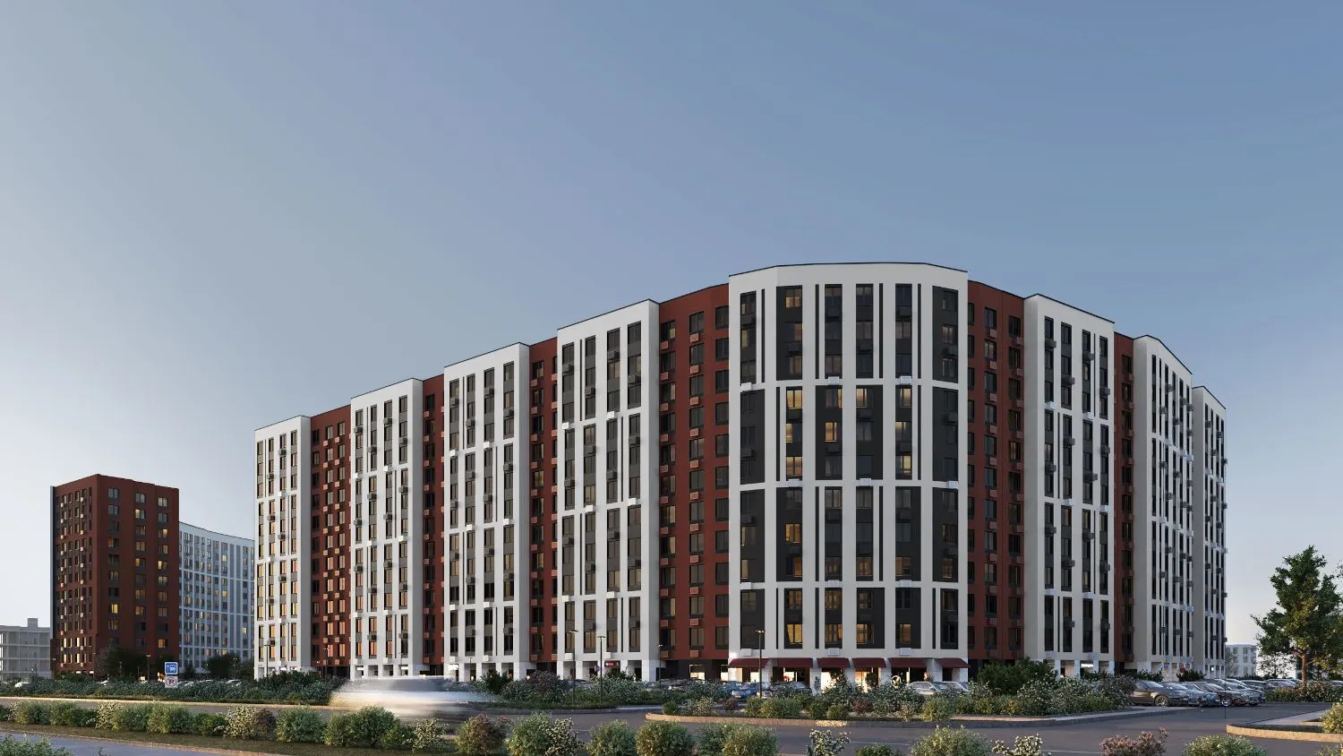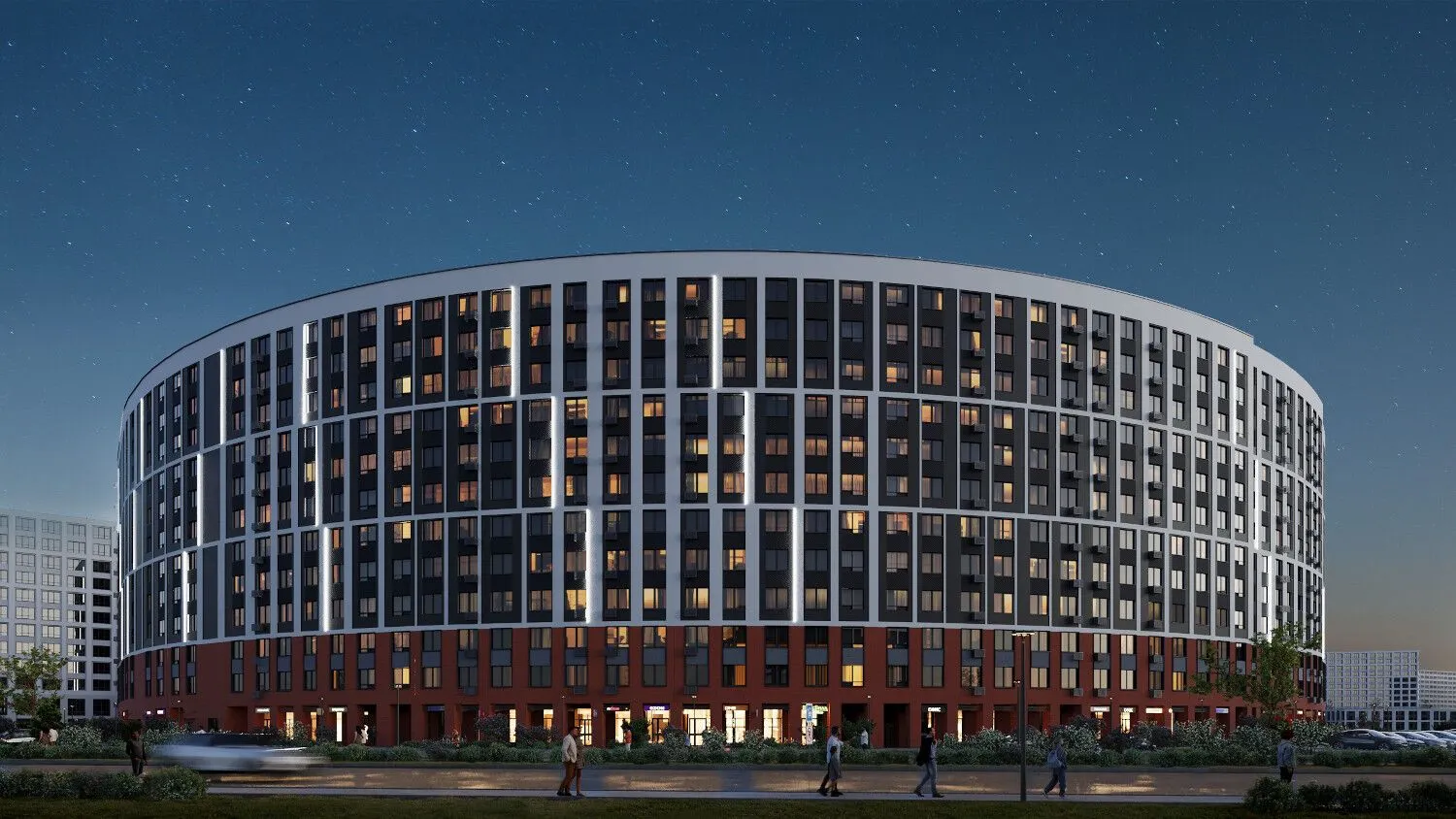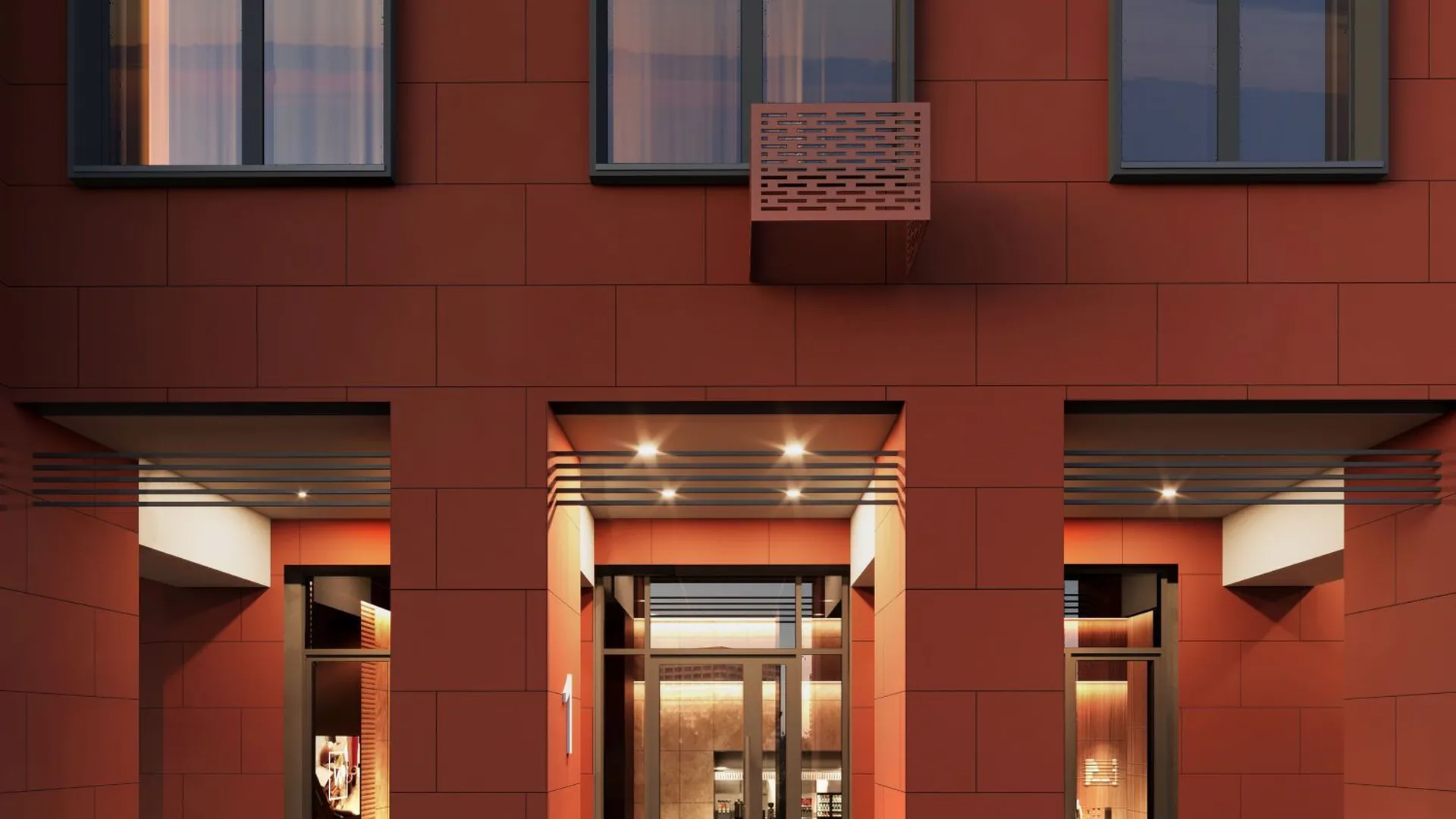 Первая очередь представляет собой 12‑этажное здание, разделённое на 9 секций с индивидуальными входными группами. Некоторые парадные выполнены сквозными — с выходами как во двор, так и на улицу. Фасады решены в современном сдержанном стиле: глубокий кирпичный оттенок сочетается с белым и дополняется тёмно‑серыми акцентами. В вечернее время архитектурный облик подчёркивает дизайнерская подсветка в виде вертикальных белых линий.