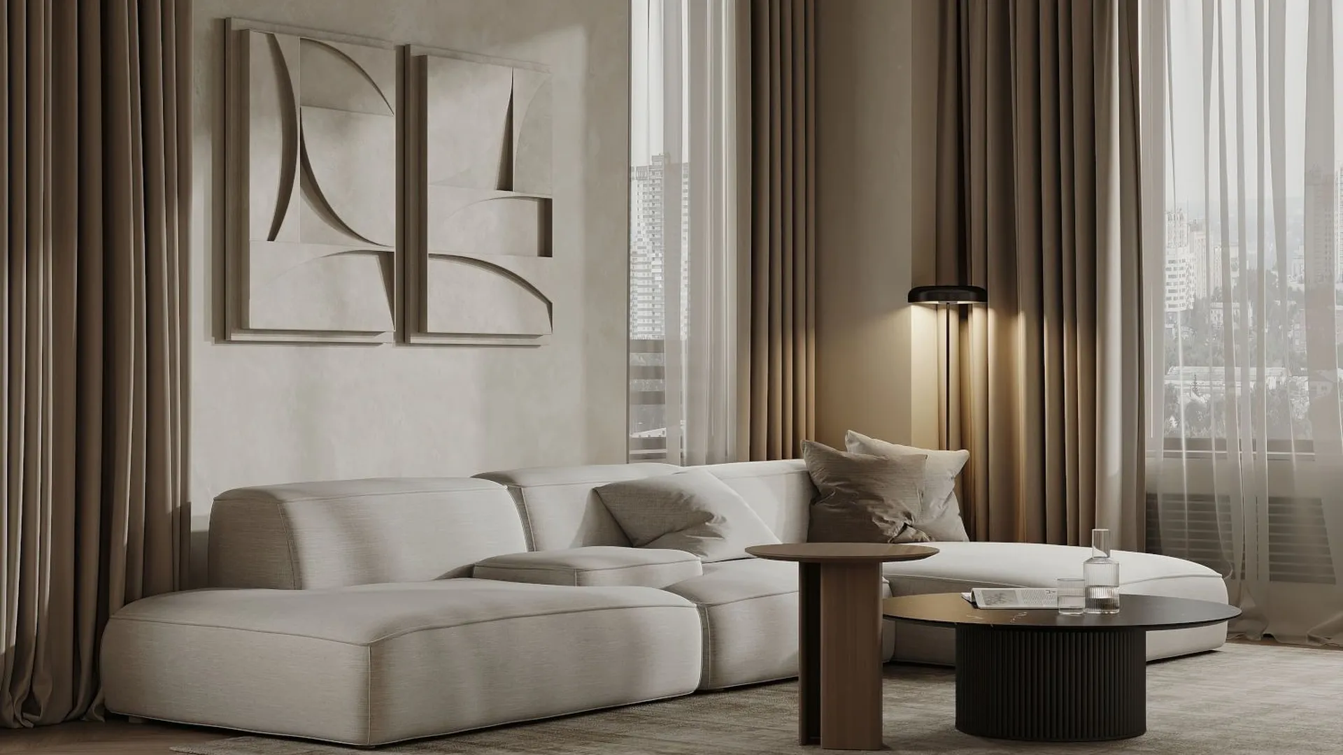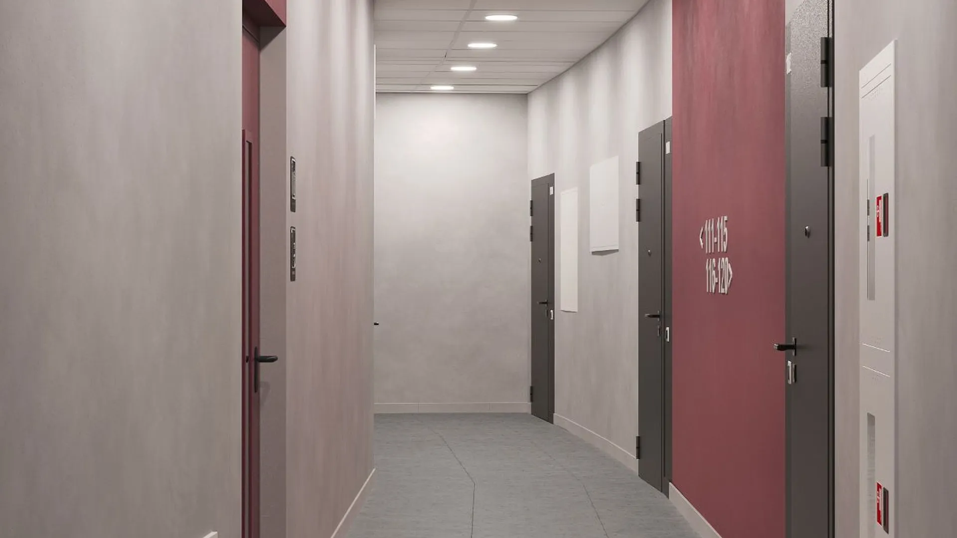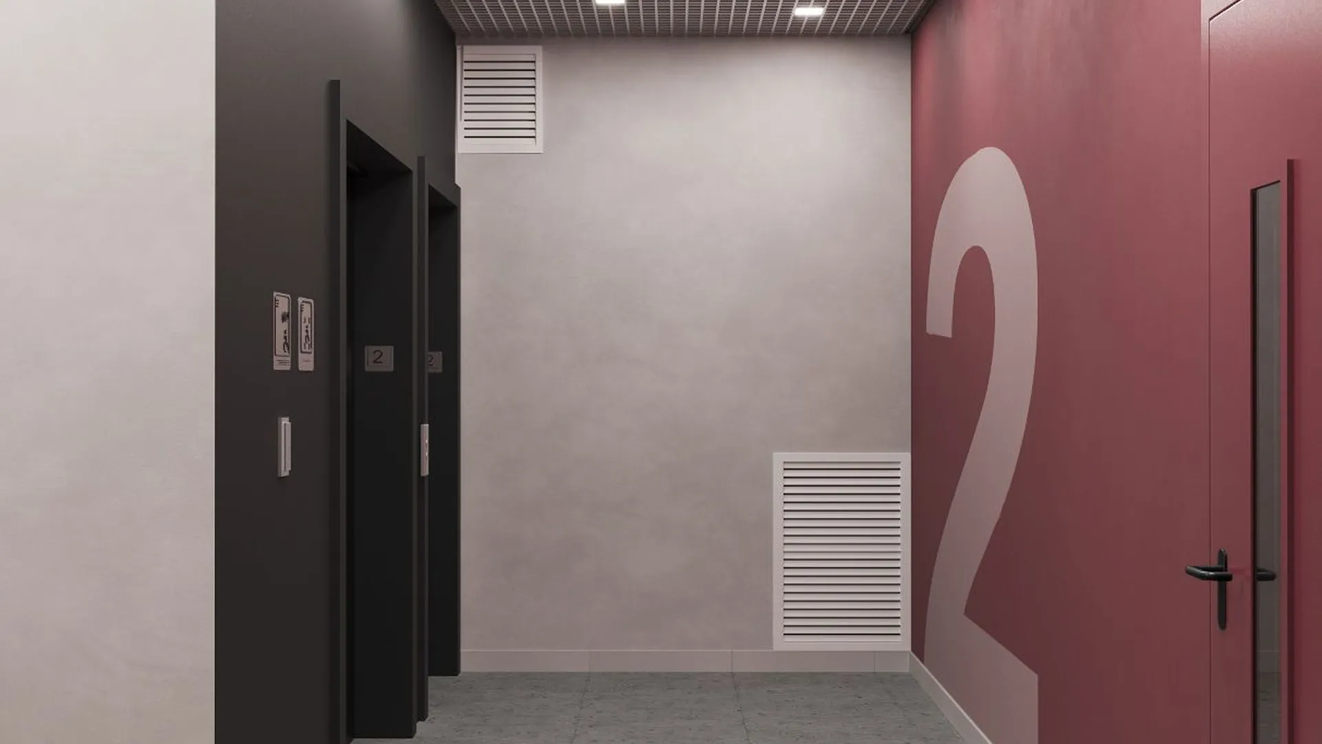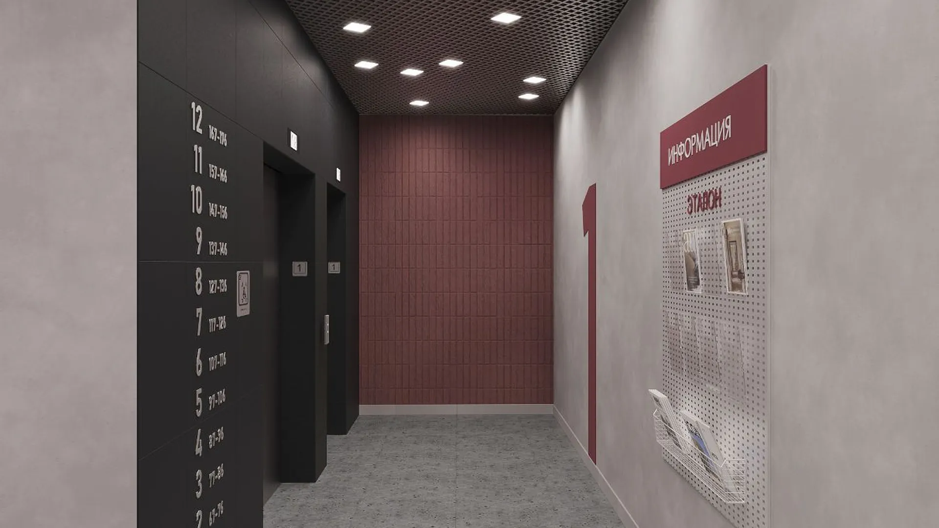 Места общего пользования оформлены по индивидуальному дизайн‑проекту. Просторные лобби выдержаны в минималистичном стиле: в отделке использованы керамогранит, декоративные элементы и акцентное освещение. Цветовая гамма включает бордовые, чёрные и светло‑серые оттенки.