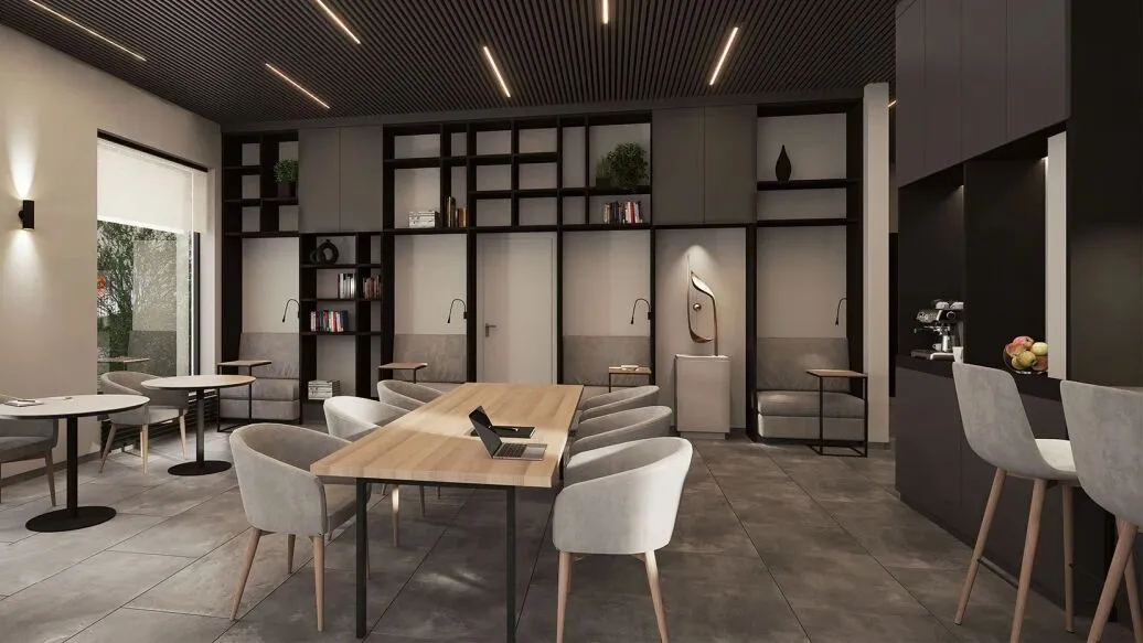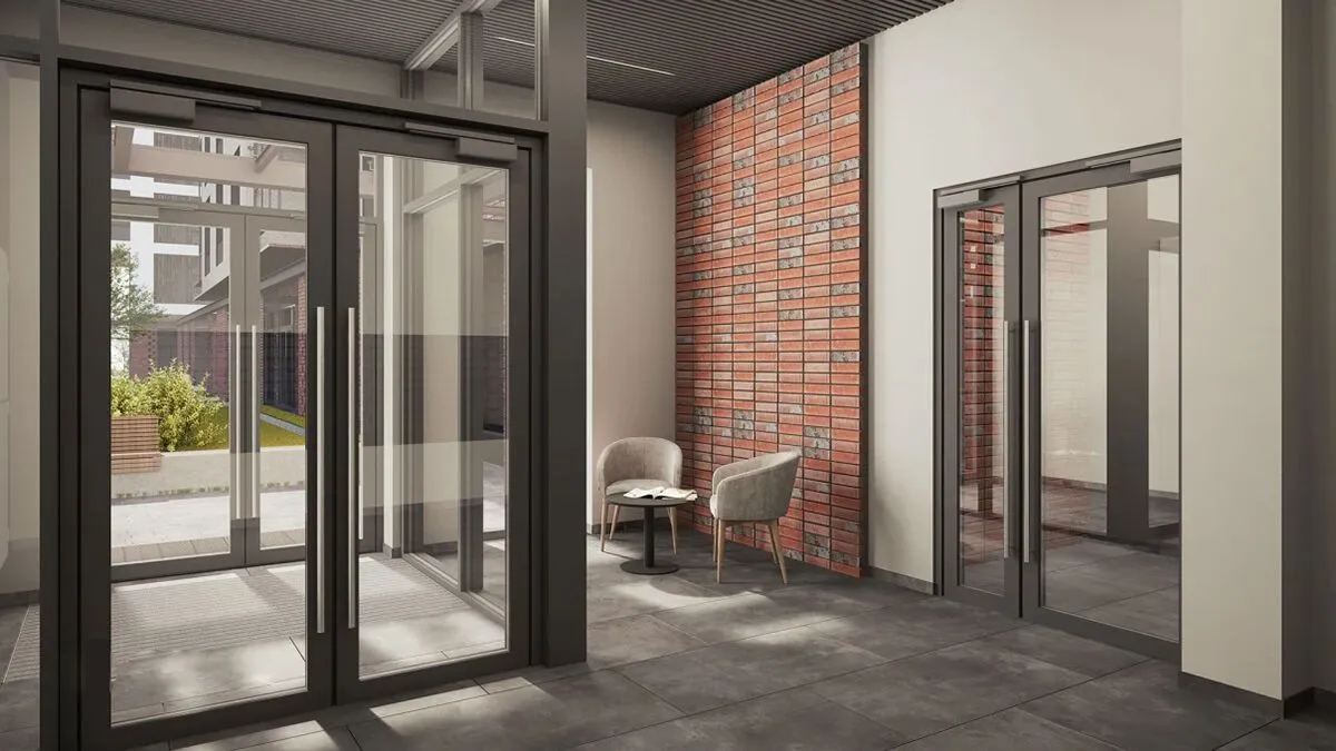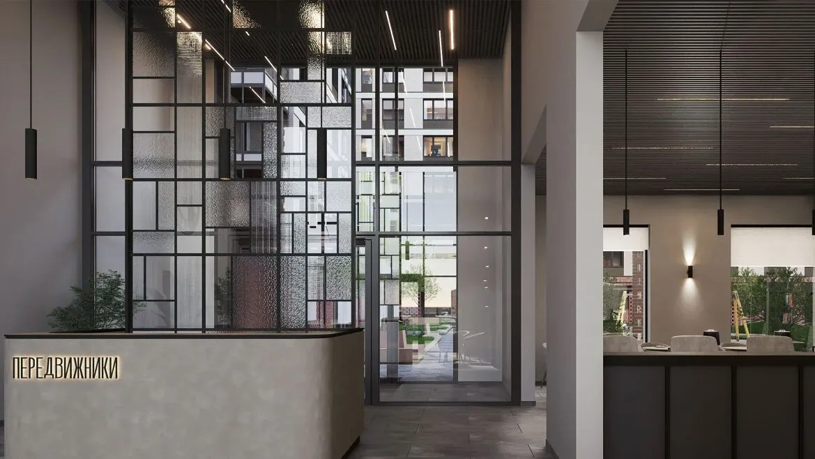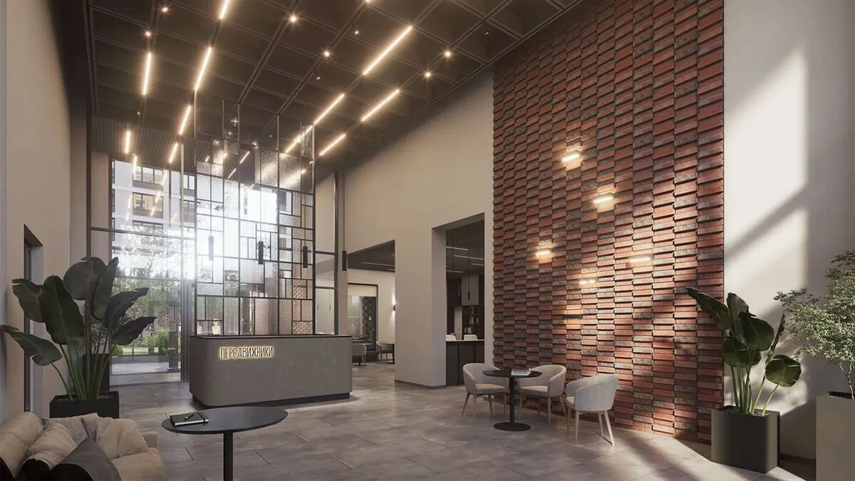 Лобби комплекса — просторная входная группа площадью 135 м² с потолками высотой 6 м. В интерьере предусмотрены ресепшен, лаундж-зона, коворкинг с Wi-Fi и кофе-пойнт. Ключевой элемент дизайна — динамическая скульптура «Сложный баланс» архитектора Владислава Бек-Булатова.