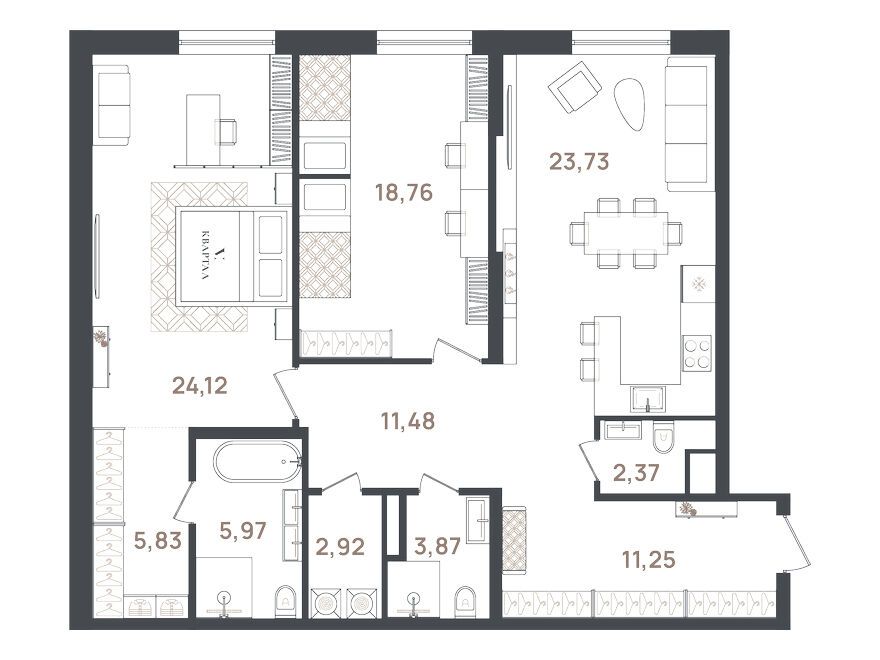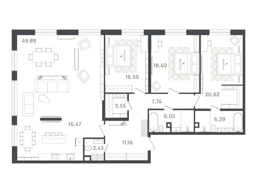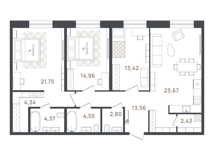 Площадь квартир варьируется от 54 до 160 м. В ассортименте — планировки с 1–3 спальнями, есть варианты с двумя санузлами, постирочной и французскими балконами. Высота потолков составляет от 3 до 3,8 м. Квартиры сдаются без отделки.