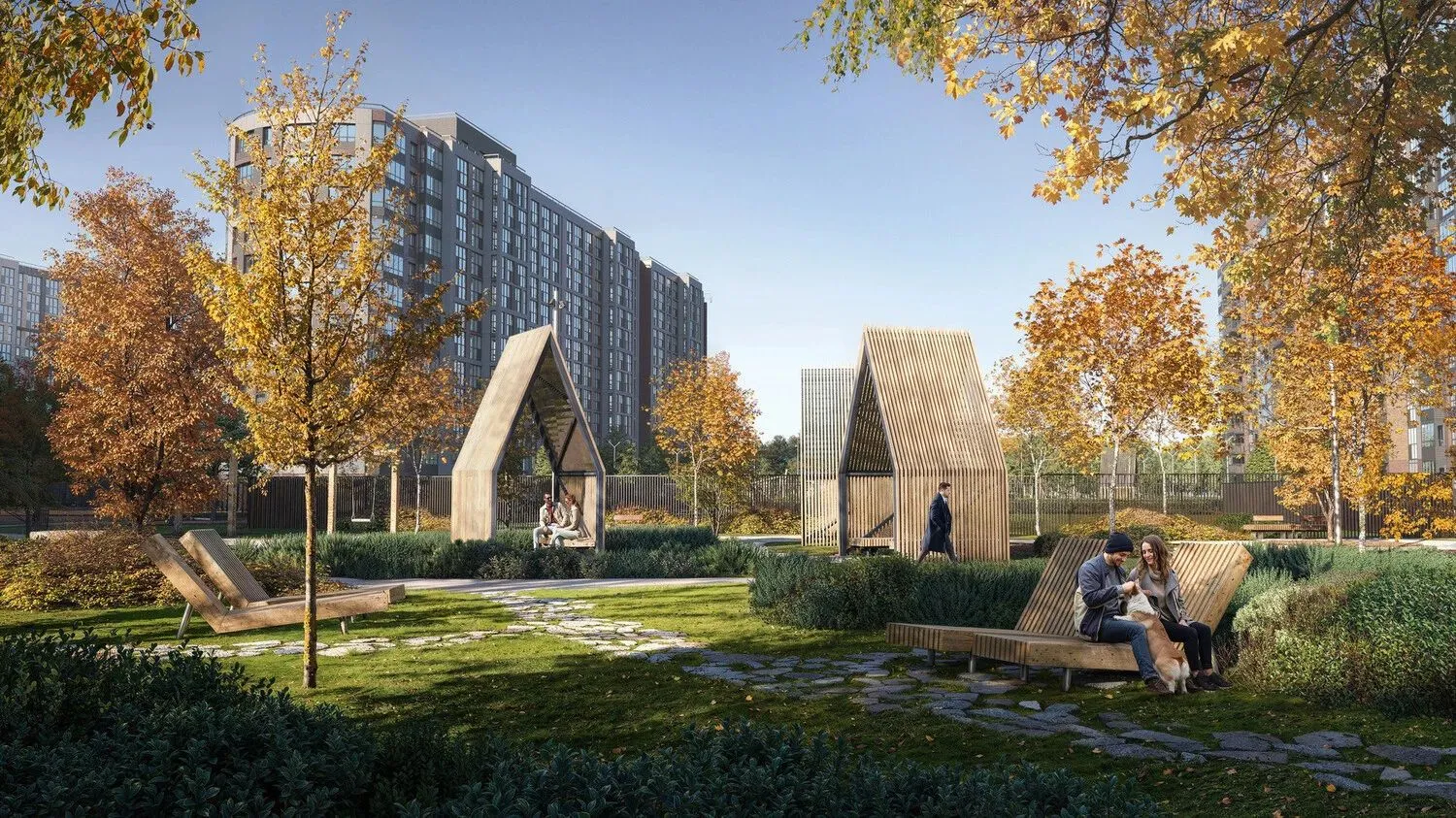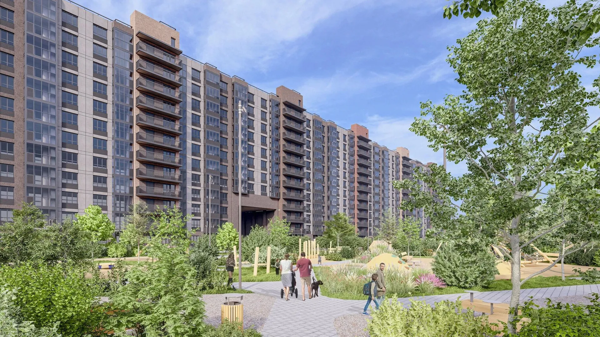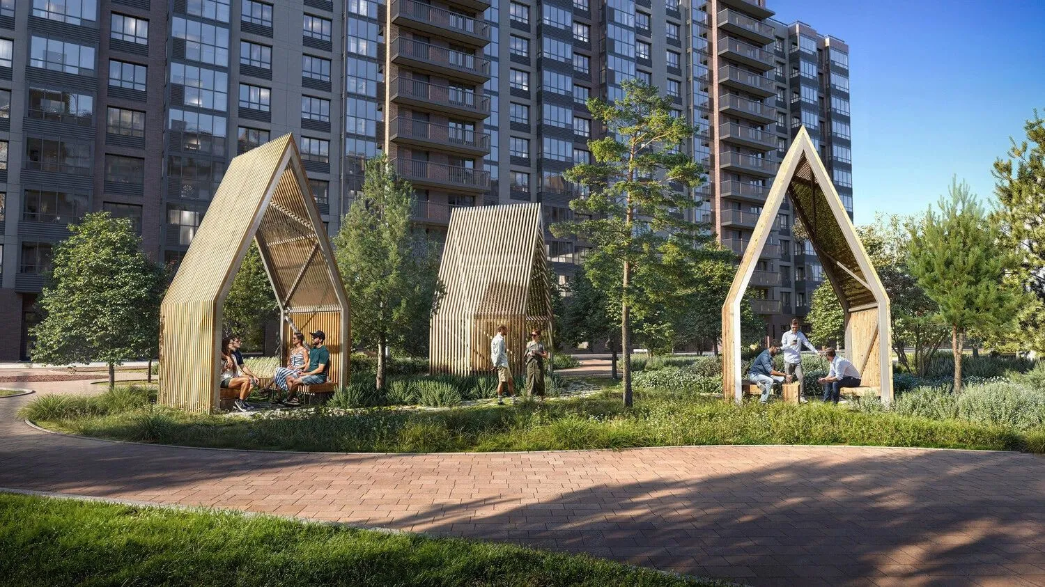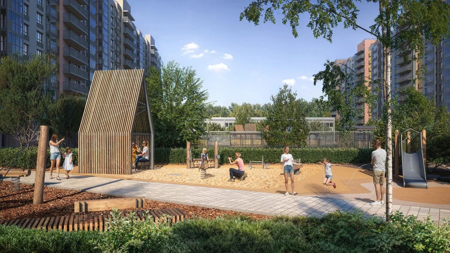 Территория комплекса благоустроена с учётом потребностей разных возрастных групп. Здесь оборудованы детские игровые зоны с сенсорными и тактильными элементами, батуты, велодорожки и лазательные комплексы. Для взрослых созданы воркаут‑зоны с уличными тренажёрами, площадка для йоги, зоны отдыха с гамаками и шезлонгами, а также прогулочные маршруты. Дворы оформлены в стиле северных ландшафтов: высажены хвойные и лиственные деревья, кустарники.