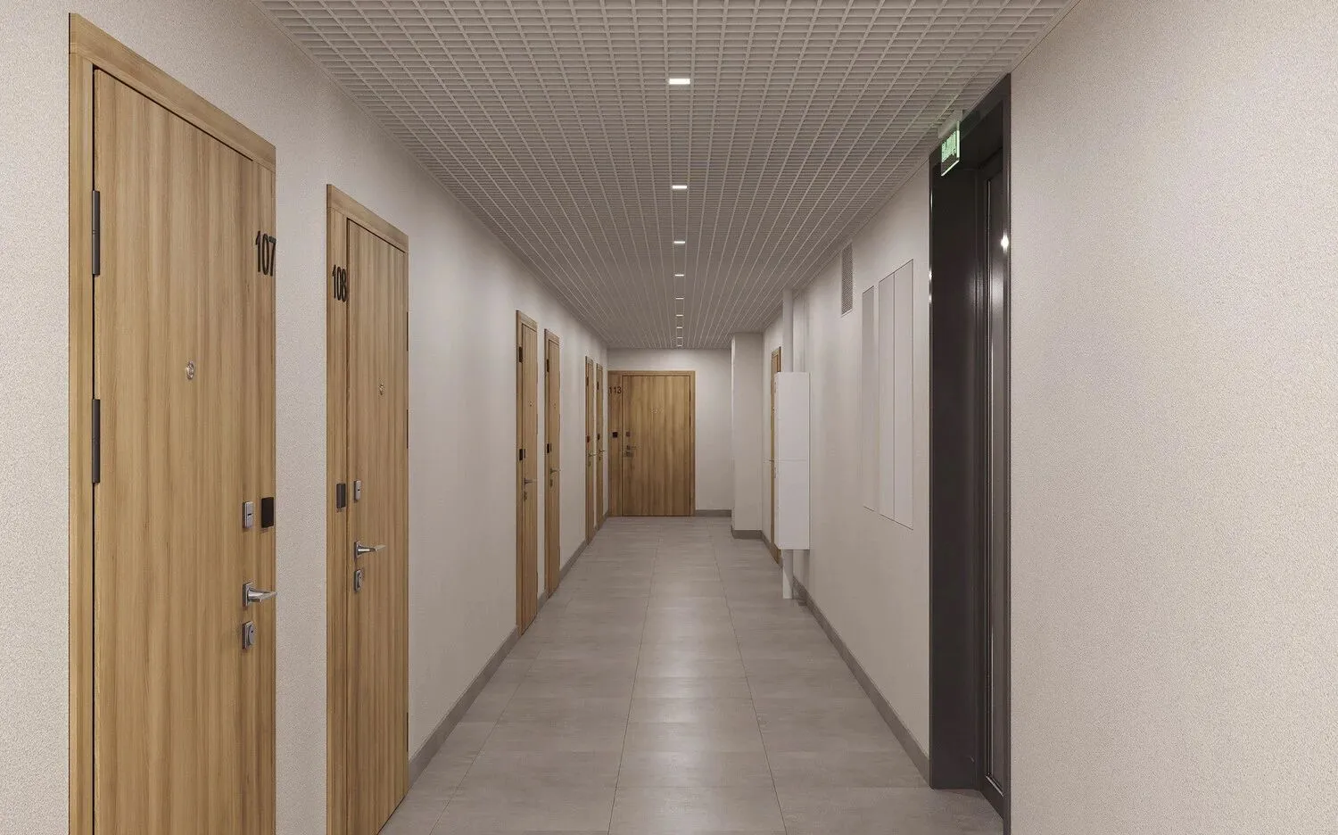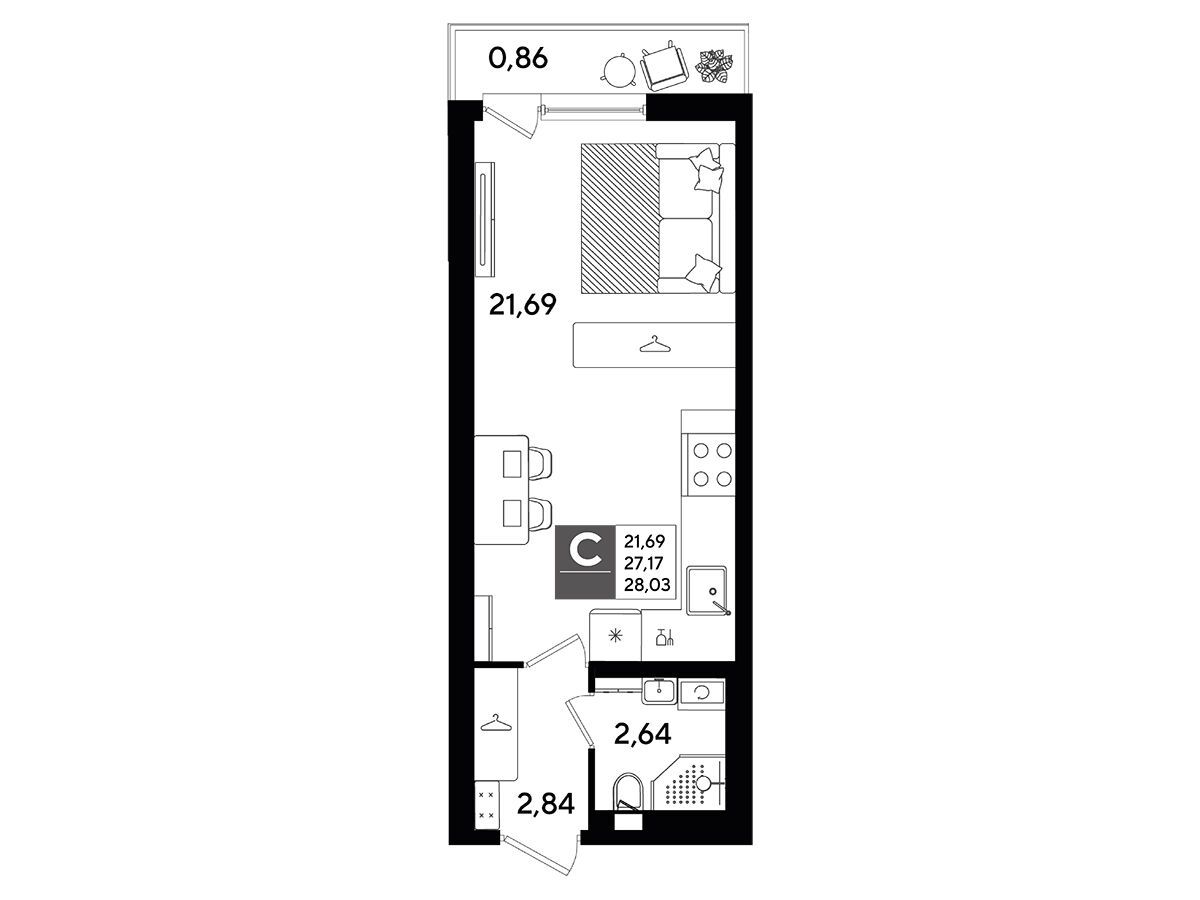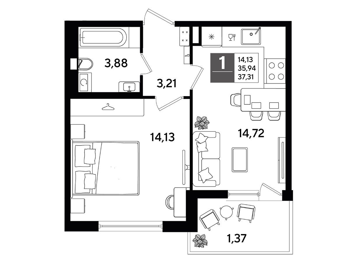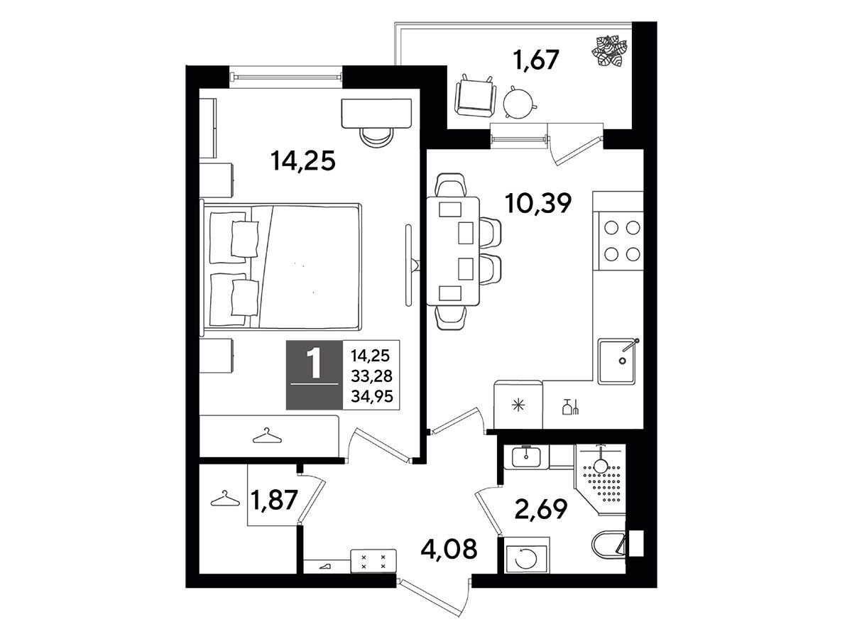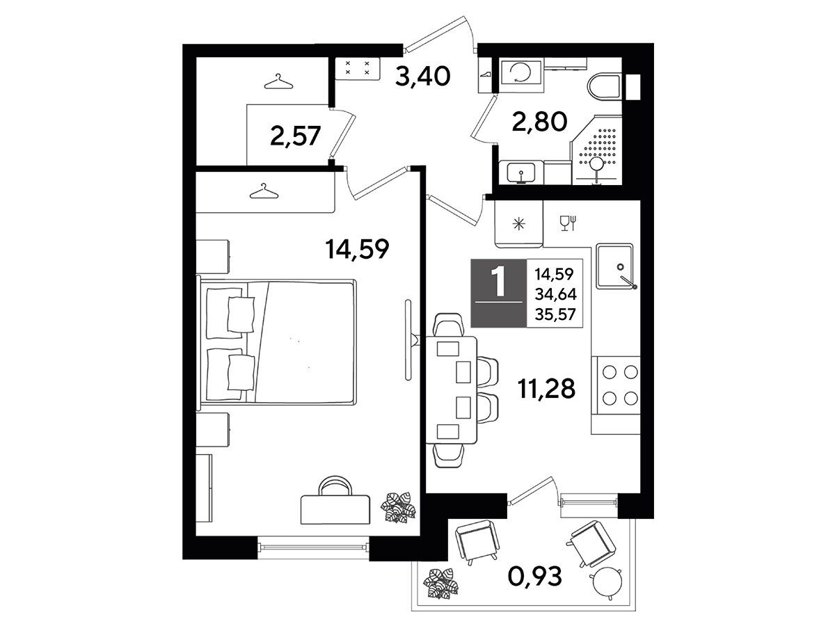 В каждой квартире предусмотрены балкон и просторная кухня‑гостиная. Также спроектированы ниши или отдельные помещения для хранения гардероба, что повышает функциональность жилого пространства.