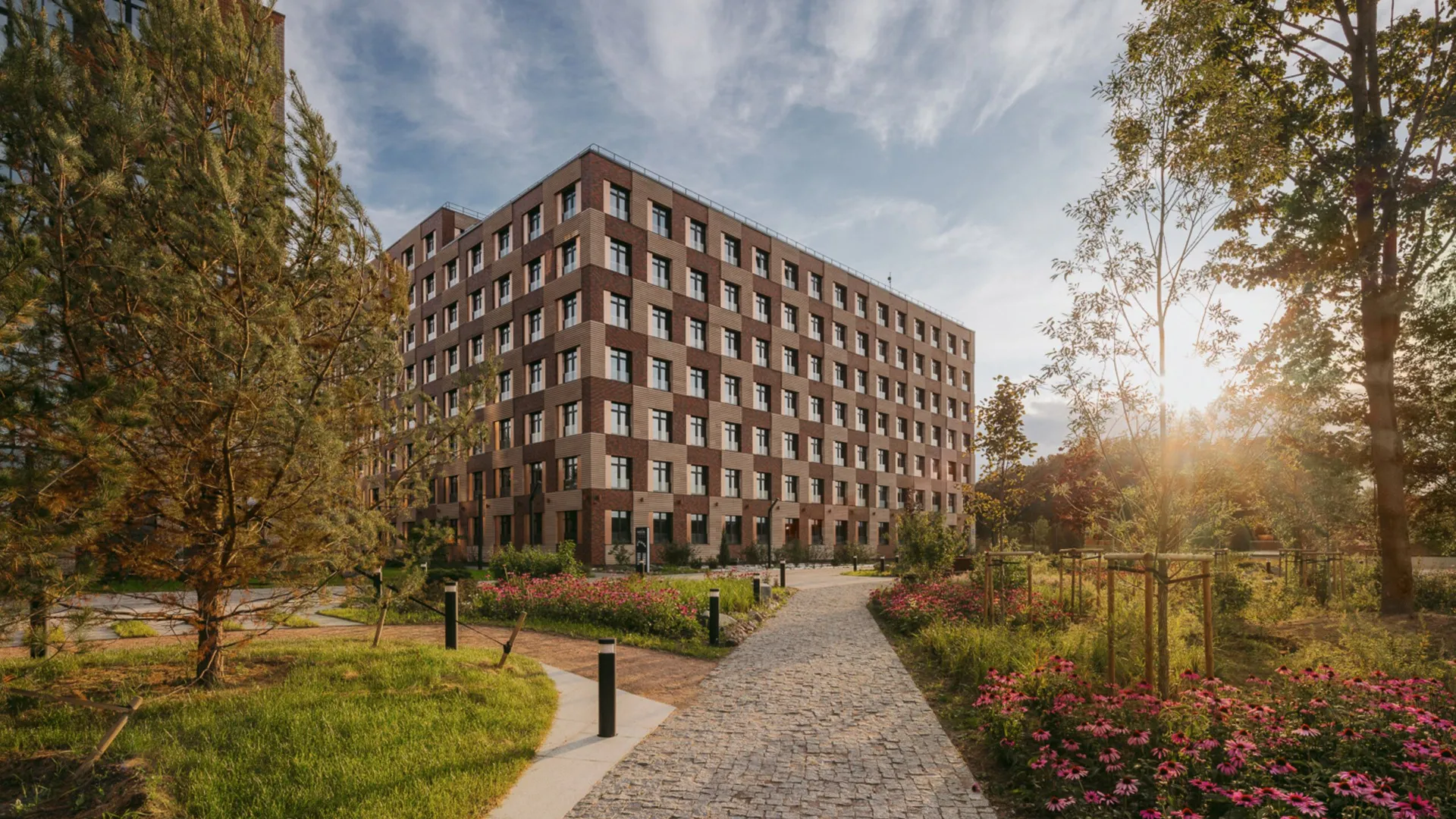 Инфраструктура комплекса продумана для комфортной жизни. На территории обустроены многоуровневые паркинги и открытые гостевые парковки; в первой очереди построен пристроенный паркинг на 263 машино‑места. Дворы закрыты от автомобилей и благоустроены: здесь размещены детские и спортивные площадки, зоны отдыха с беседками и навесами, скамейки, а также беговые и велосипедные дорожки.
