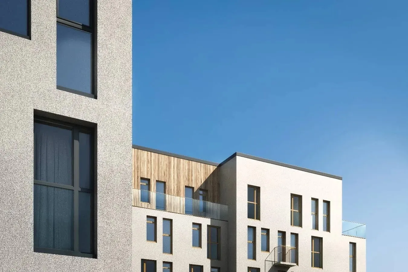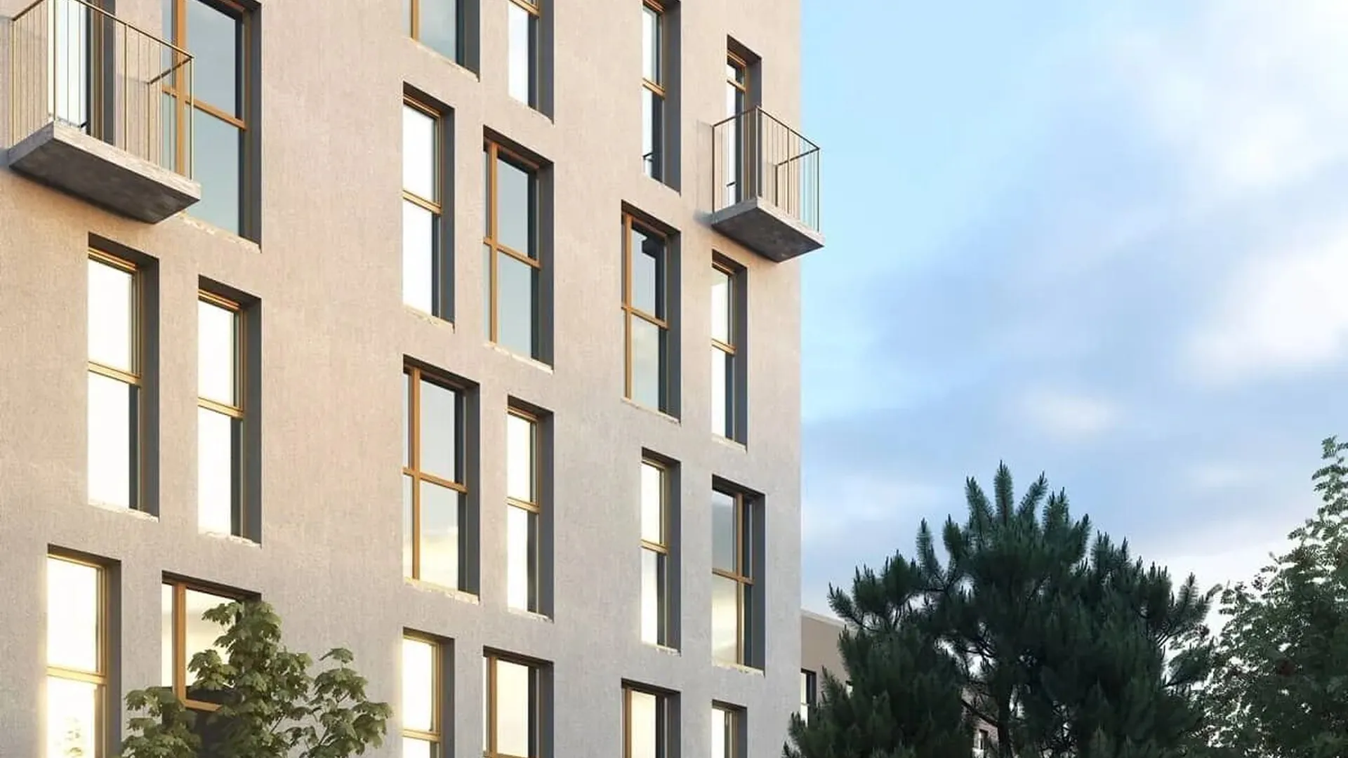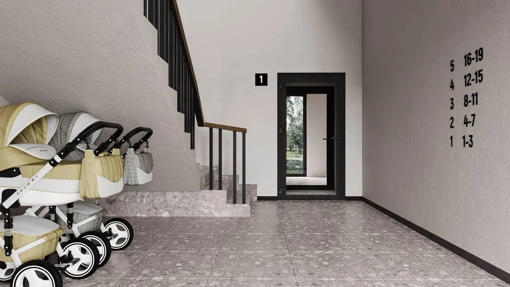 Первая очередь проекта включает два кирпично‑монолитных пятиэтажных корпуса: основной дом на 8 подъездов и отдельный дом на 1 подъезд. Здания возводятся с применением монолитных железобетонных перекрытий и наружных стен из блоков с утеплителем. Фасады оформлены в природной палитре — серых, песочных и древесных оттенках — с использованием современных материалов. Входные группы выделяются панорамным остеклением и отделкой в нейтральных тонах, органично переходя в лобби, помещения для колясок и кладовые.