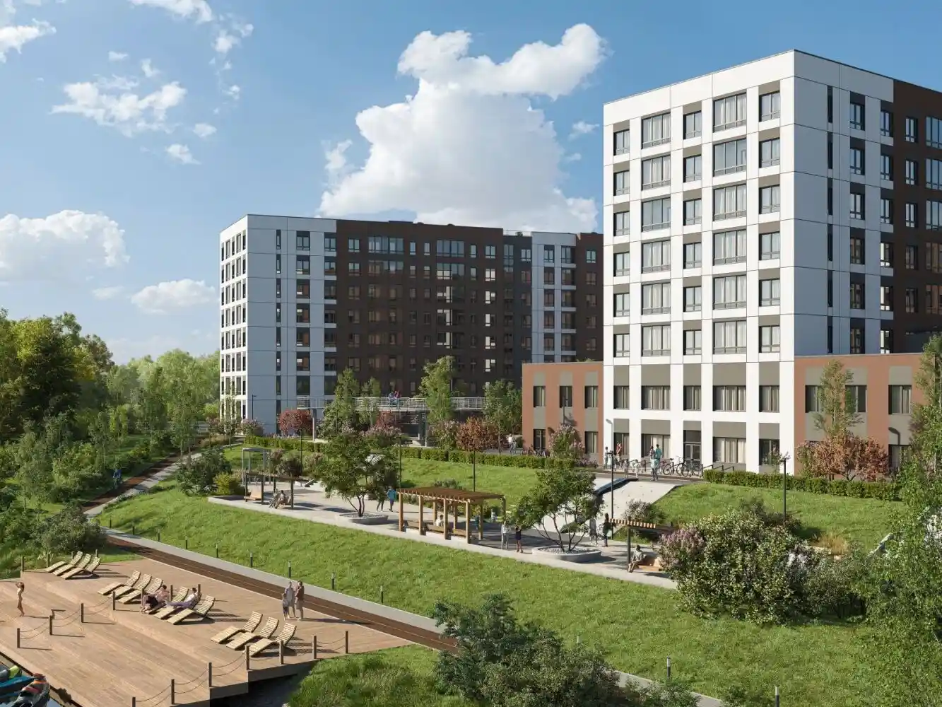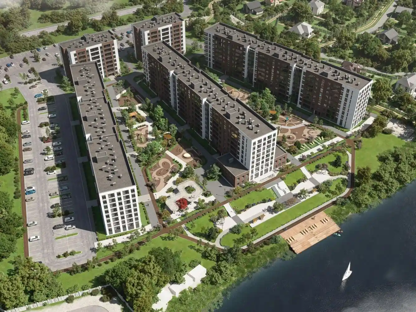 ЖК состоит из пяти монолитно-панельных корпусов высотой 8 этажей. В проекте представлены квартиры от студий (от 25,2 м²) до трёхкомнатных квартир (до 69,9 м²). Высота потолков — 2,7 м. Все квартиры сдаются с предчистовой отделкой White Box, которая включает выровненные стены, качественную стяжку пола, разводку электричества с установленными розетками и выключателями, радиаторы отопления и стеклопакеты. Сантехника, ламинат и межкомнатные двери в стандартную отделку не включены.