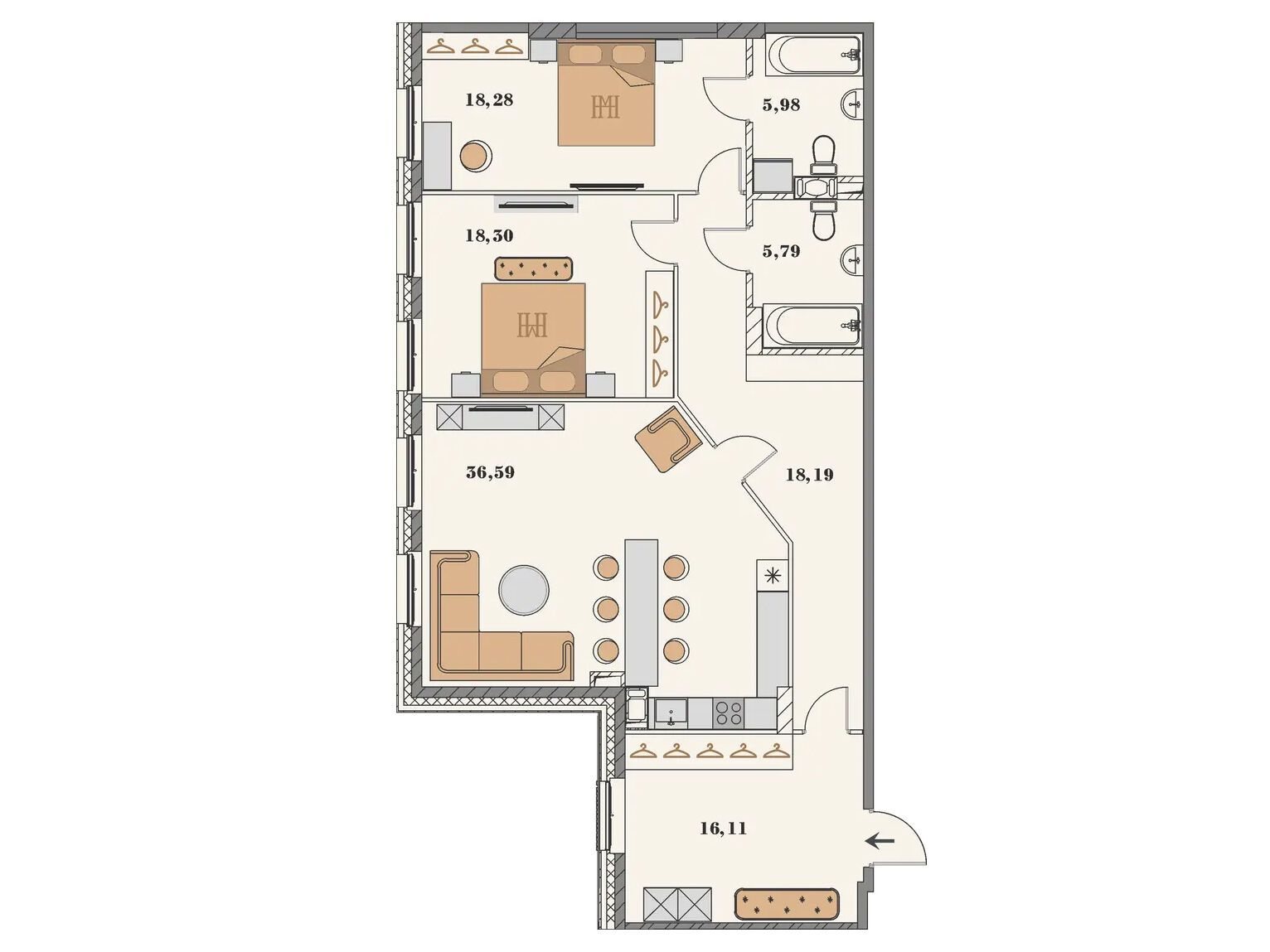 В доме 61 квартира со свободной планировкой. Площадь варьируется от 81,6 до 234,1 м. На последнем этаже расположены пентхаусы с видовыми террасами и панорамными видами. В каждой квартире предусмотрены два санузла и гардеробная комната, а высота потолков достигает 4 м.