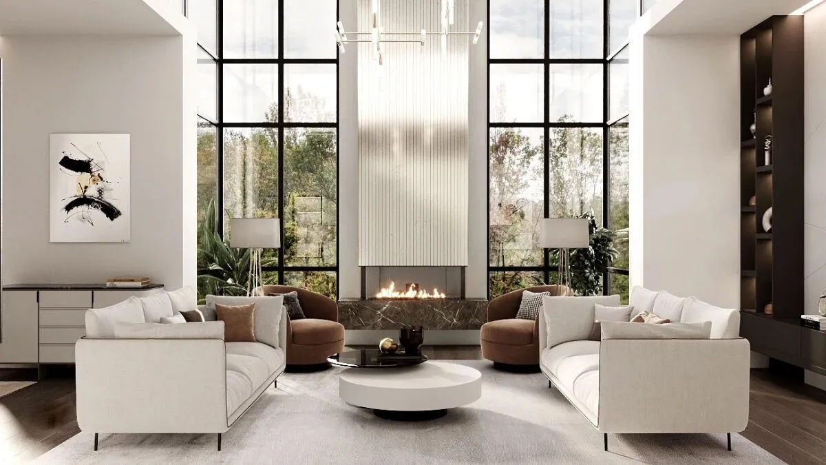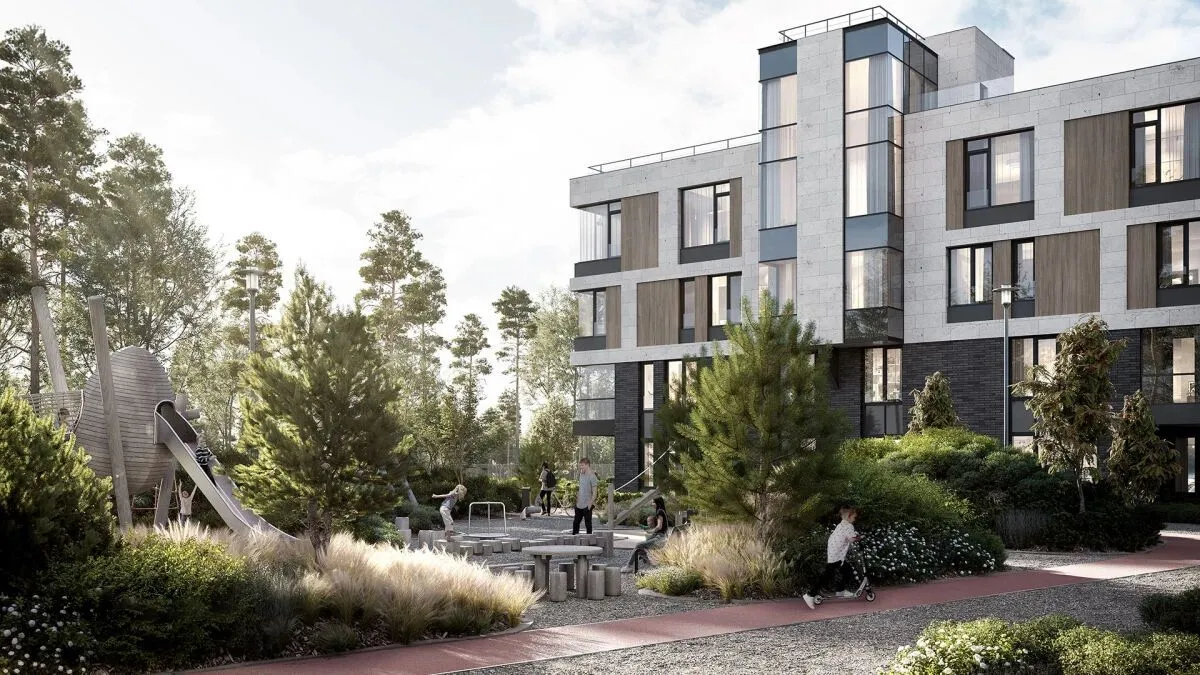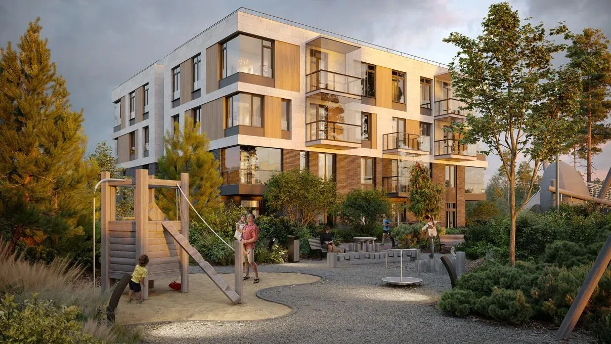 Архитектурное решение выполнено в скандинавском стиле. В оформлении активно использованы натуральные материалы — дерево и камень. Фасады оснащены большими алюминиевыми окнами с безрамным остеклением. В вечернее время декоративная подсветка подчёркивает архитектурные акценты, а также выделяет дорожки и клумбы.