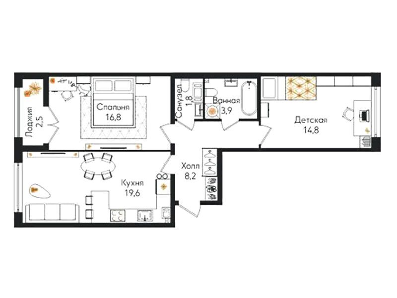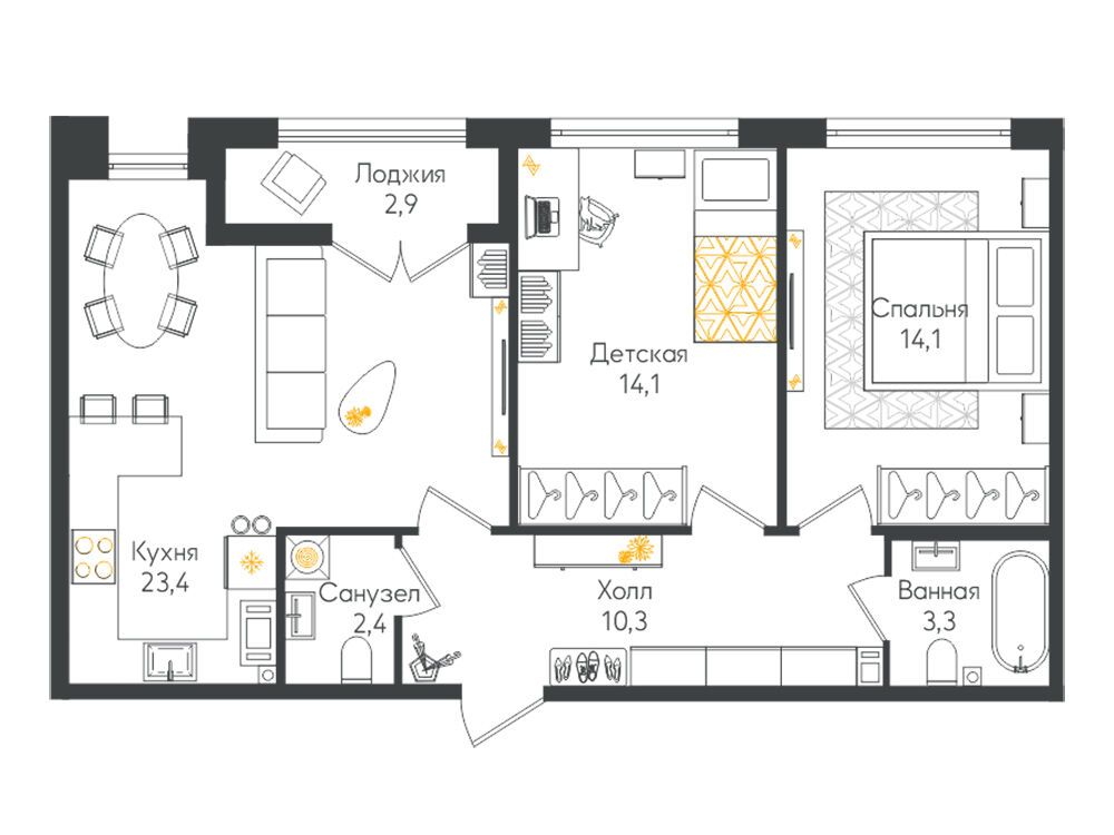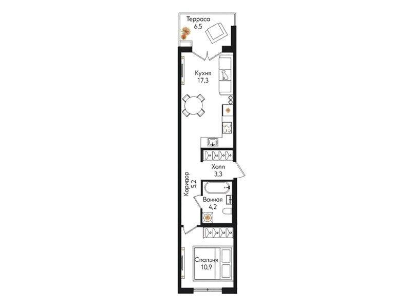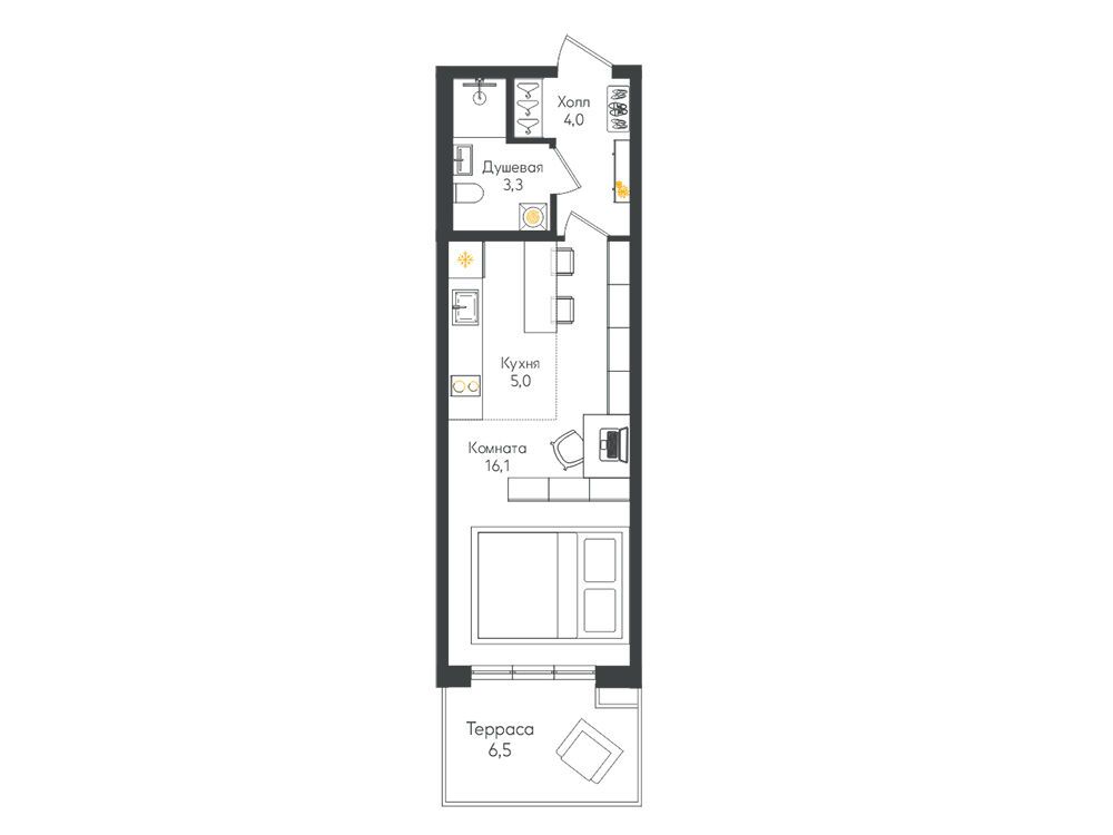 В проекте предусмотрено 596 квартир площадью от 26 до 108 м². Доступны студии, одно-, двух- и трёхкомнатные планировки, включая варианты с террасами, мезонинами, угловыми панорамными окнами и мастер-спальнями. Высота потолков на первом этаже достигает 4,7 м, на последующих этажах — 2,74 м. Часть квартир сдаётся с чистовой отделкой, которая включает натяжной потолок, межкомнатные двери с фурнитурой, ламинат в жилых комнатах и коридоре, напольную плитку на кухне, сантехнику и смесители в санузлах, а также напольную и облицовочную плитку.