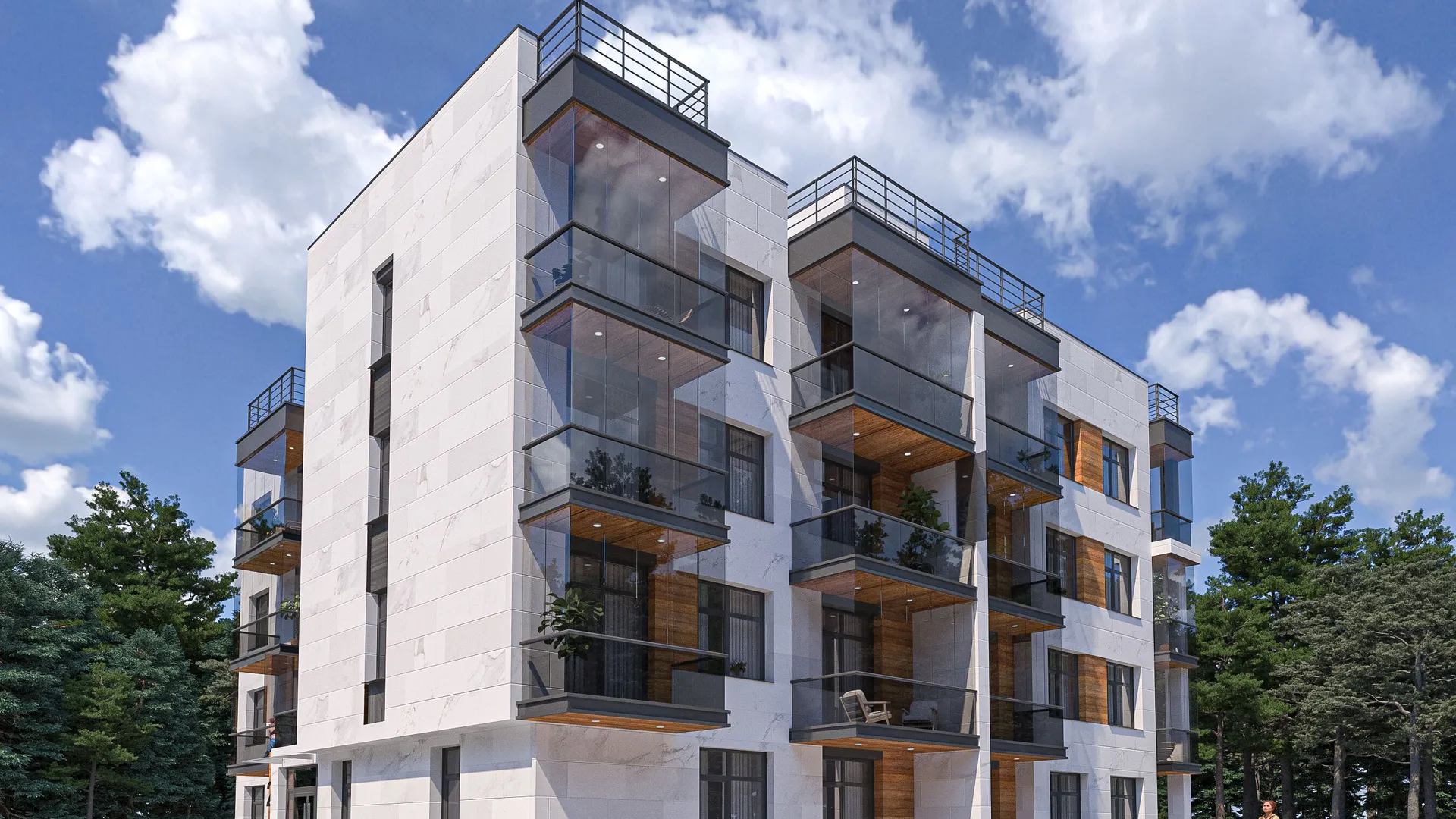 Высота потолков составляет 2,25 м. Во всех домах предусмотрены окна на две стороны света, два балкона и технологическое отверстие для монтажа камина. Фасады выполнены в сдержанном стиле: бежевые стены, тёмные кровли, лаконичные открытые балконы и веранды. Дома утеплены минеральной ватой в два слоя, что позволяет существенно снизить затраты на отопление.