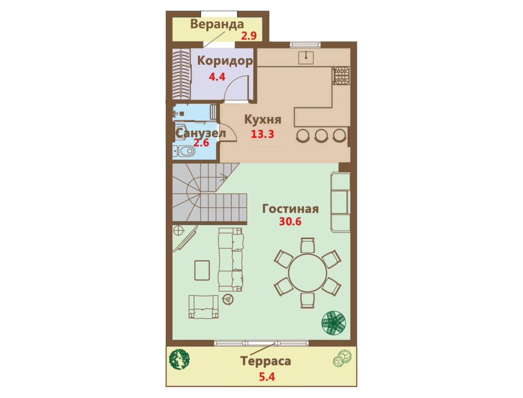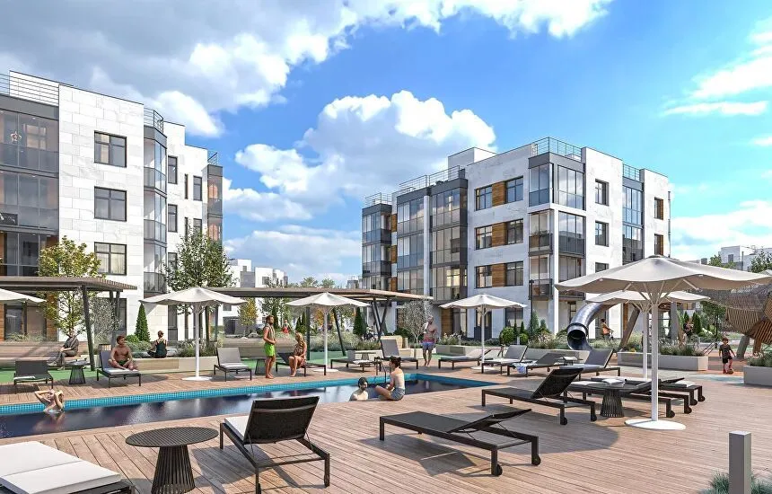 В посёлке предлагаются таунхаусы площадью от 100 до 122 м с утеплённой мансардой и земельным участком размером от 64 до 220 м. На первом этаже располагается просторная гостиная площадью до 50 м, объединённая с кухней и имеющая прямой выход на веранду и участок. На втором этаже находятся большая спальня с санузлом и балконом, а также одна или две дополнительные спальни. Мансарда (42–62 м) может быть обустроена как кабинет, игровая комната или зона отдыха.