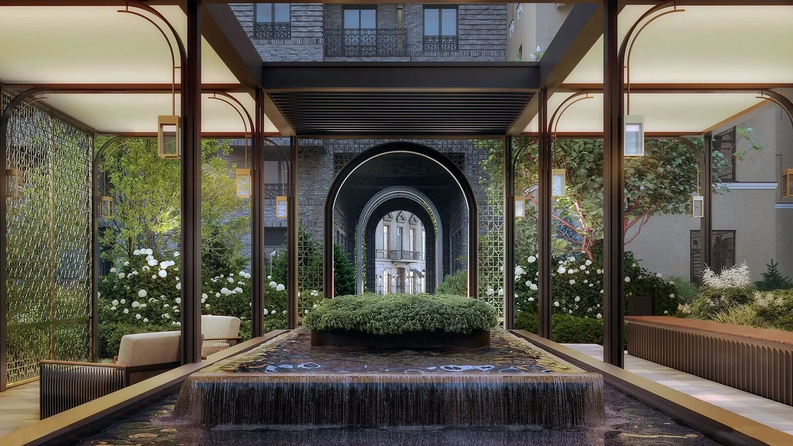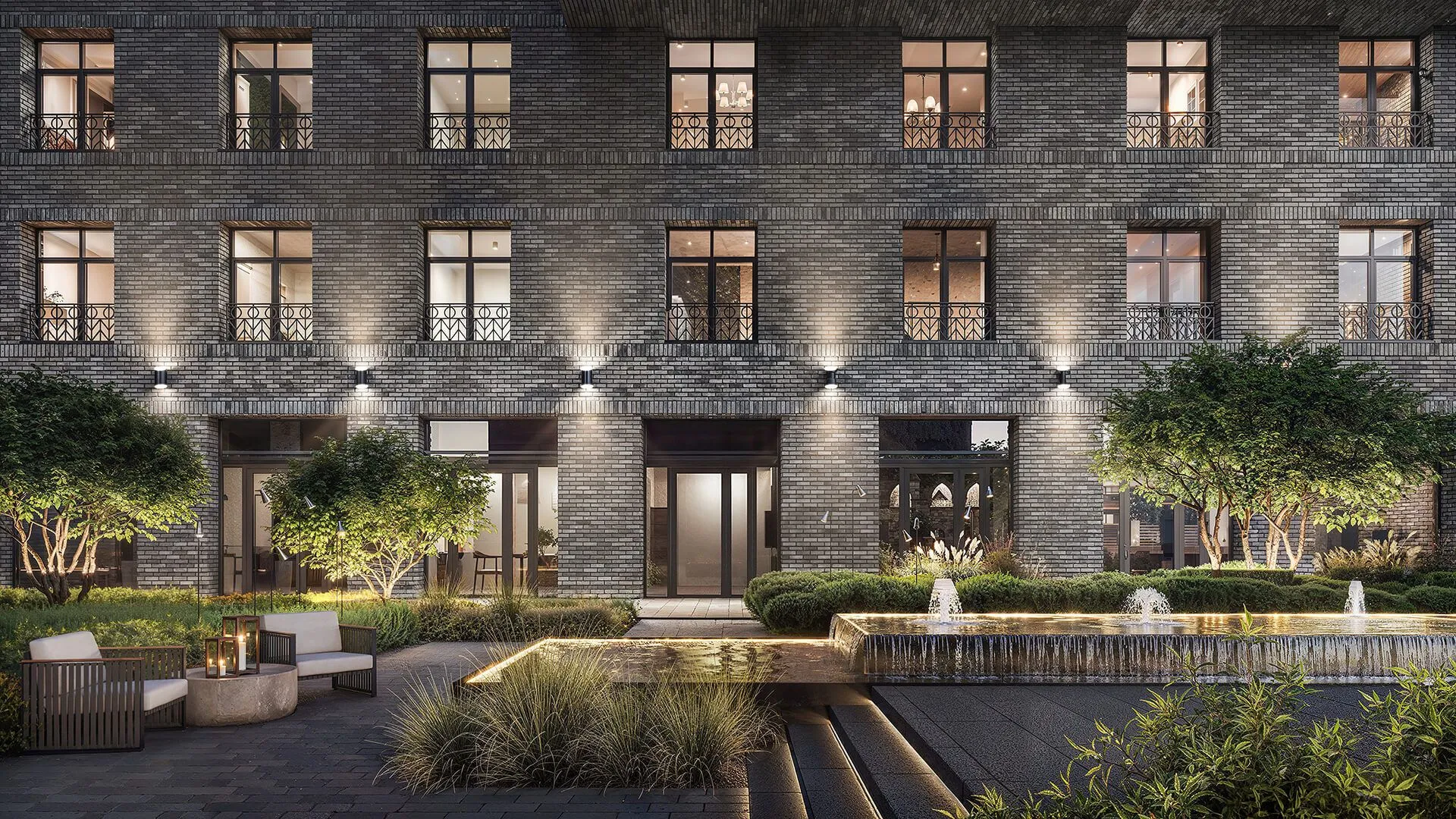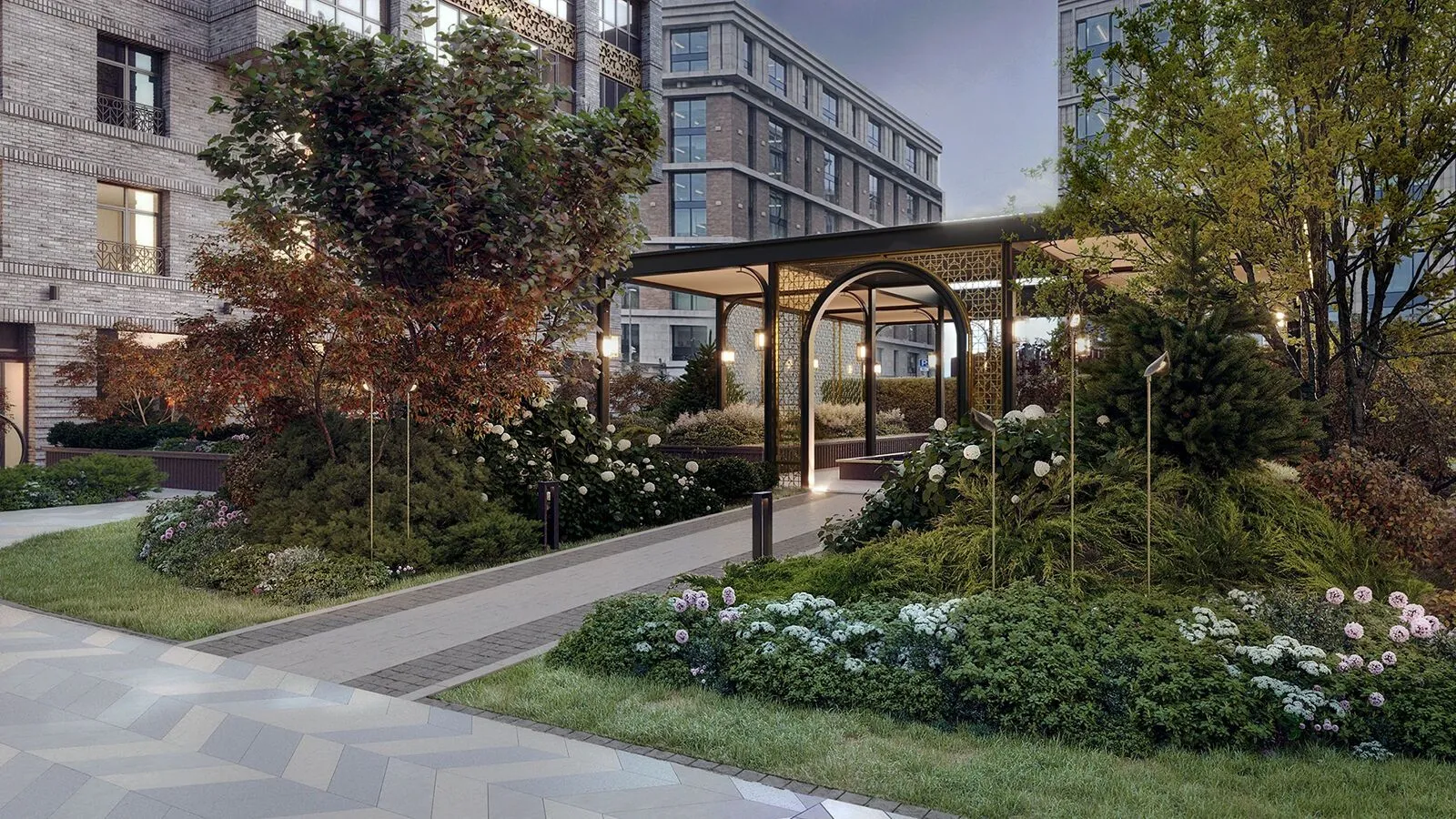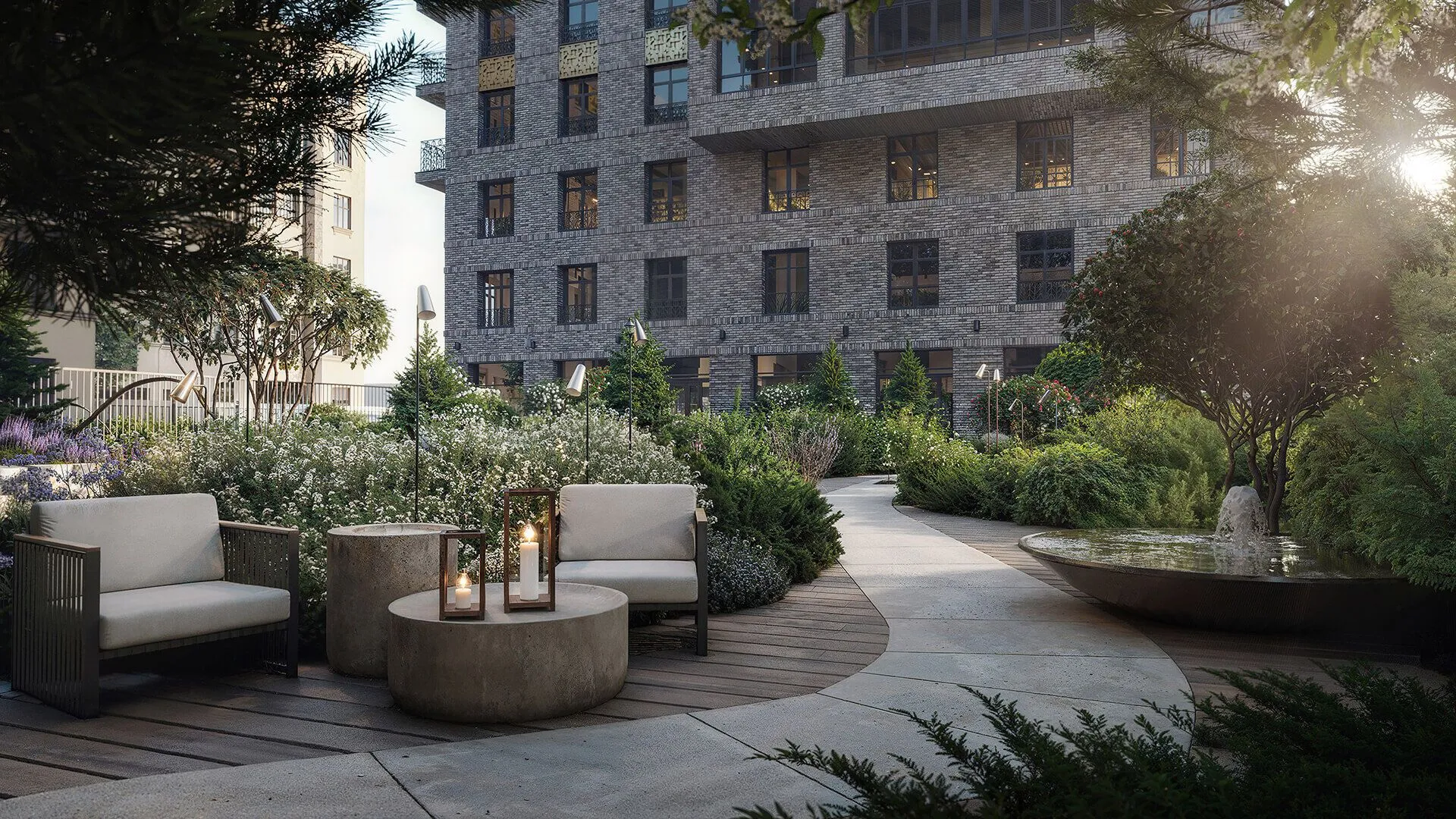 Ландшафтный дизайн территории площадью более 3 000 м разработан студией GAFA (Gavalidi & Friends Architects). Во дворе обустроен закрытый сад с прогулочными дорожками, зонами отдыха и «секретным садом» с фонтанами — пространство полностью изолировано от автомобилей и посторонних.