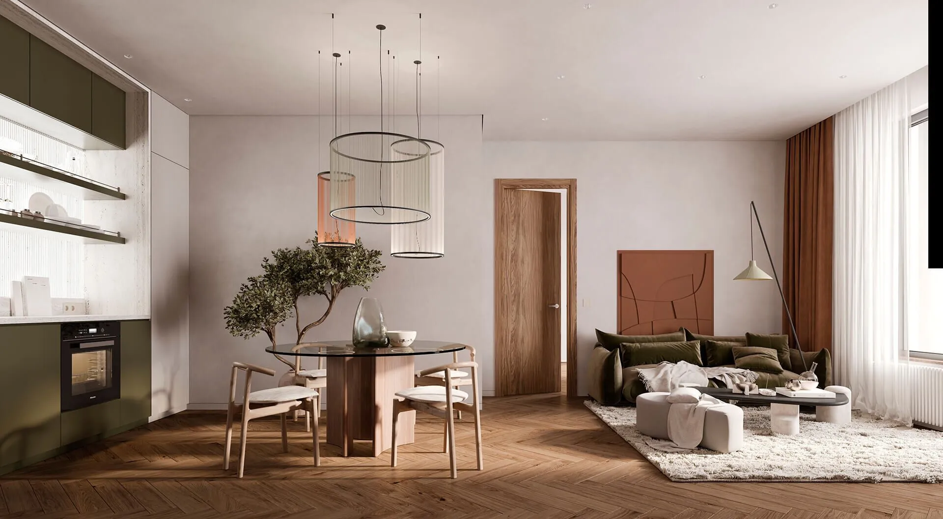 Квартиры предлагаются в нескольких вариантах отделки: без отделки (корпуса 1 и 2), с предчистовой отделкой (white box, корпус 3) и с чистовой отделкой в тёплых и холодных оттенках (корпус 4). В ряде резиденций предусмотрены мастер‑спальни с гардеробными и ванными комнатами, просторные кухни‑гостиные, а также дополнительные помещения для кабинета, детской или библиотеки. Пентхаусы оснащены каминами, винными комнатами и террасами с видами на Смольный, Таврический сад и исторический центр города.
