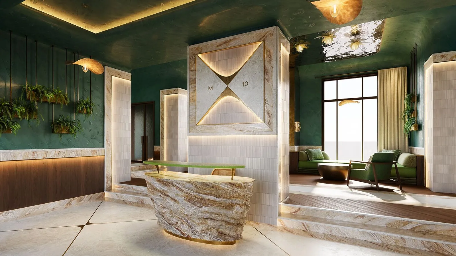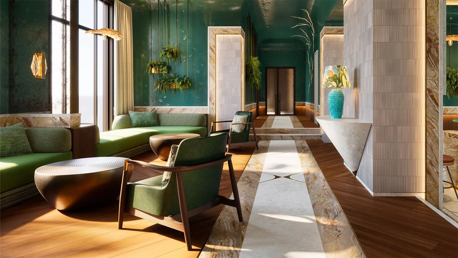 Дизайн лобби и общественных пространств создан британской архитектурной студией LAMBART & BROWNE, специализирующейся на интерьерах класса люкс. В оформлении использованы мрамор, кварц и латунь; предусмотрены интеллектуальная система открывания дверей, премиальная мебель и декор.