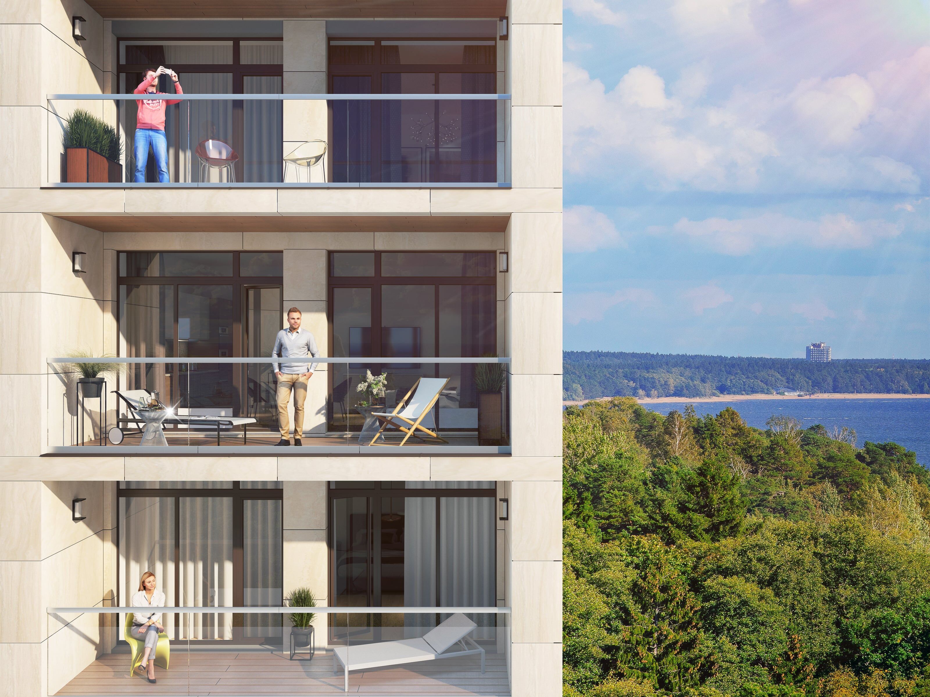 Ключевая особенность апартаментов — панорамное остекление, обеспечивающее живописные виды на Финский залив и хвойный лес. На верхних этажах расположены резиденции с саунами и просторными террасами. Площадь юнитов варьируется от 21 до 123 м², высота потолков достигает 3 м.