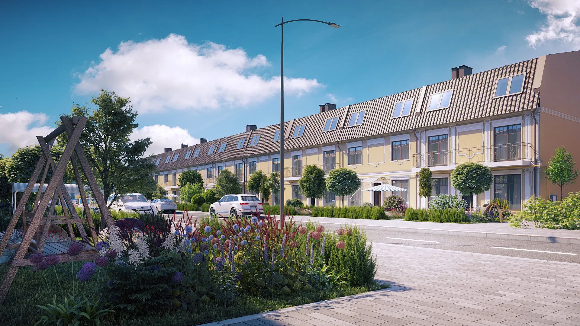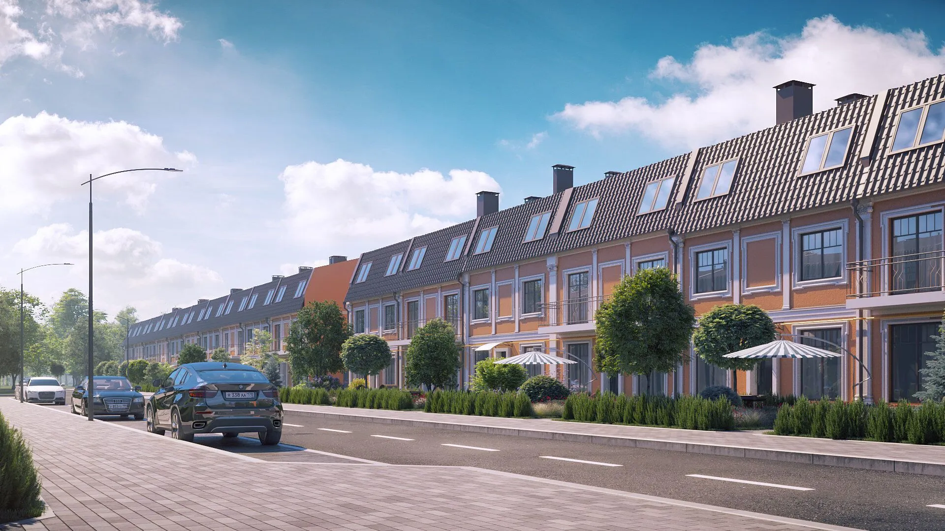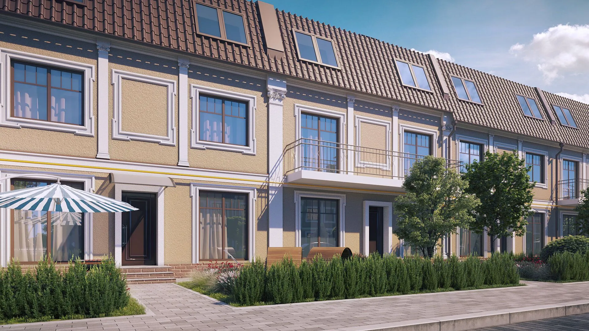 Таунхаусы трёхэтажные, включая мансардный этаж. Высота потолков варьируется: на первом этаже — 2,7 м, на втором — 2,8 м, на мансардном — до 3,72 м. Площадь домов составляет от 112 до 270 м². Каждый таунхаус имеет отдельный вход и собственный палисадник. В ряде домов предусмотрен гараж на первом этаже. На каждом этаже размещён санузел; некоторые варианты включают панорамные окна и балконы.