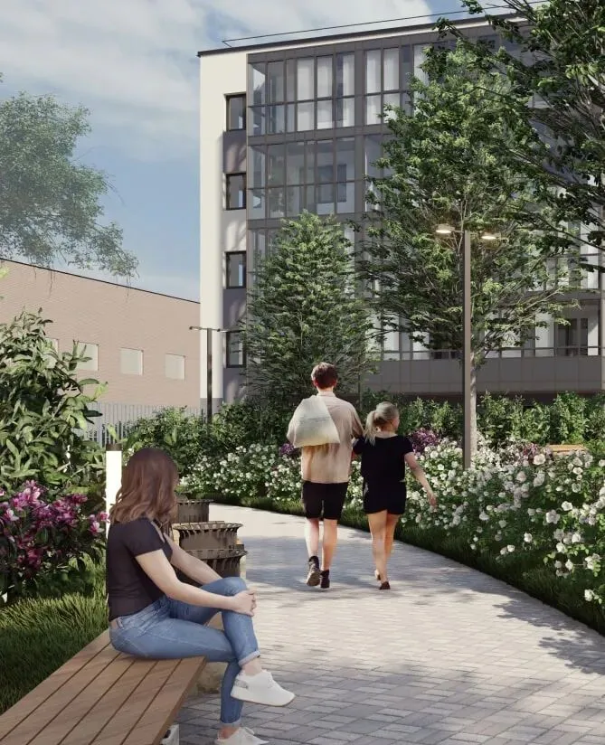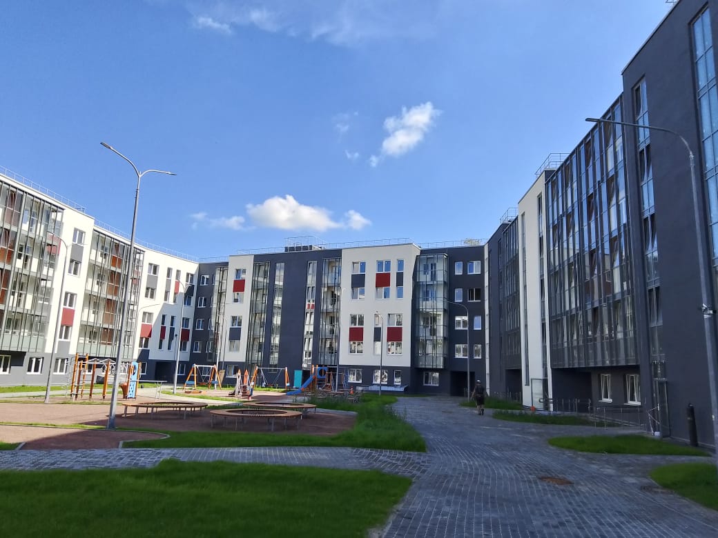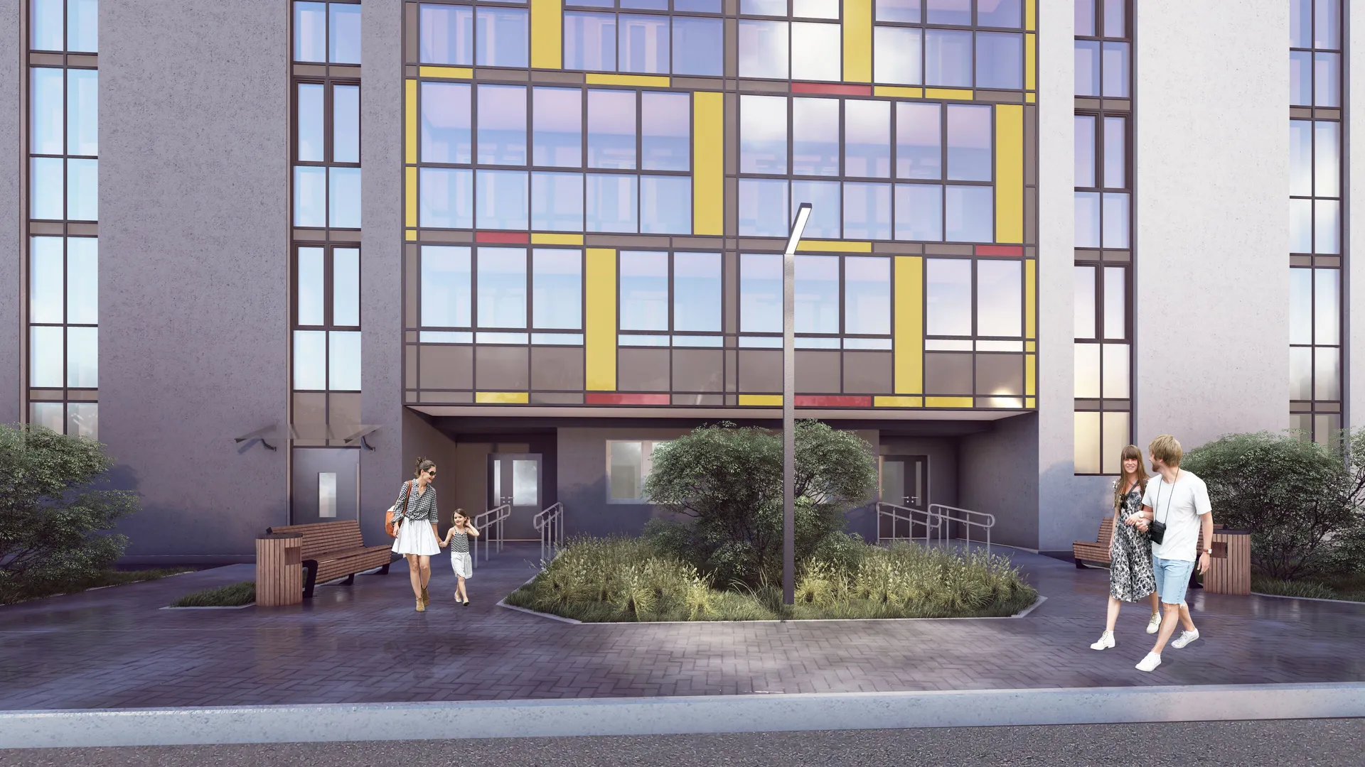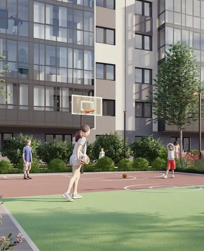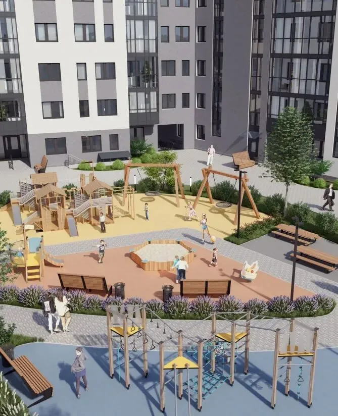Территория комплекса закрыта от машин и посторонних, что обеспечивает безопасность и комфорт жителей. Во дворе обустроены детская и спортивная площадки, фитнес‑зона, прогулочные дорожки и зоны отдыха. Ландшафтный дизайн включает деревья, кустарники и цветы, создающие уютную зелёную среду.
