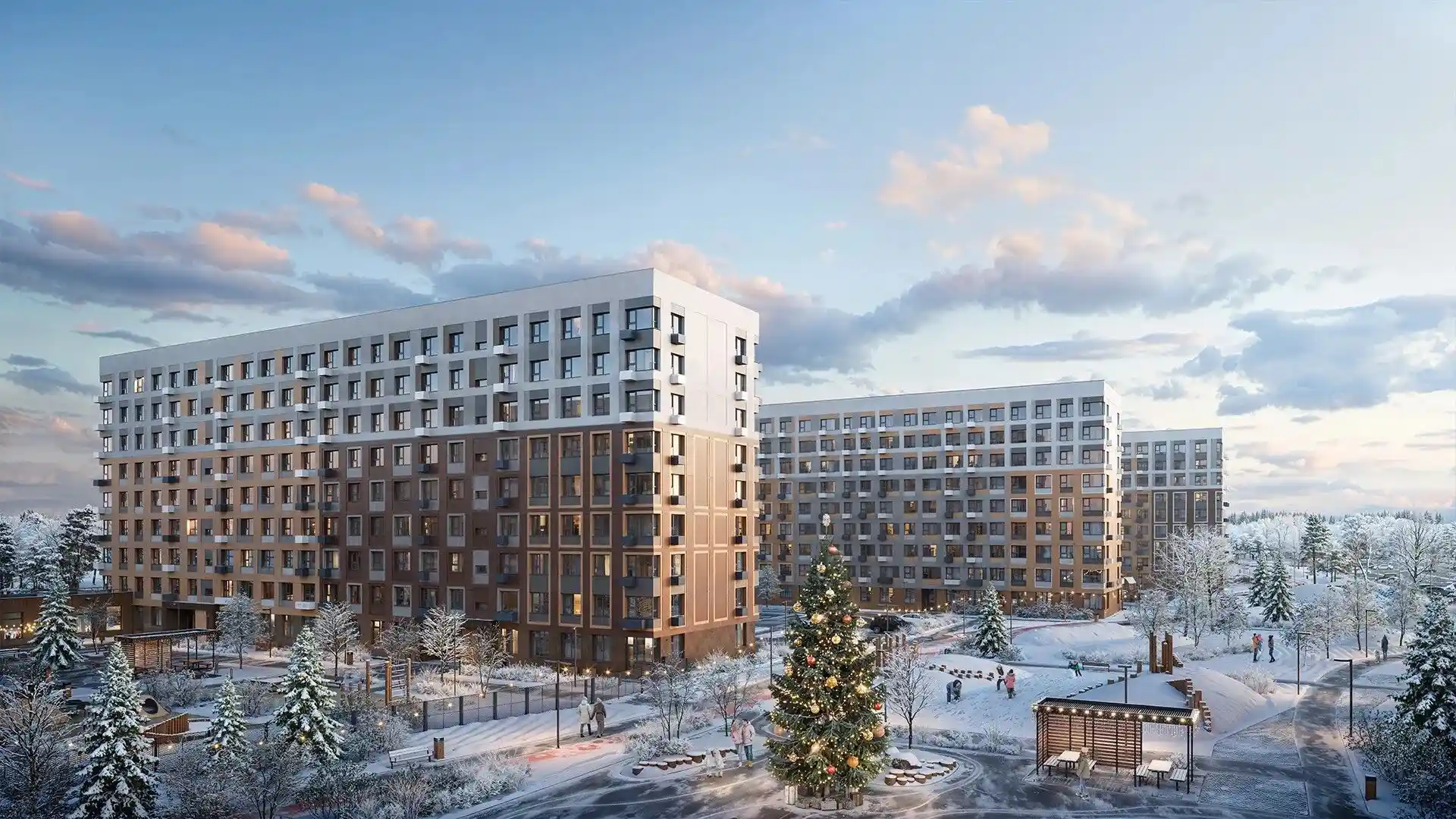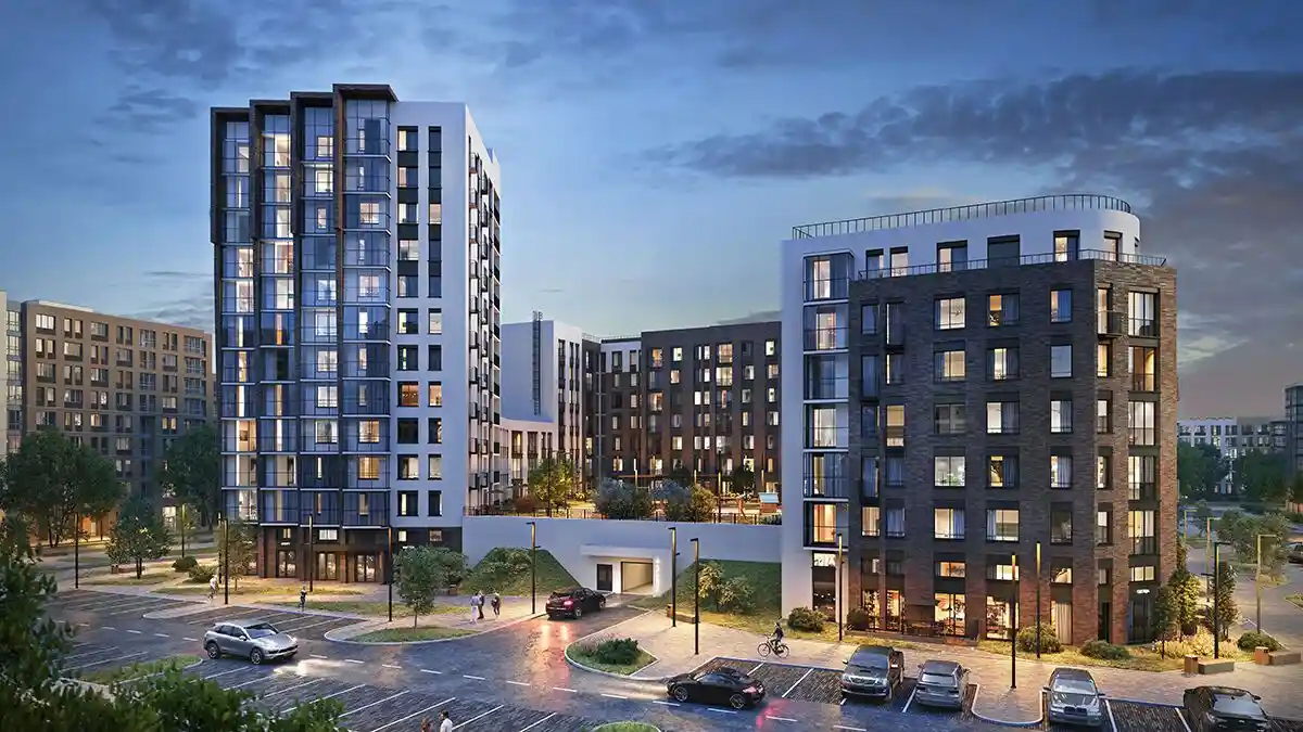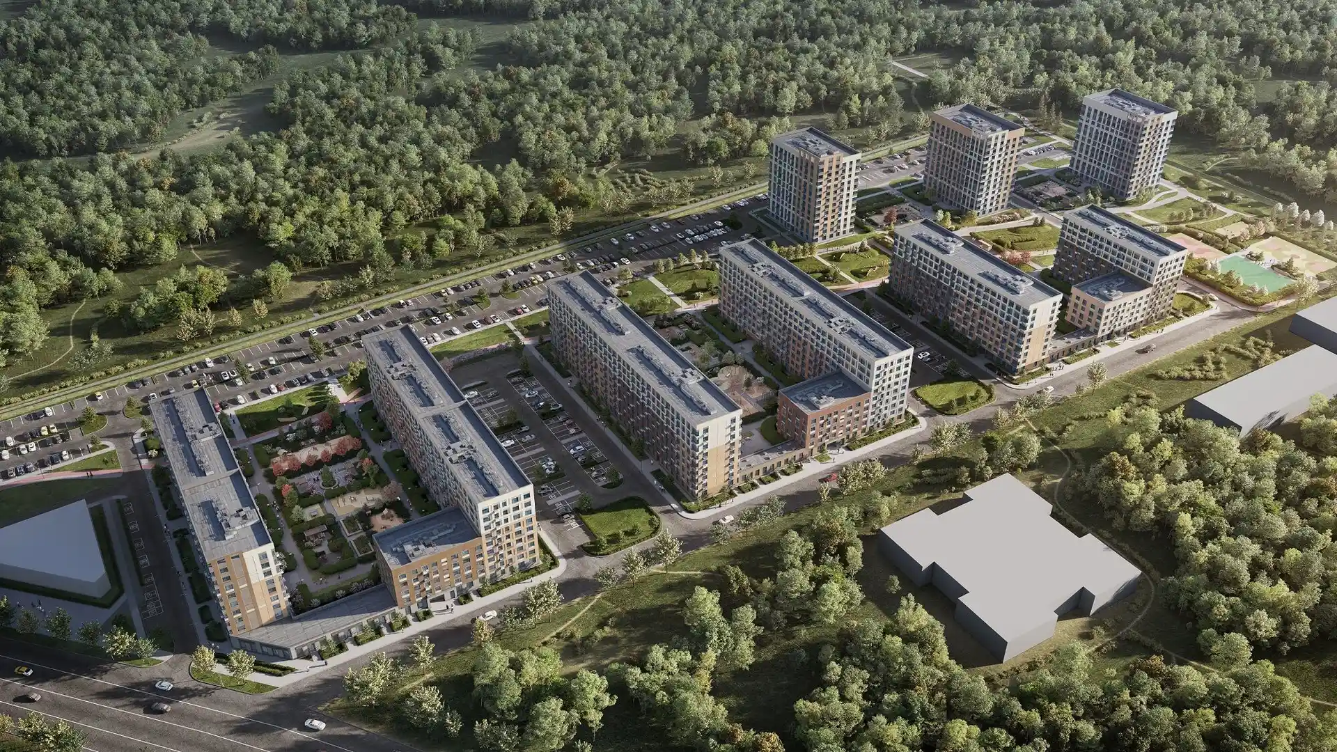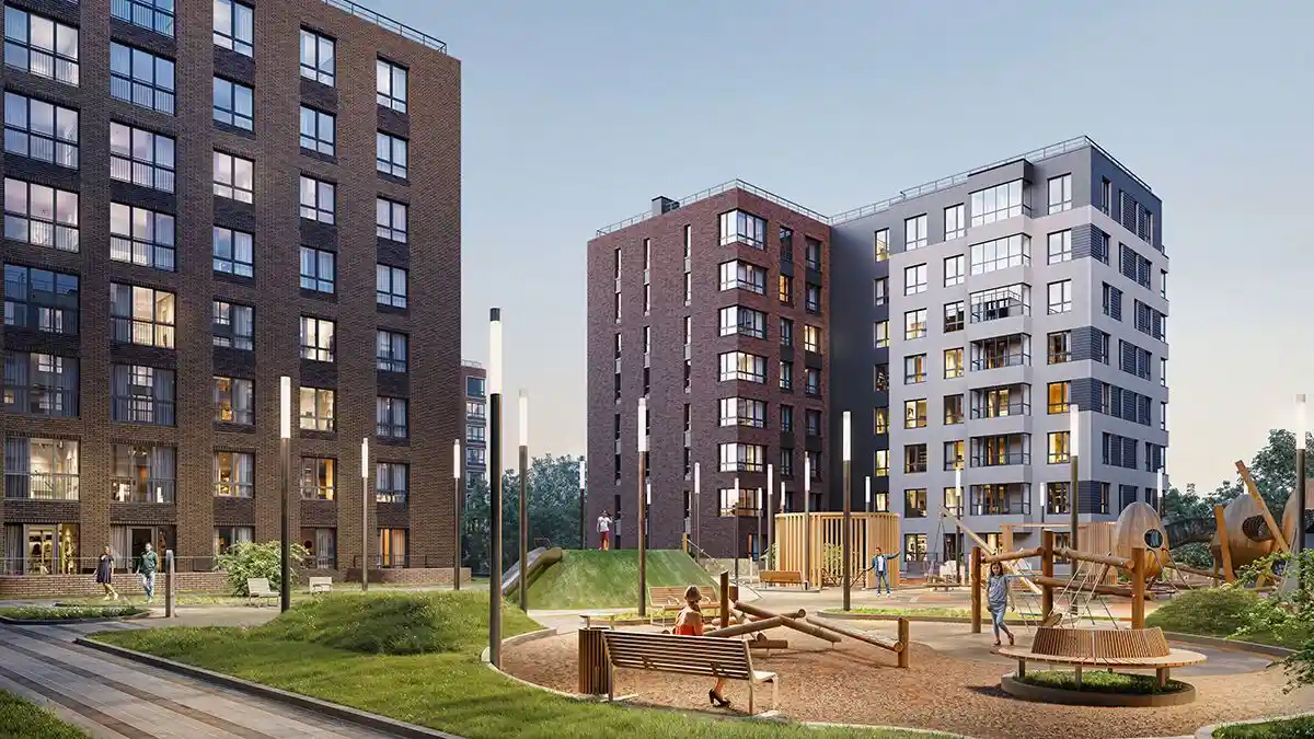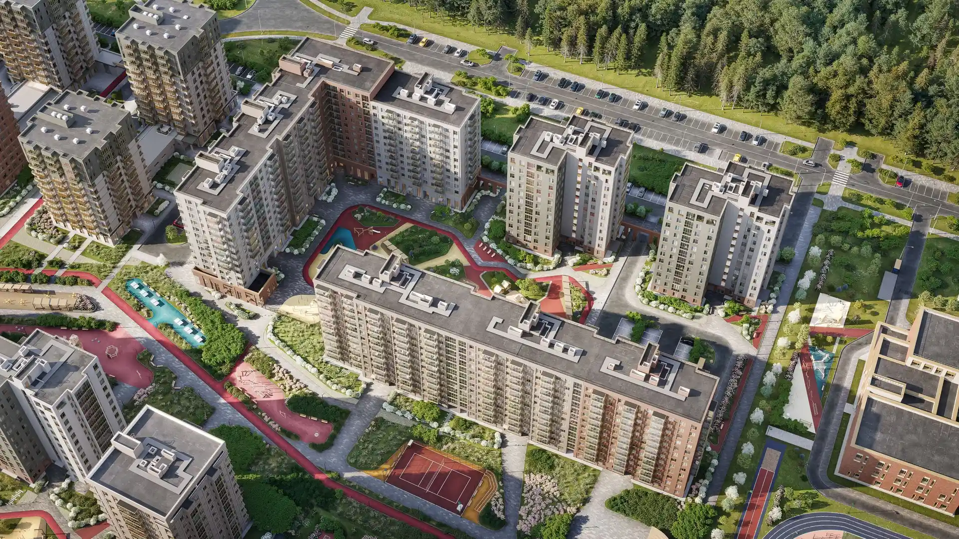 Высотность зданий в комплексе ограничена 6–12 этажами, что создает соразмерную человеку городскую среду. Квартирография исключает формат студий, ориентируясь на семейного покупателя, и включает одно-, двух- и трехкомнатные квартиры площадью от 36 до 100 кв. м с высотой потолков от 2,75 метра.