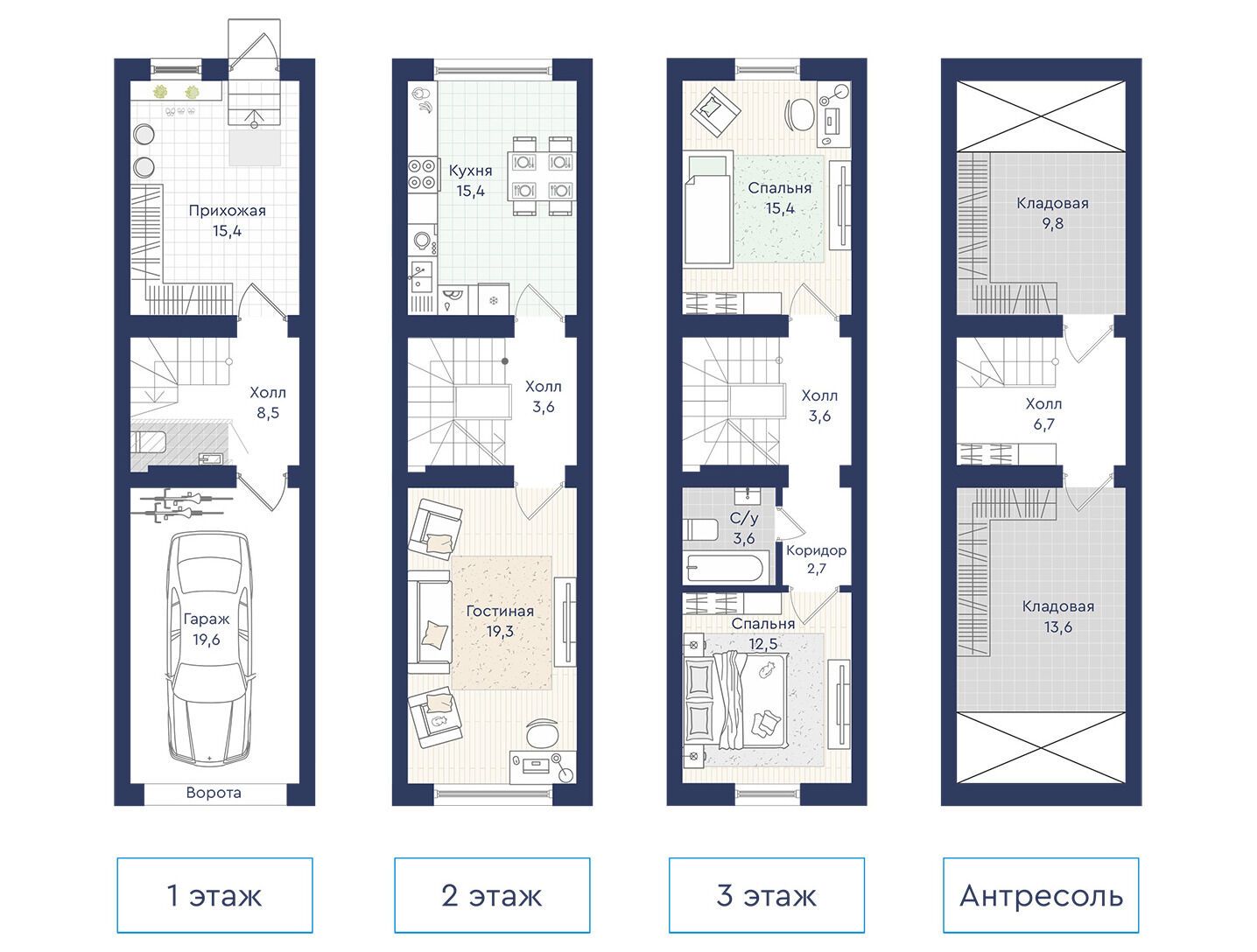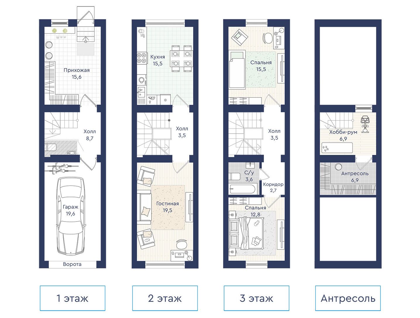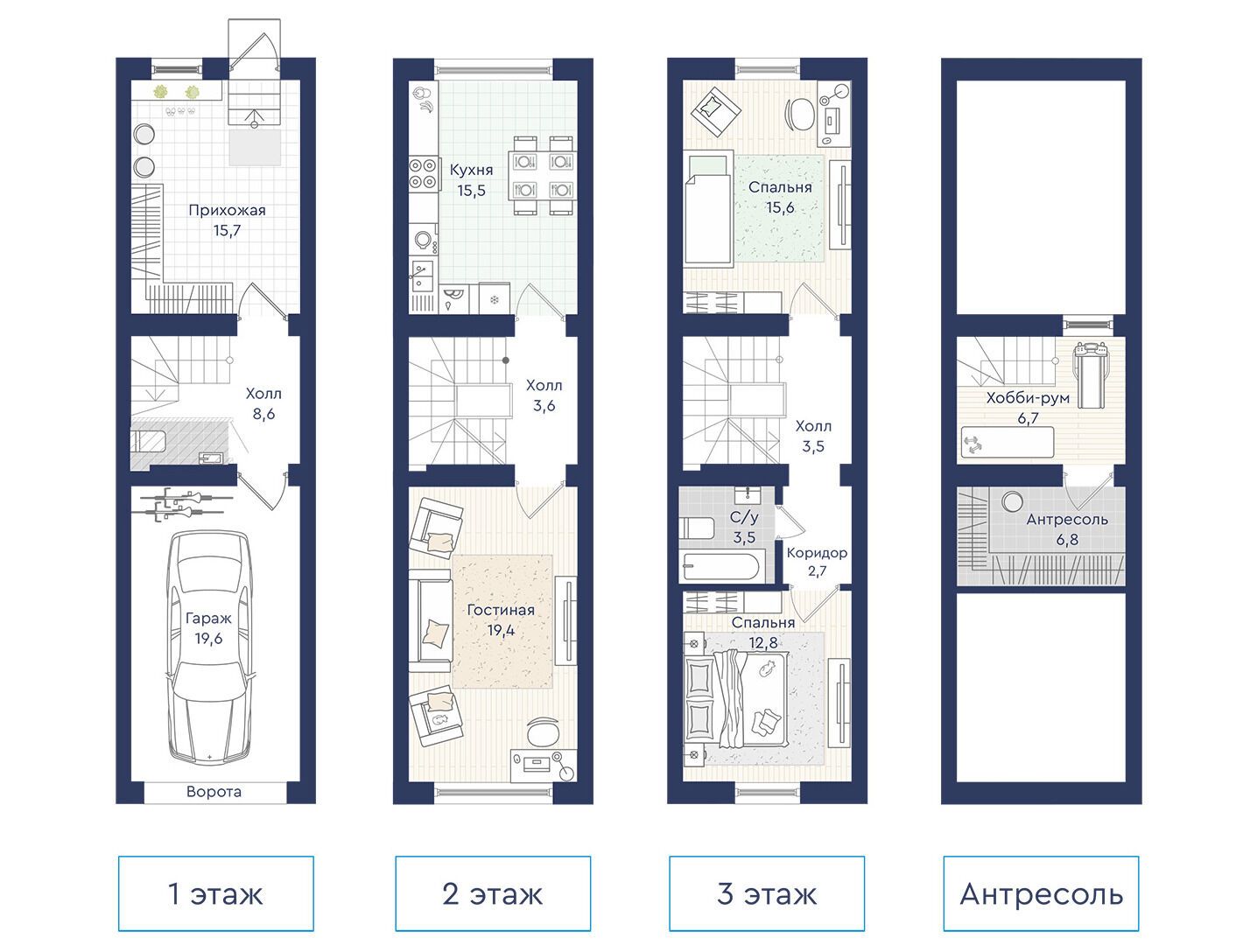 Планировки предусматривают от двух до четырёх комнат. В двухэтажных вариантах обычно размещаются две спальни и антресоль для хранения под крышей; в трёхэтажных (с гаражом) — три жилые комнаты. Таунхаусы передаются покупателям без отделки, однако есть возможность заказать чистовую отделку — детали уточняются в отделе продаж.