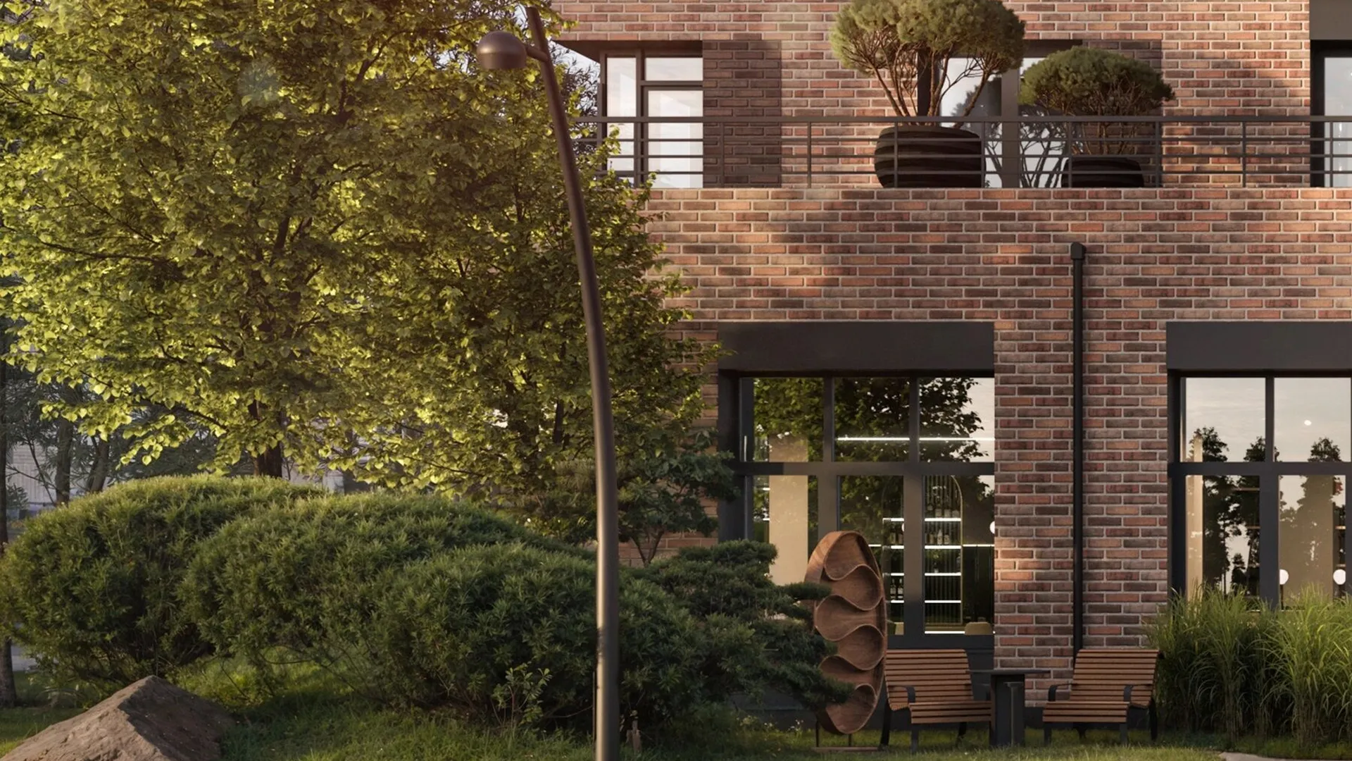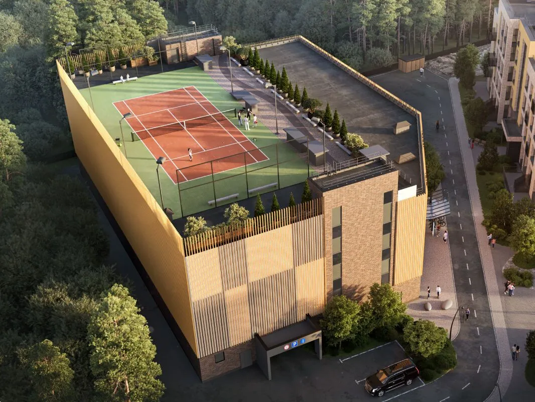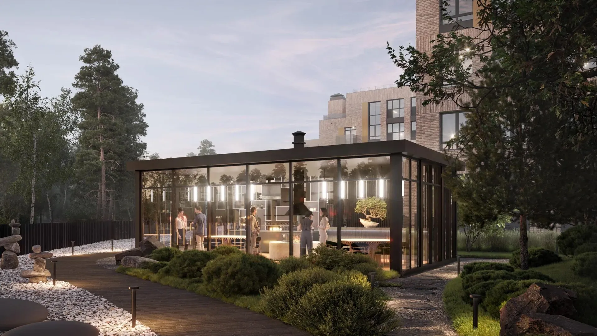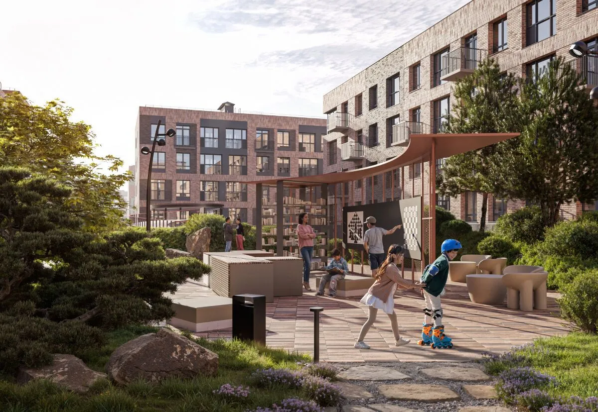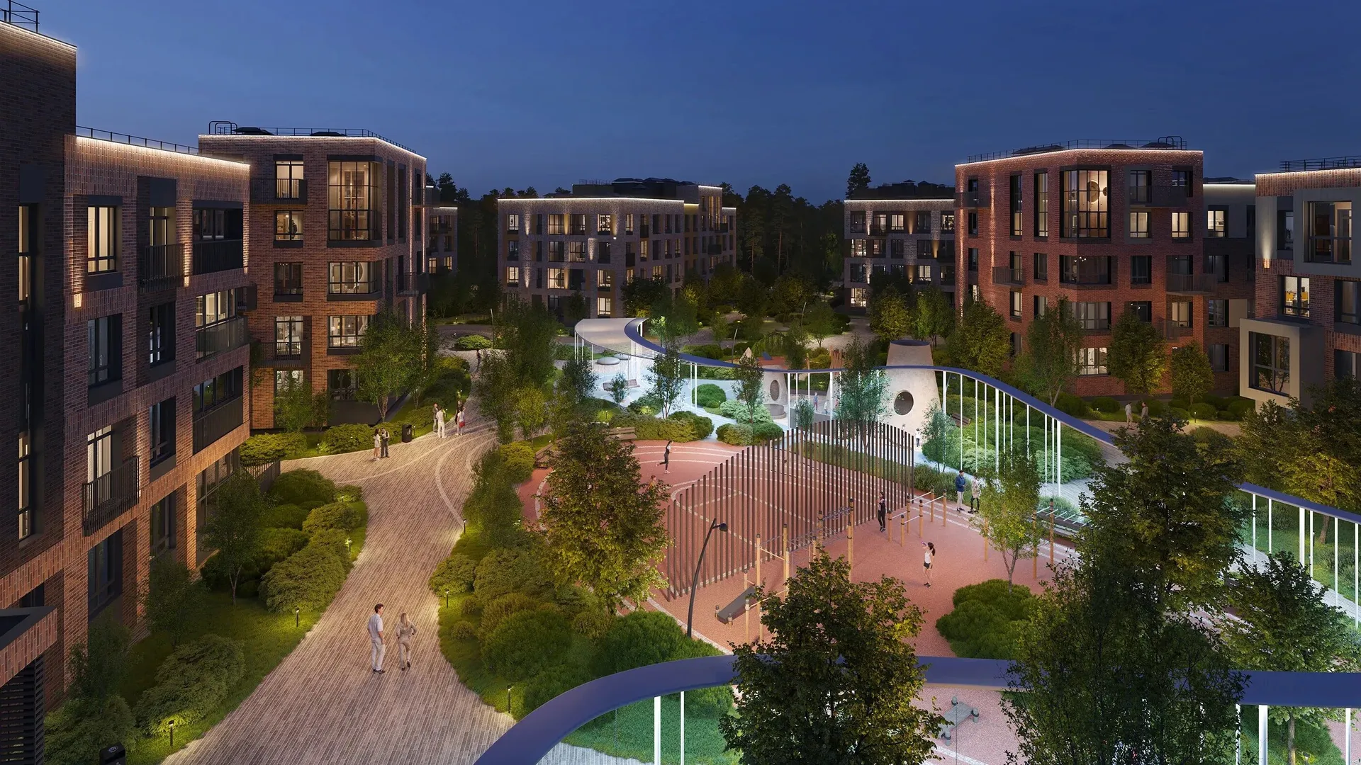 Территория комплекса закрыта и охраняется. Концепция внутренней инфраструктуры — двор‑парк с извилистыми прогулочными дорожками, лавочками и беседками. На территории предусмотрены: многоуровневый паркинг с теннисным кортом на крыше, коворкинг под открытым небом, финский павильон с живым очагом и шезлонгами, павильон для барбекю, амфитеатр, сад с пряными травами и скульптурами, три прогулочные аллеи и водный арт‑объект. В проекте также запланированы детский сад и начальная школа.