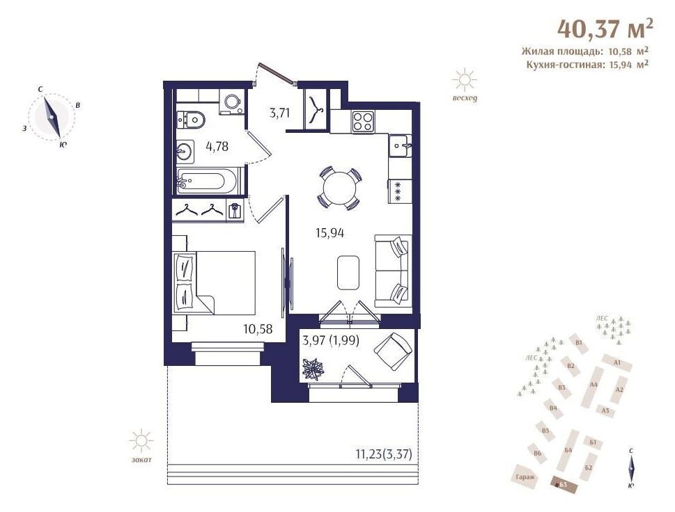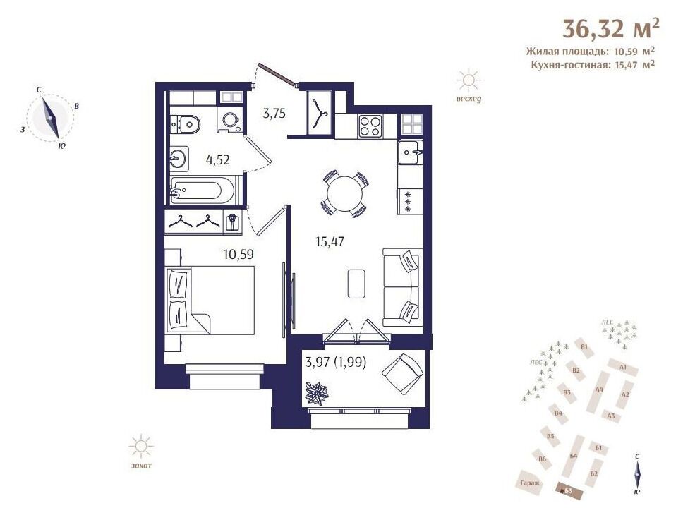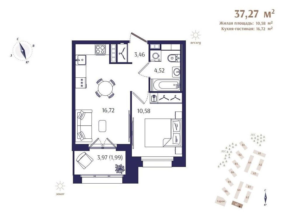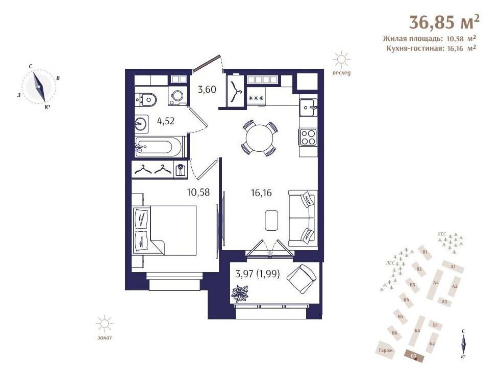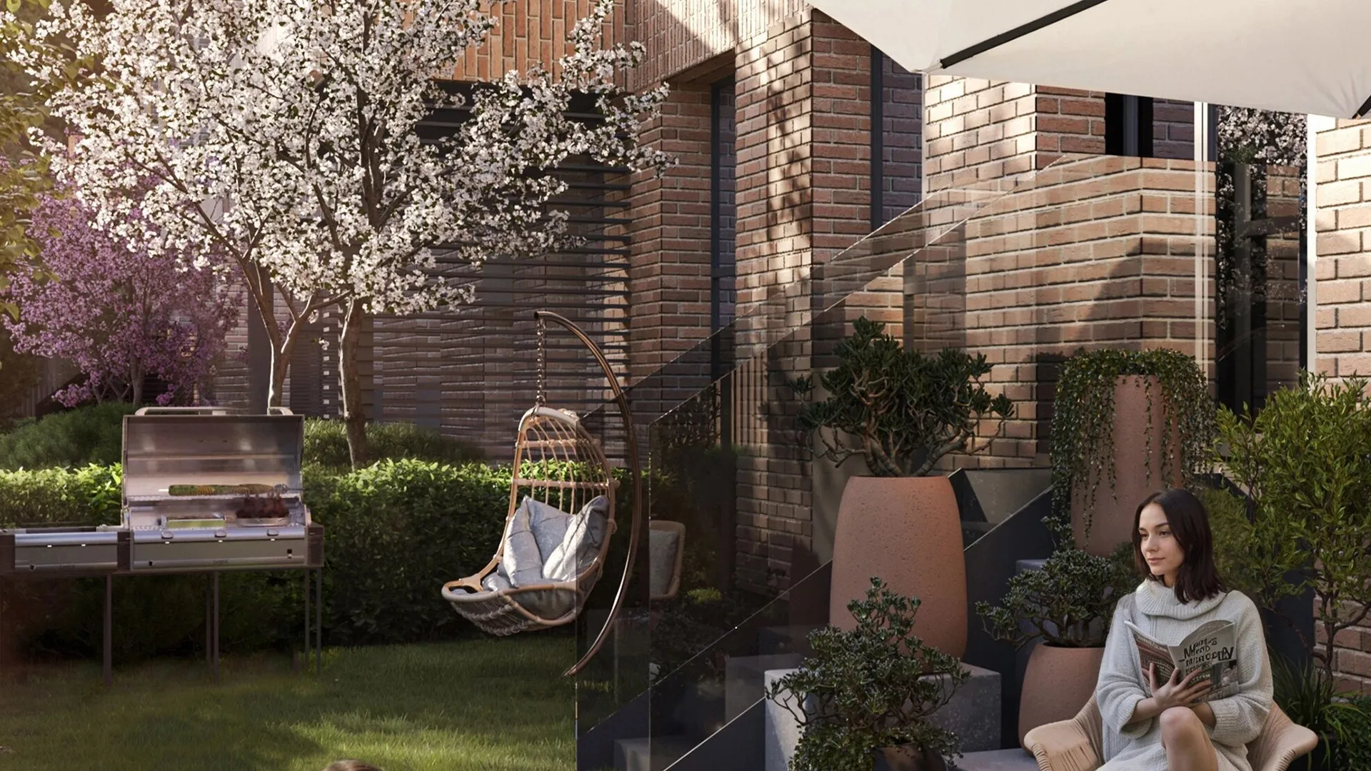 В комплексе представлены одно-, двух- и трехкомнатные квартиры площадью от 35,7 до 98,8 м². Среди планировочных решений — квартиры с панорамным остеклением, двухуровневые варианты со вторым светом, квартиры с патио (до 63 м²) и террасами (до 22 м²), а также квартиры с отдельным входом. Высота потолков составляет 3 м. Все квартиры сдаются в предчистовой отделке; дополнительно доступна чистовая отделка в двух вариантах: светлая палитра с акцентом на натуральное дерево и песчаные оттенки и темная палитра с акцентом на природный камень и темный дуб.