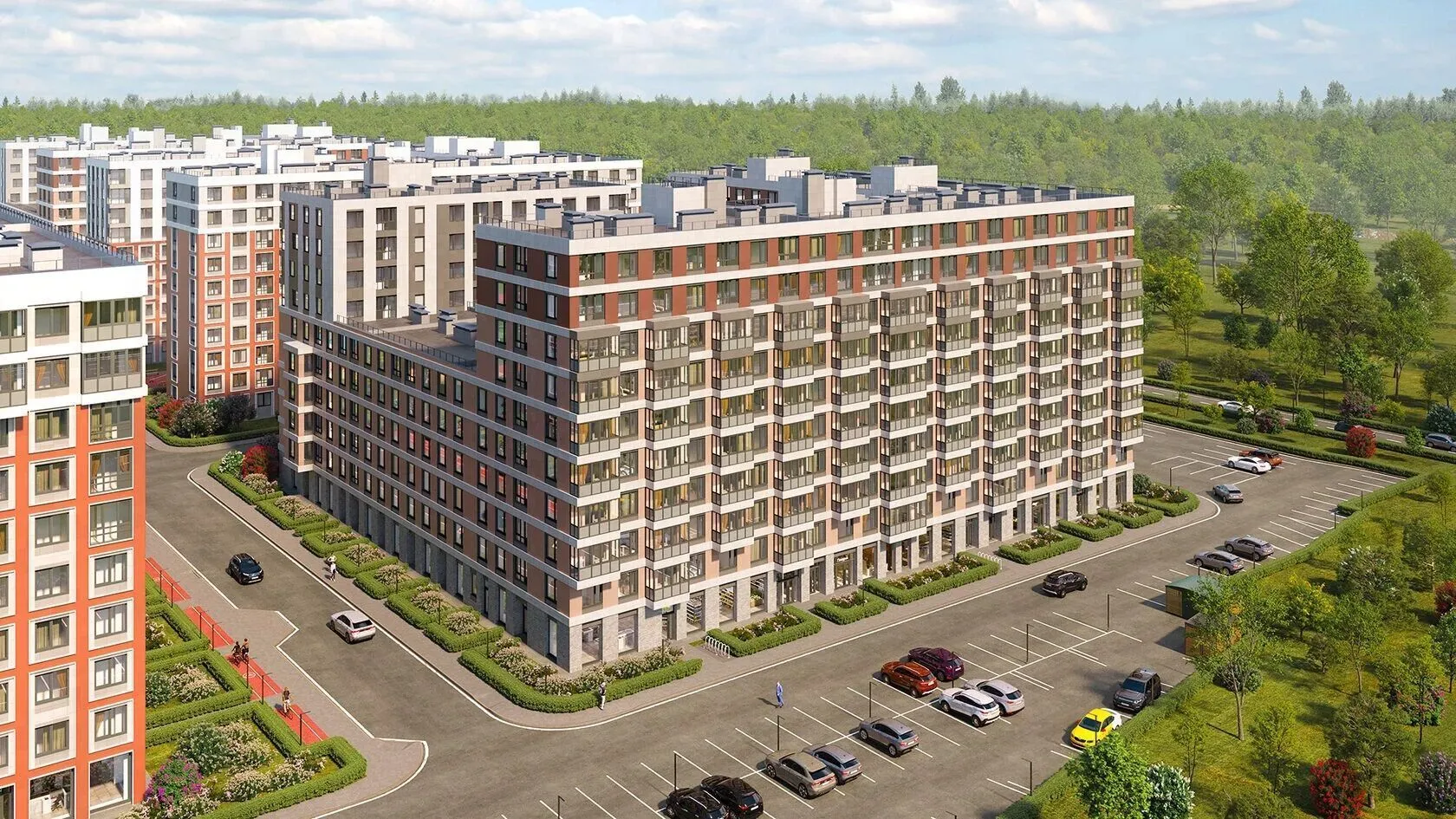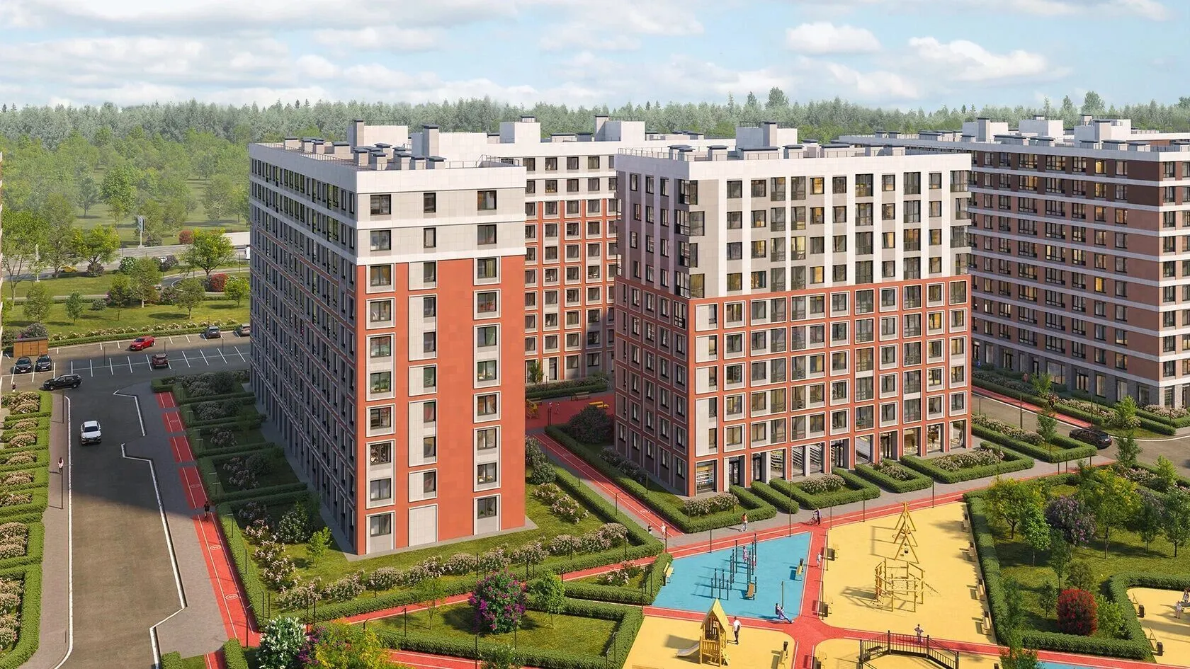 На первых этажах размещены коммерческие помещения: здесь откроются магазины, салоны красоты и кафе. На территории комплекса запланирован физкультурно‑оздоровительный центр с бассейном. Для жителей обустроены детская и спортивная площадки, а также зоны отдыха. Территория озеленена, создана безбарьерная среда, удобная для колясок и маломобильных жителей.