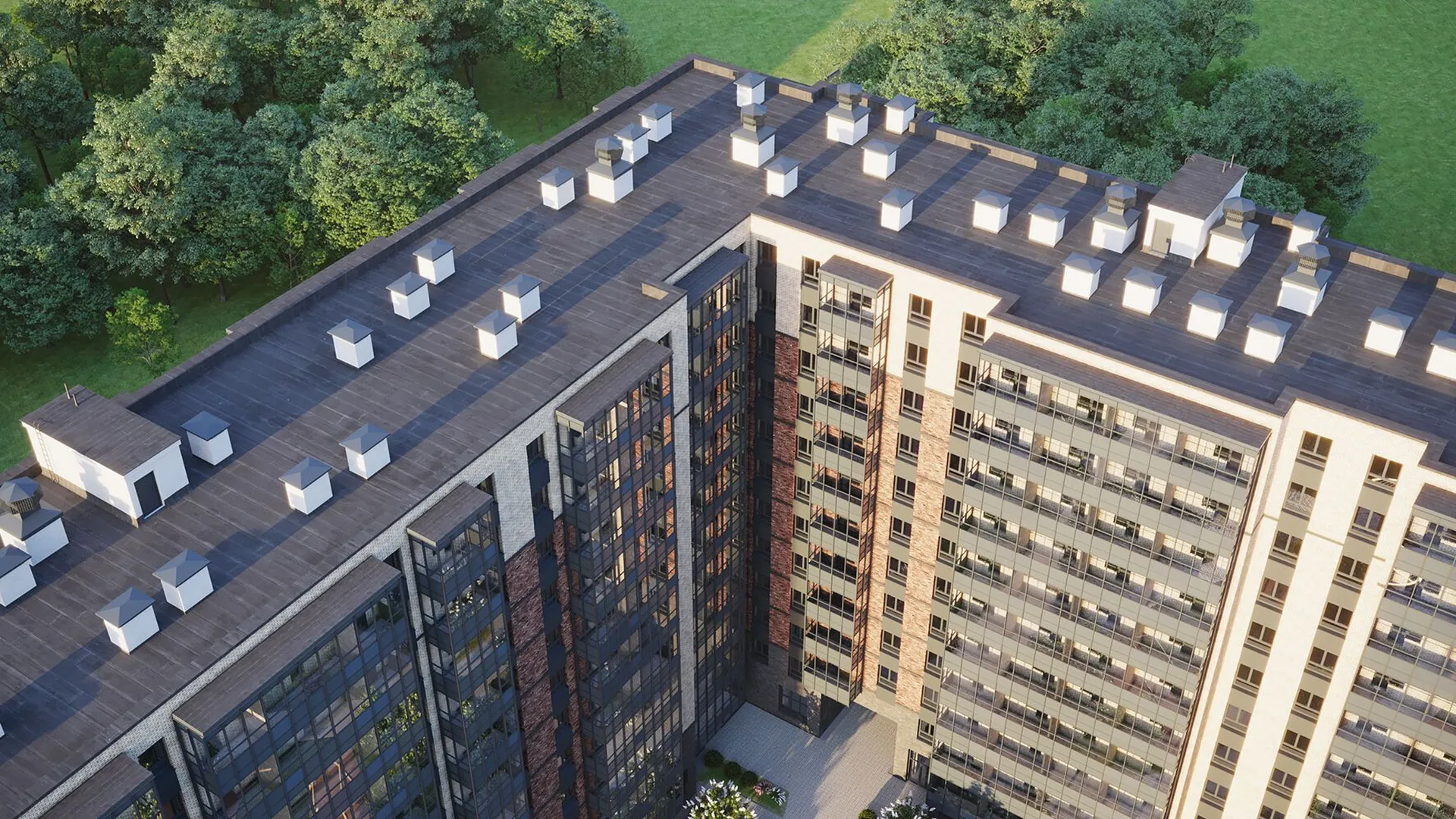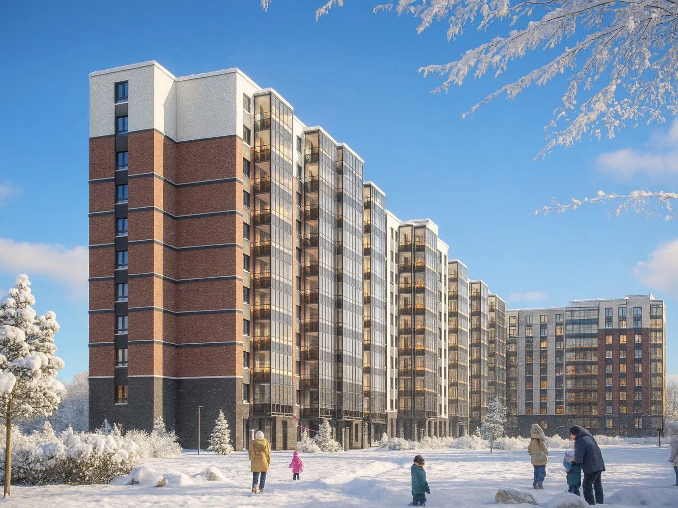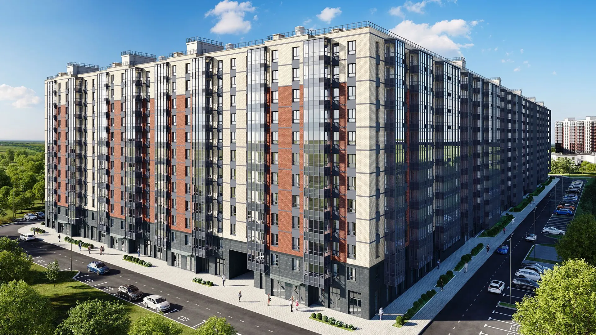 Строительство ведется в две очереди. Высота корпусов варьируется от 12 до 17 этажей. Фасады облицованы декоративным кирпичом в мягкой природной палитре, что придаёт комплексу лаконичный и сдержанный облик. В вечернее время здания эффектно подсвечиваются, создавая особую атмосферу.
