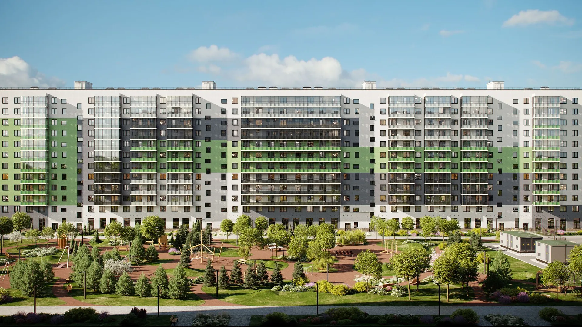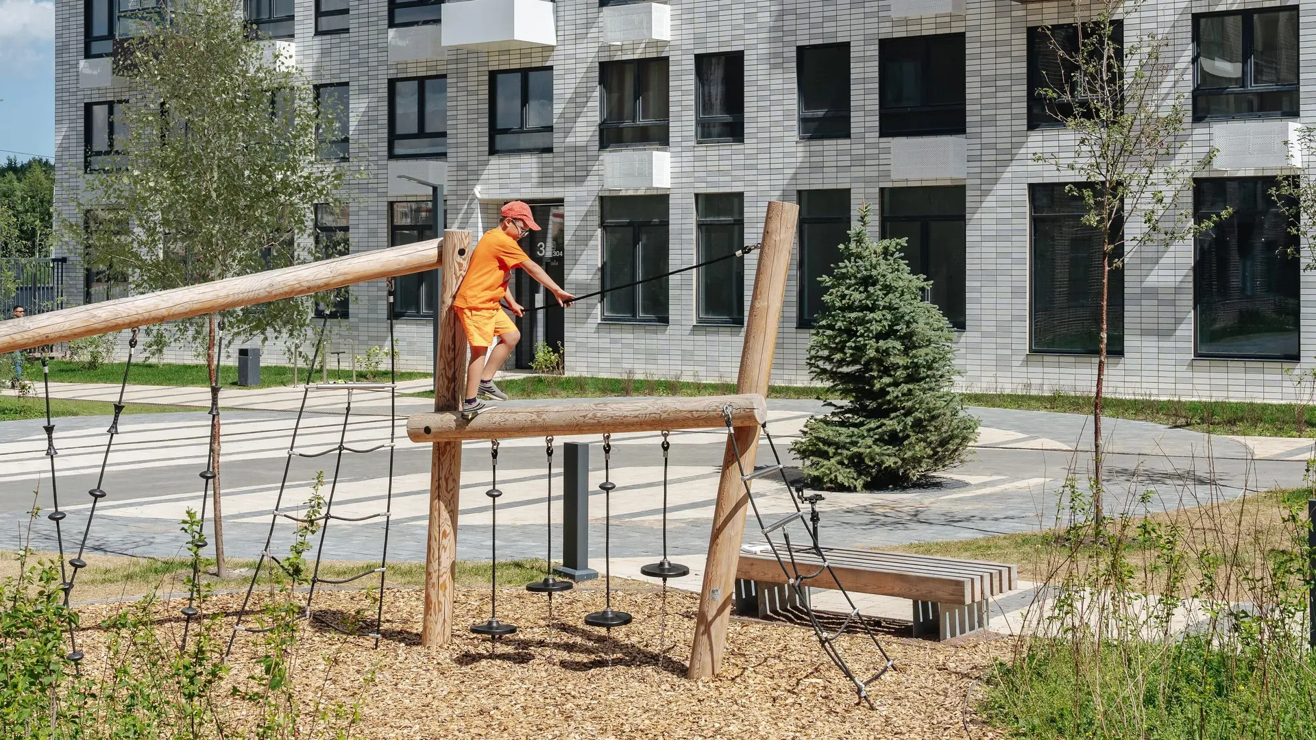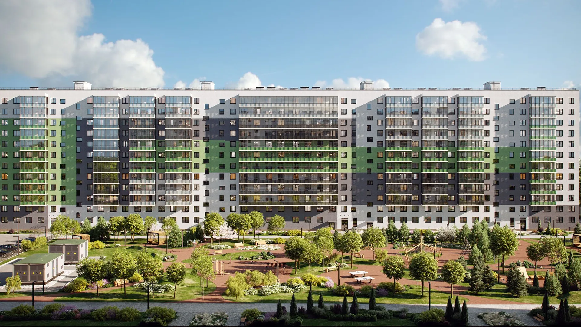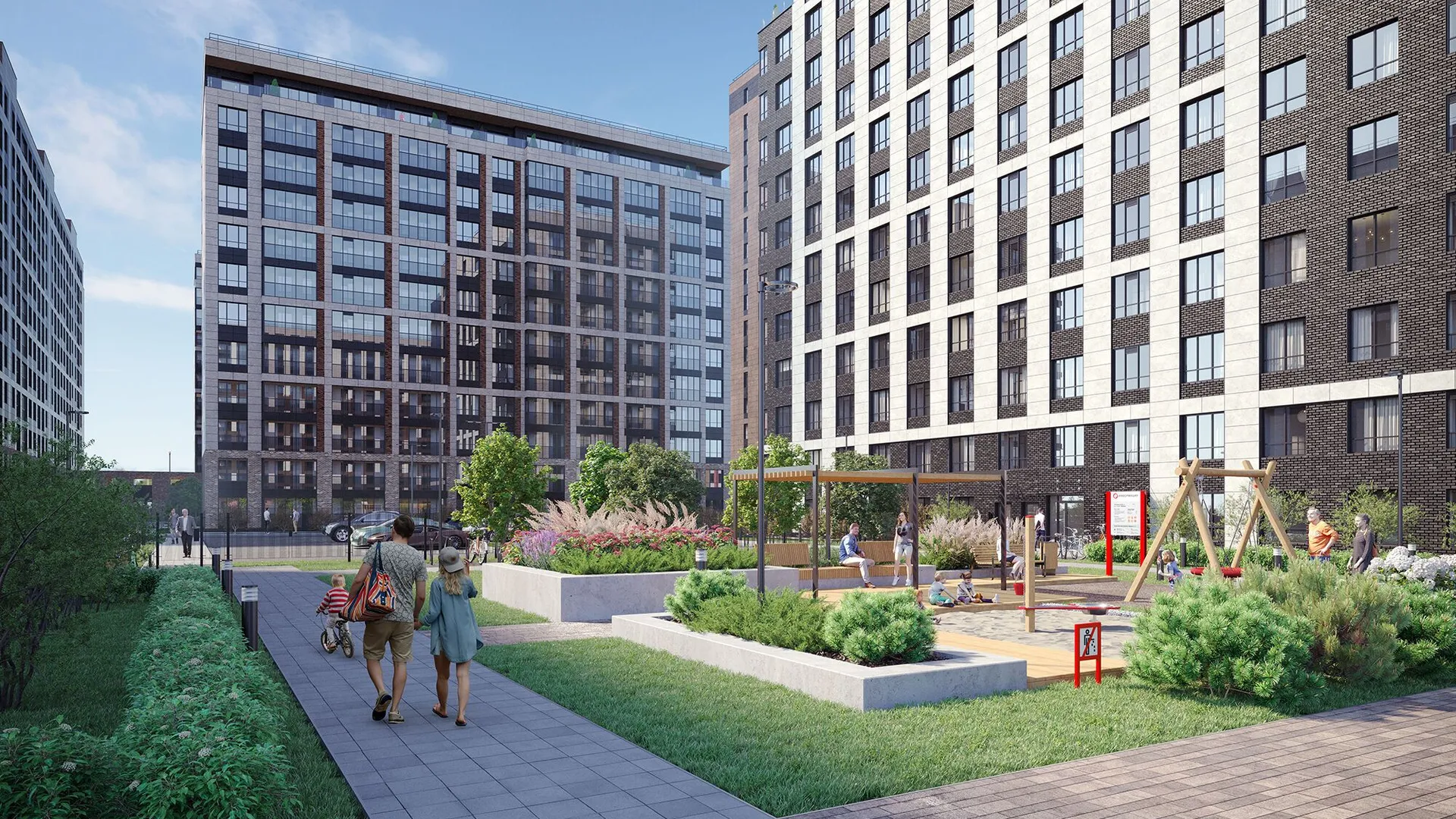 Зеленые дворы комплекса оборудованы детскими площадками, уединёнными зелёными офисами и гостиными под открытым небом с мебелью и навесами. Центром притяжения станет просторная площадь с дизайнерскими скамьями и качелями. В первой очереди её украсит скульптура птиц, во второй — фонтан. Во дворе второй очереди появятся живой лабиринт и вишнёвый сад.