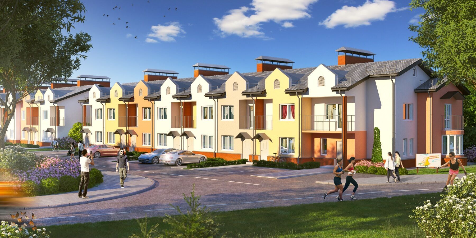Конструктивно здания выполнены из оштукатуренных газобетонных блоков, кровля устроена по деревянным стропилам с покрытием из металлочерепицы. Придомовая территория разделена на две функциональные зоны. Входная зона включает места для въезда и парковки автомобилей, пешеходные дорожки к входам, газоны и палисадники. Дворовая зона предназначена для отдыха, детских игр и хозяйственных нужд. Каждому жильцу выделено одно машино‑место на открытой стоянке.