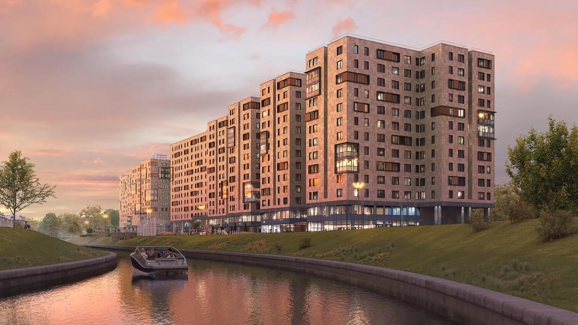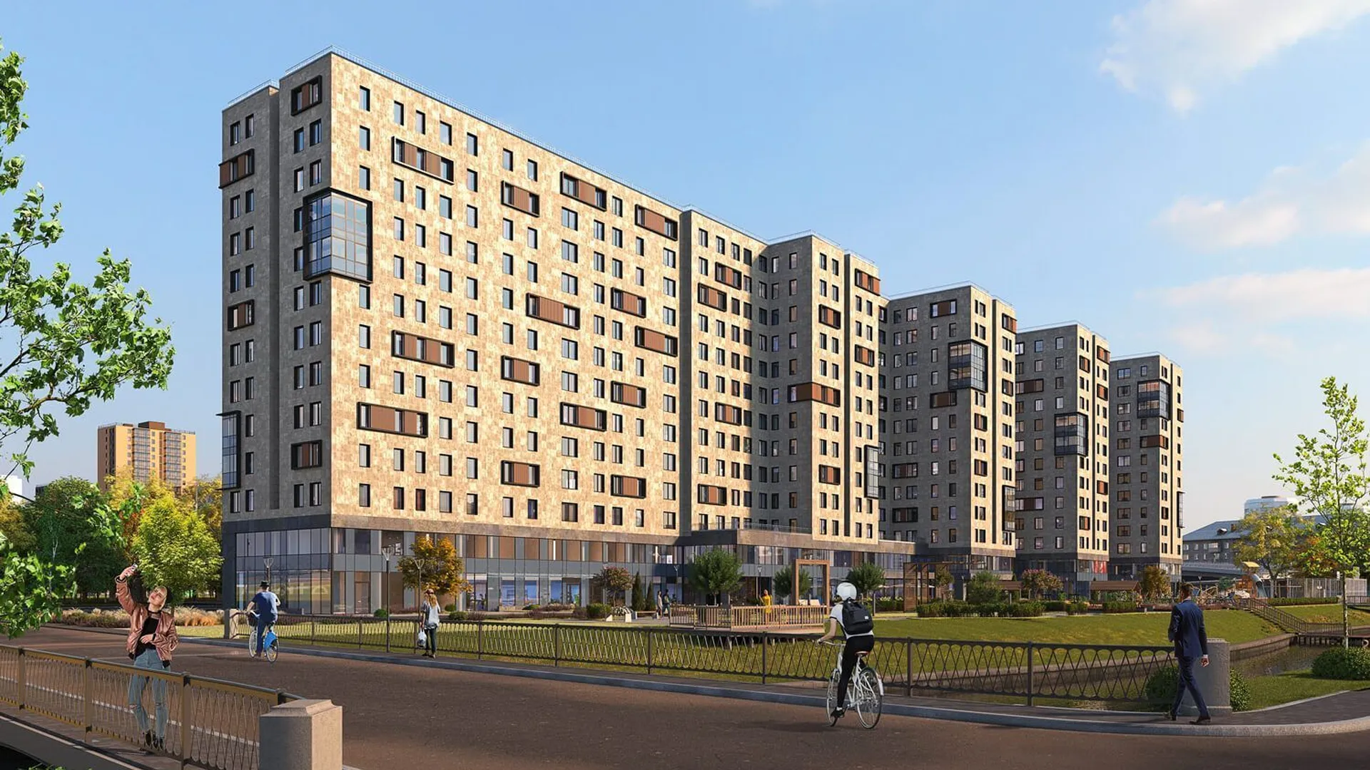 Архитектурное решение сочетает бетонную плитку, имитирующую кирпичную кладку на первых этажах, и декоративную штукатурку светлых оттенков на верхних уровнях. Скругленные углы зданий и разноуровневые фасады формируют узнаваемый облик квартала. Входные группы оформлены единообразно: просторные лобби декорированы натуральными материалами, а центральным элементом выступают световые колонны с флоральными узорами. Подъезды оснащены бесшумными энергоэффективными лифтами.