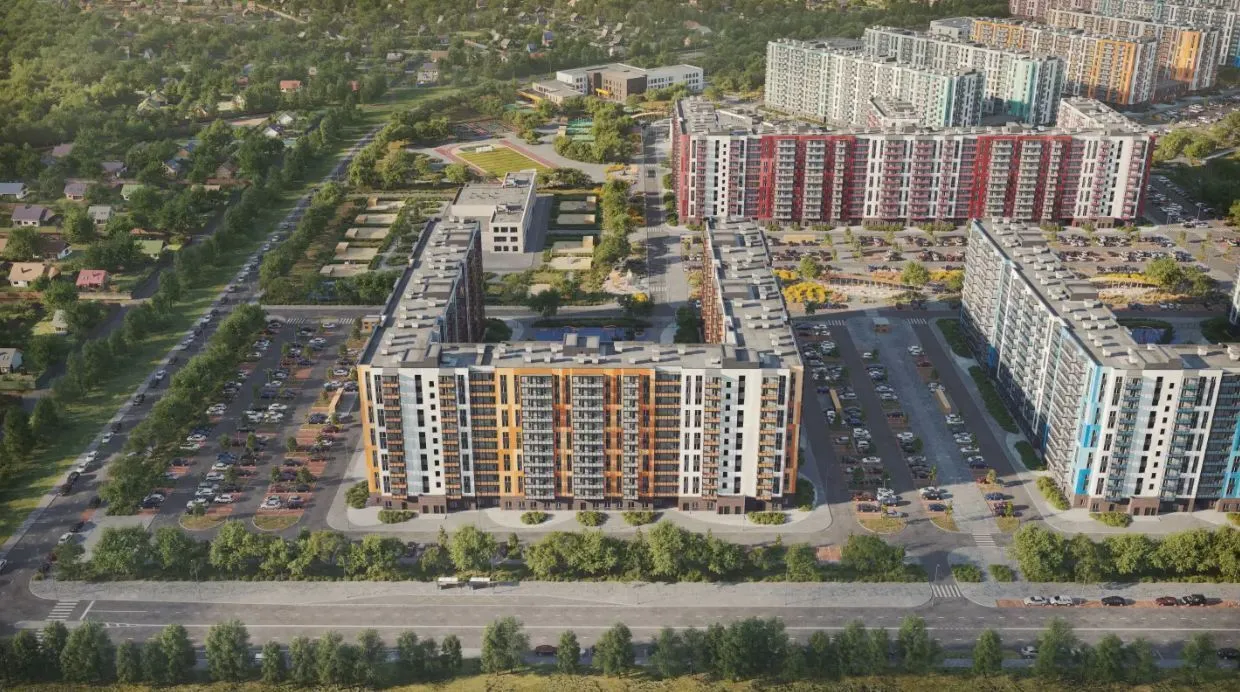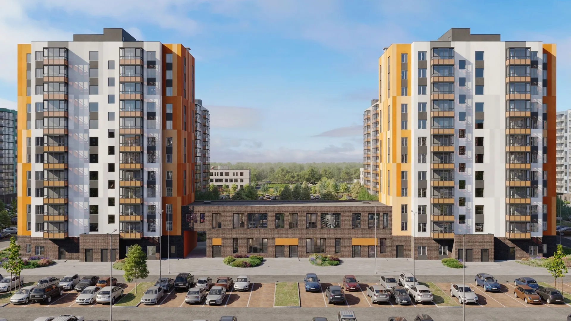 Фасады зданий выполнены в бело‑коричневой гамме с яркими акцентами оранжевого, красного, синего и зелёного цветов. В каждой парадной оборудованы помещения для хранения колясок и велосипедов. Входные группы имеют два выхода — на улицу и во внутренний двор. Дворы закрыты для проезда автомобилей, что обеспечивает безопасность и комфорт жителей.