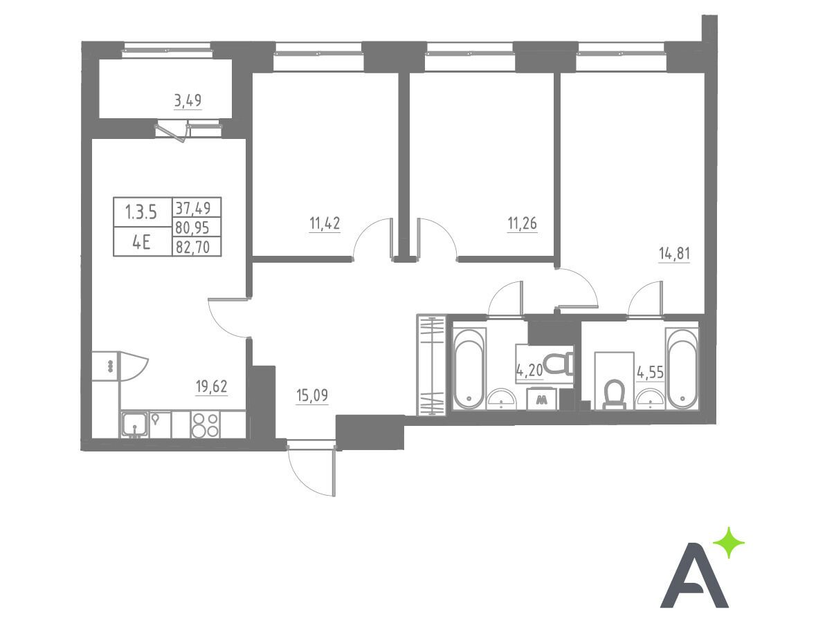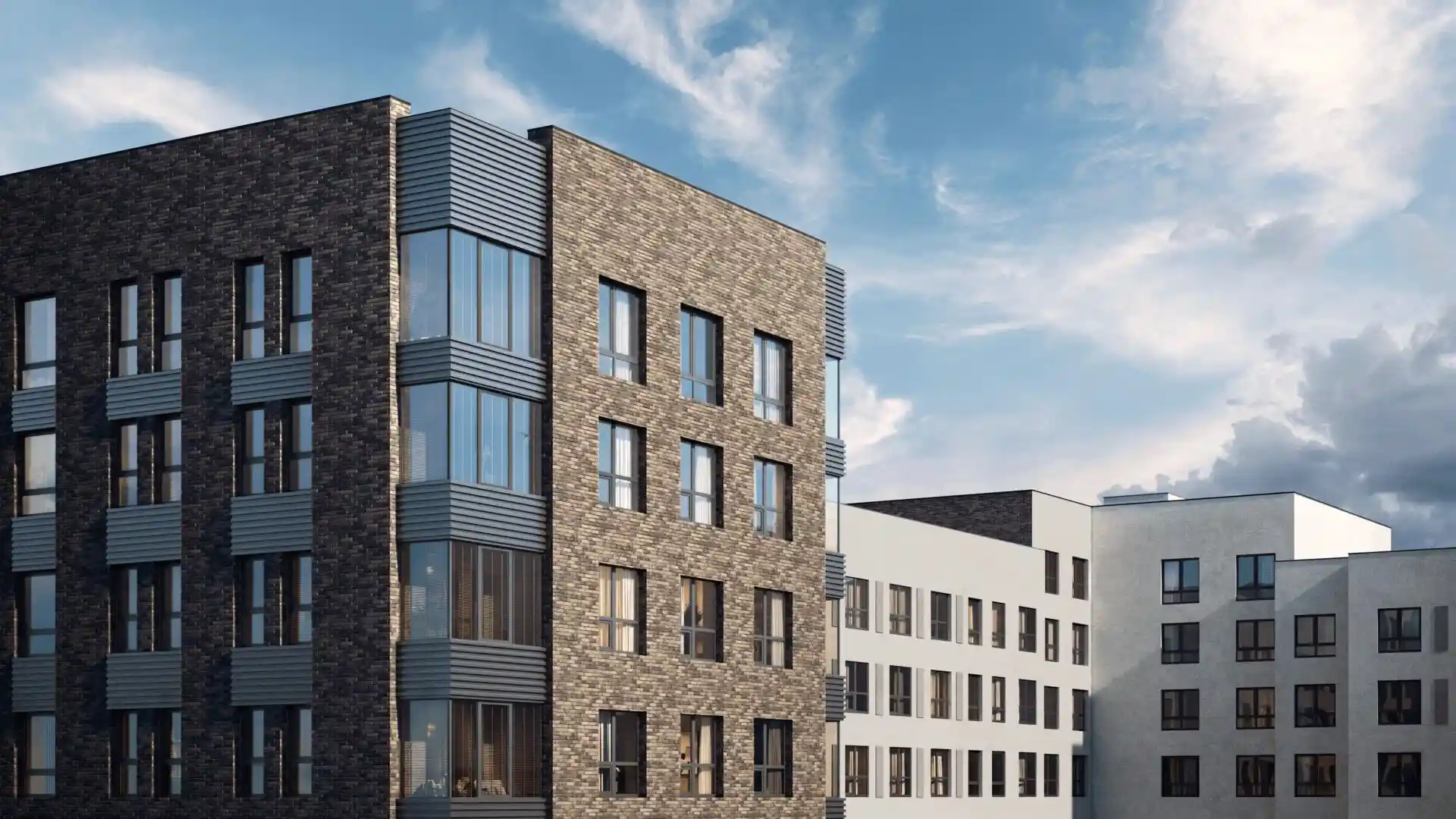 В проекте предусмотрено 418 квартир — от студий до трёхкомнатных. Площадь варьируется от 23 до 89 м², высота потолков достигает 2,85 м. Среди планировочных решений — просторные кухни‑гостиные площадью до 27,3 м², мастер‑спальни с отдельными ванными, выделенные зоны для хранения, отдельные постирочные и прихожие с местами под шкафы.