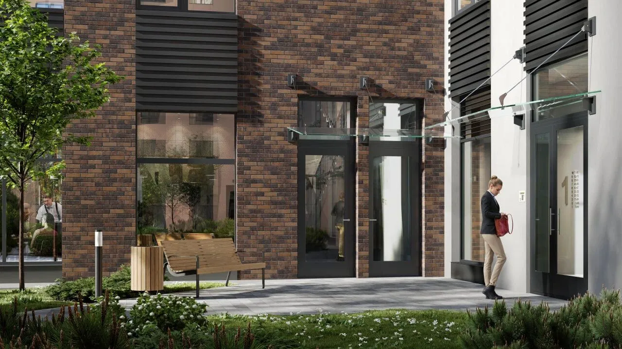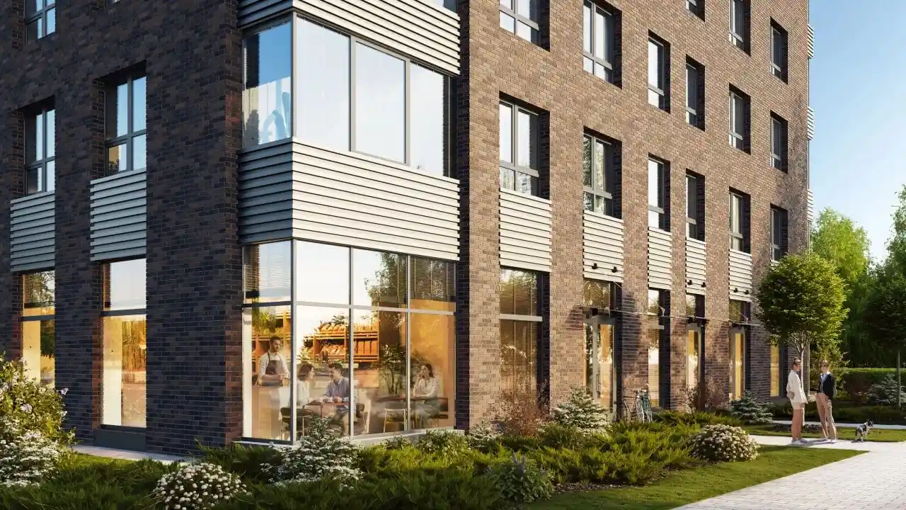 Комплекс представляет собой разноуровневое здание переменной этажности — 11 и 12 этажей. Дом возводится по кирпично‑монолитной технологии и оформлен в английском стиле: фасад выполнен из кирпича с акцентными металлическими вставками. Архитектурное решение продумано так, чтобы обеспечить повышенную инсоляцию — даже квартиры, выходящие во двор, получают достаточное дневное освещение.