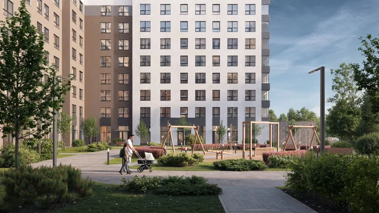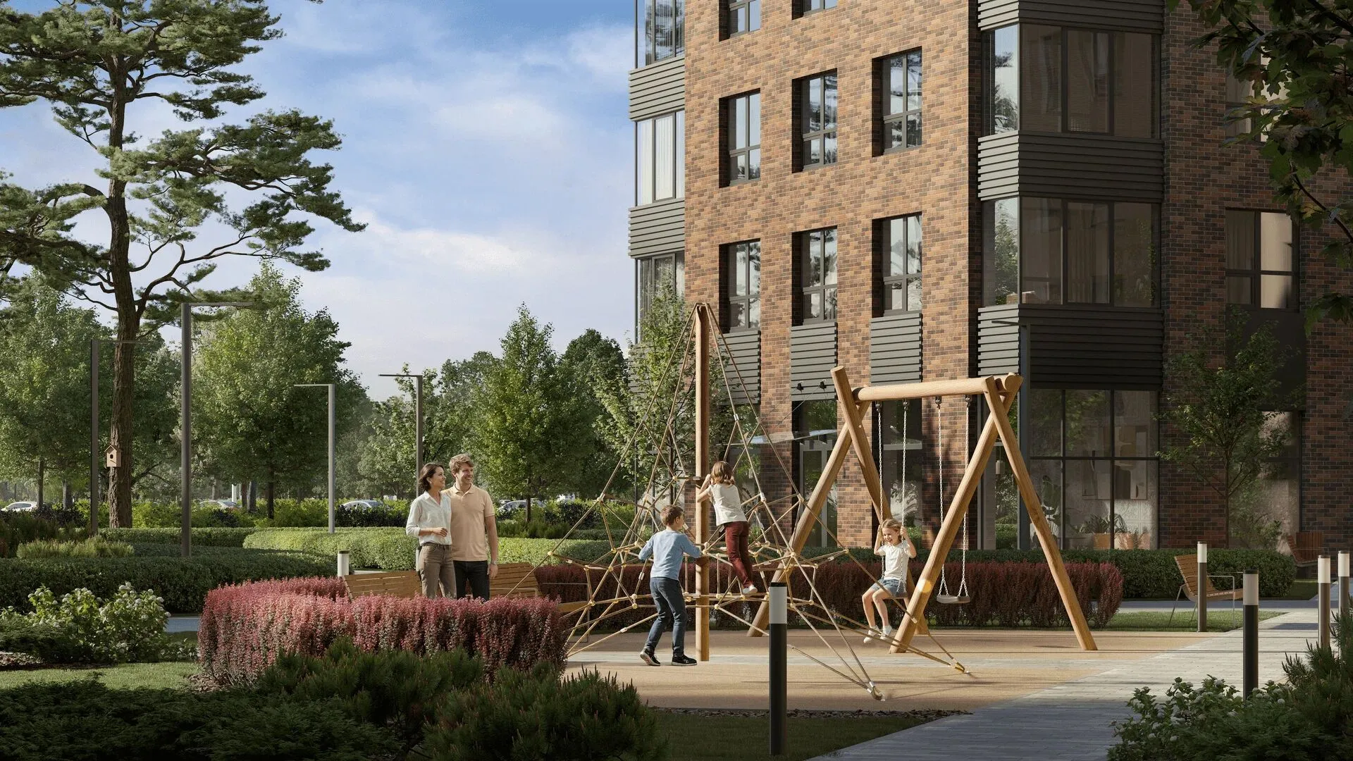 Двор комплекса закрыт для сквозного проезда и организован как многофункциональное пространство: здесь размещены зоны отдыха, пешеходные дорожки, озеленённые участки, детские и спортивные площадки, места для выгула собак и велопарковки. В перспективе в районе появится экопарк площадью 3 гектара — пространство для прогулок, спорта и отдыха на природе.