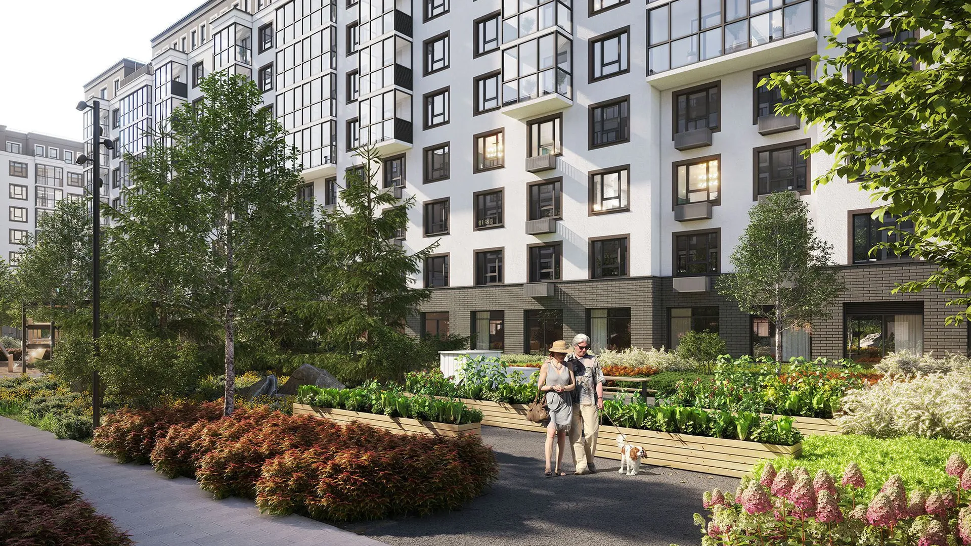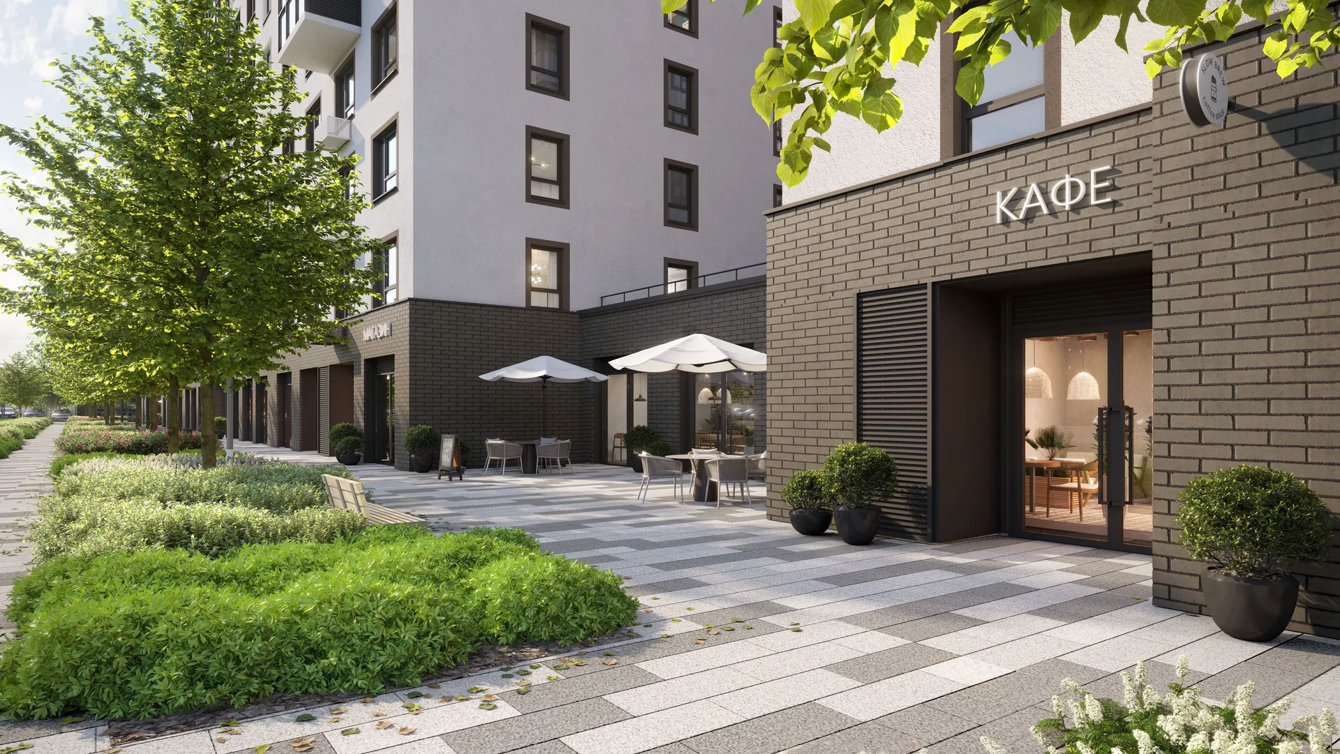 Благоустройство территории ориентировано на разносторонние потребности жителей. В центре квартала появится площадь с лавочками и вечнозелёной ёлкой, через которую пройдёт пешеходный бульвар, объединяющий все дома и общественные пространства. Более 70 % площади дворов займут растения: газоны, злаковые, кустарники, высокие сосны. Для активного отдыха предусмотрены спортивные зоны с тренажёрами, многофункциональным полем, столами для тенниса, а также кластер с площадкой для йоги, воркаутом и гриль‑станцией. Есть прогулочный маршрут и велодорожки, игровые площадки и плейхабы для детей, площадка для выгула собак. Особая часть проекта — соседский центр с коворкингом, кухней‑гостиной, кабинетом, детской игровой, спортивным залом и творческими пространствами. Здесь можно проводить встречи, праздники, лекции и мастер‑классы.