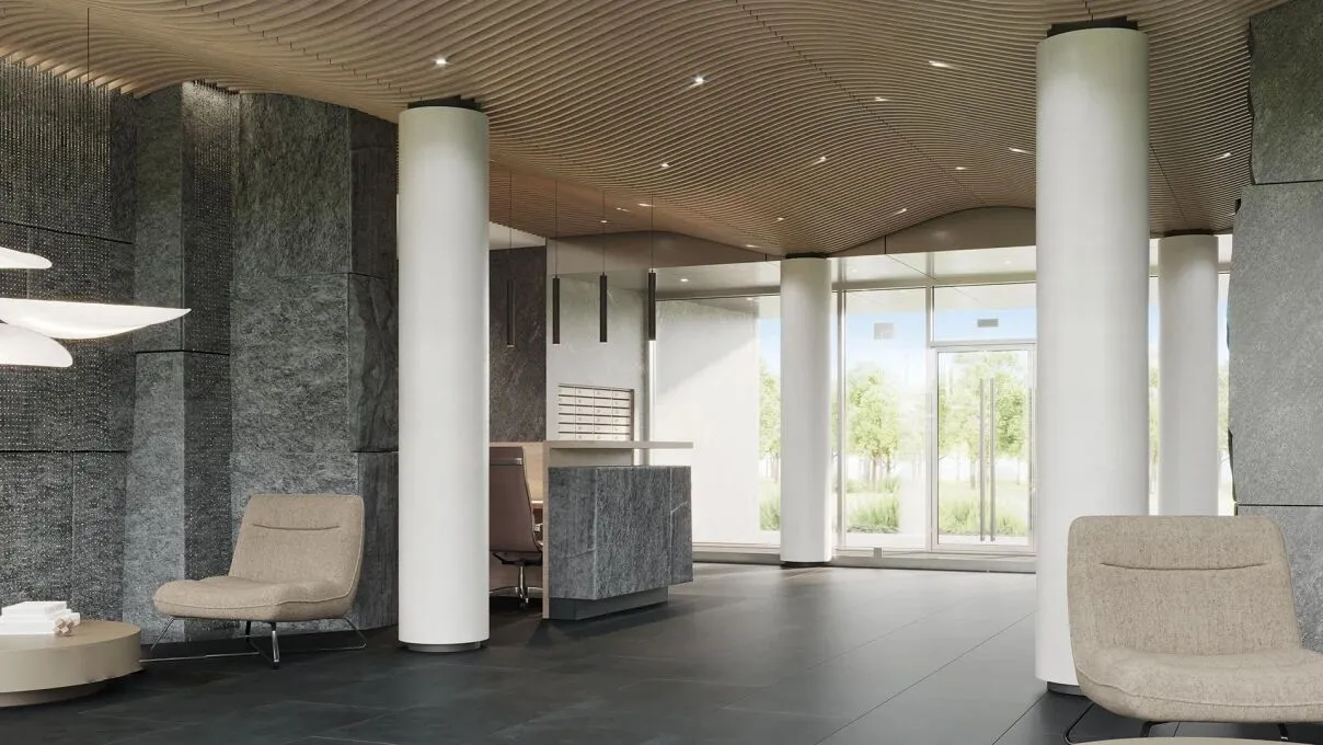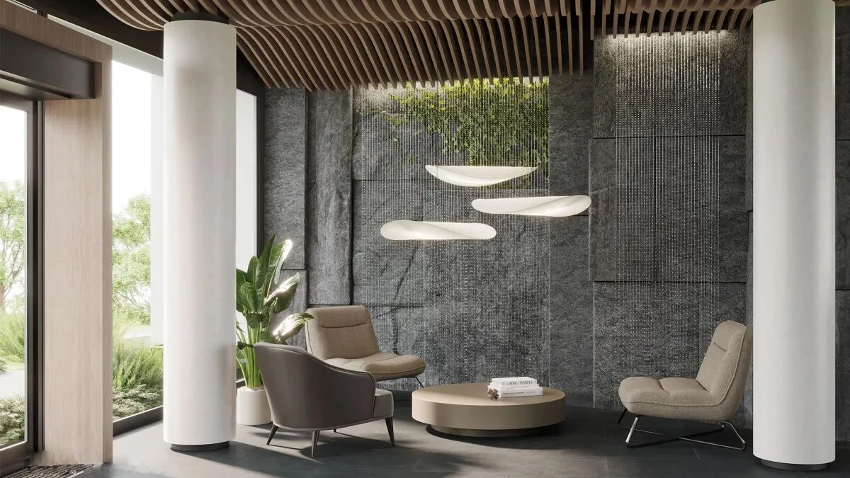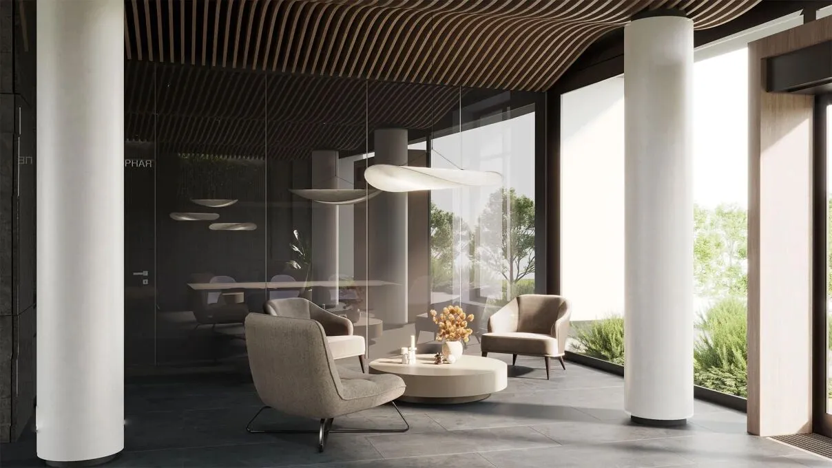 Парадное лобби площадью 157 м выдержано в водной тематике: здесь установлены волнообразные потолки высотой 3,6 м, оборудована витражная переговорная с кофепоинтом и размещены два арт‑объекта — скальные стены с капельными фонтанами.