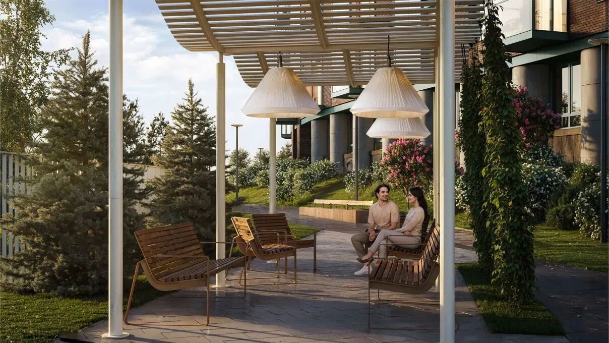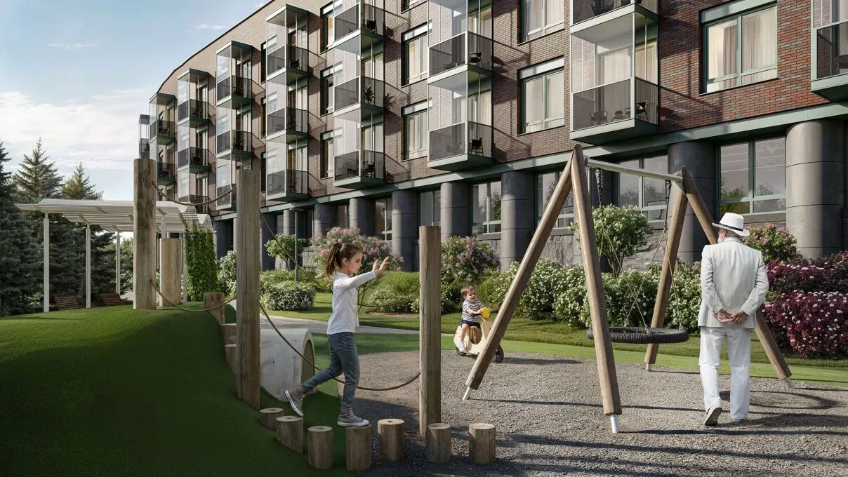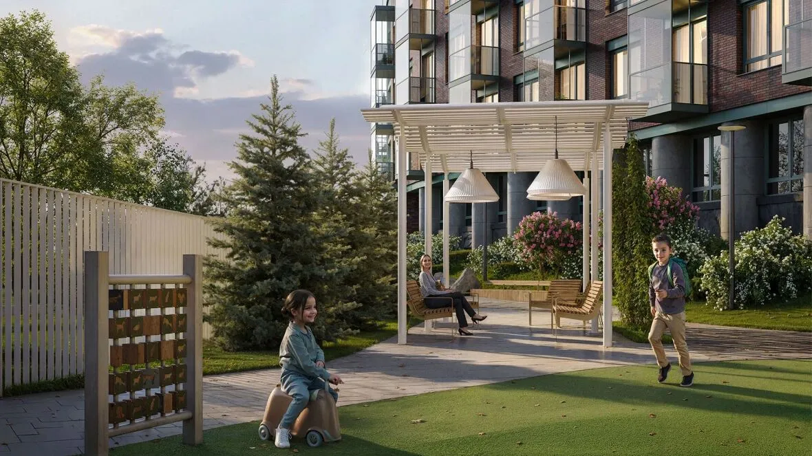 На первом этаже запланирован приватный wellness‑центр с фитнес‑залом, оснащённым кардио‑ и силовыми тренажёрами, йога‑румом, массажным кабинетом и хаммамом. Во дворе обустроены детская площадка с качелями, горкой, тоннелем и лошадками‑качалками из натуральных материалов, деревянный амфитеатр для общих собраний, пергола с абажурами, зоны отдыха с экологичными скамейками, пешеходные дорожки и клумбы.