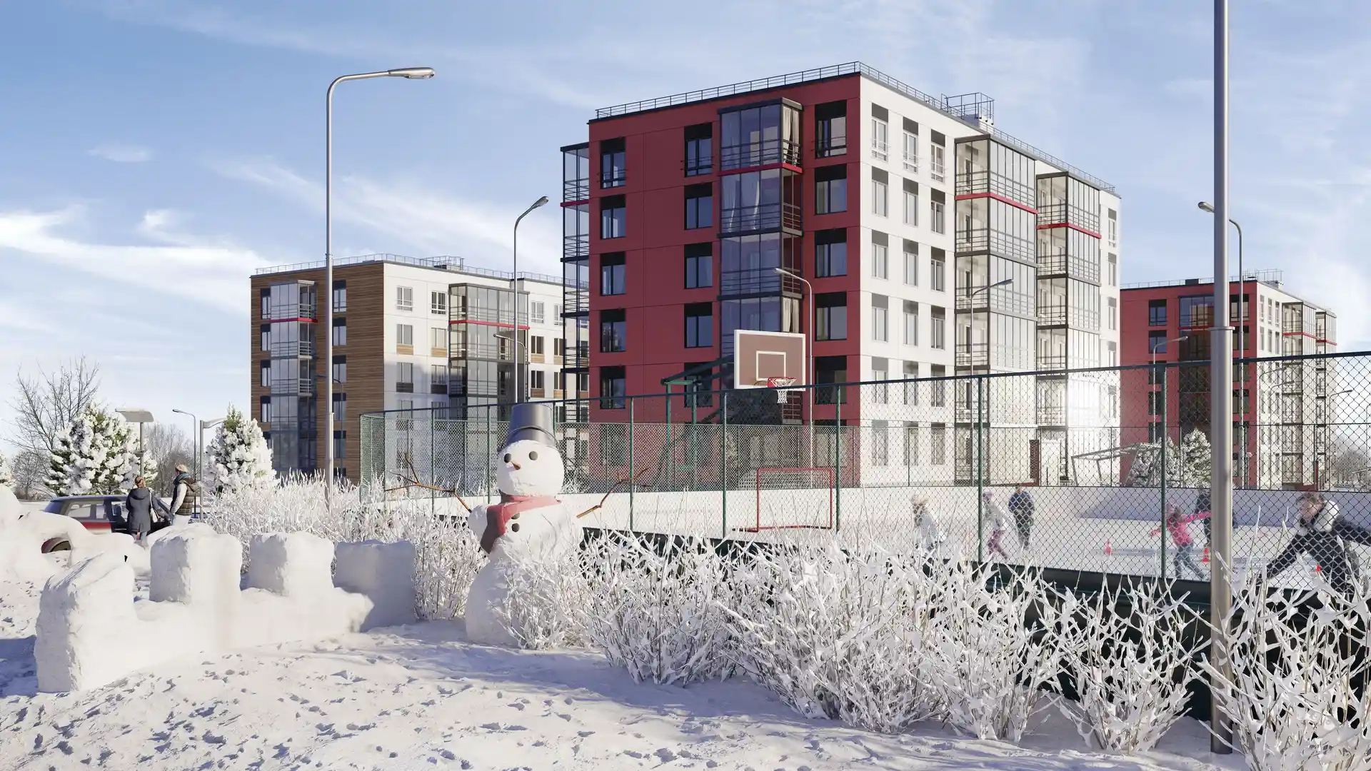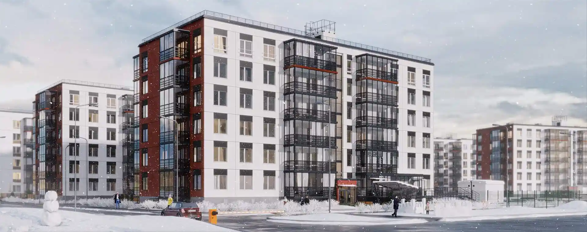 При строительстве применена шведская концепция домостроения: каркас зданий выполнен из сборных железобетонных элементов. Здания оснащены системой вытяжной вентиляции, а высота потолков в квартирах составляет 2,72 метра.