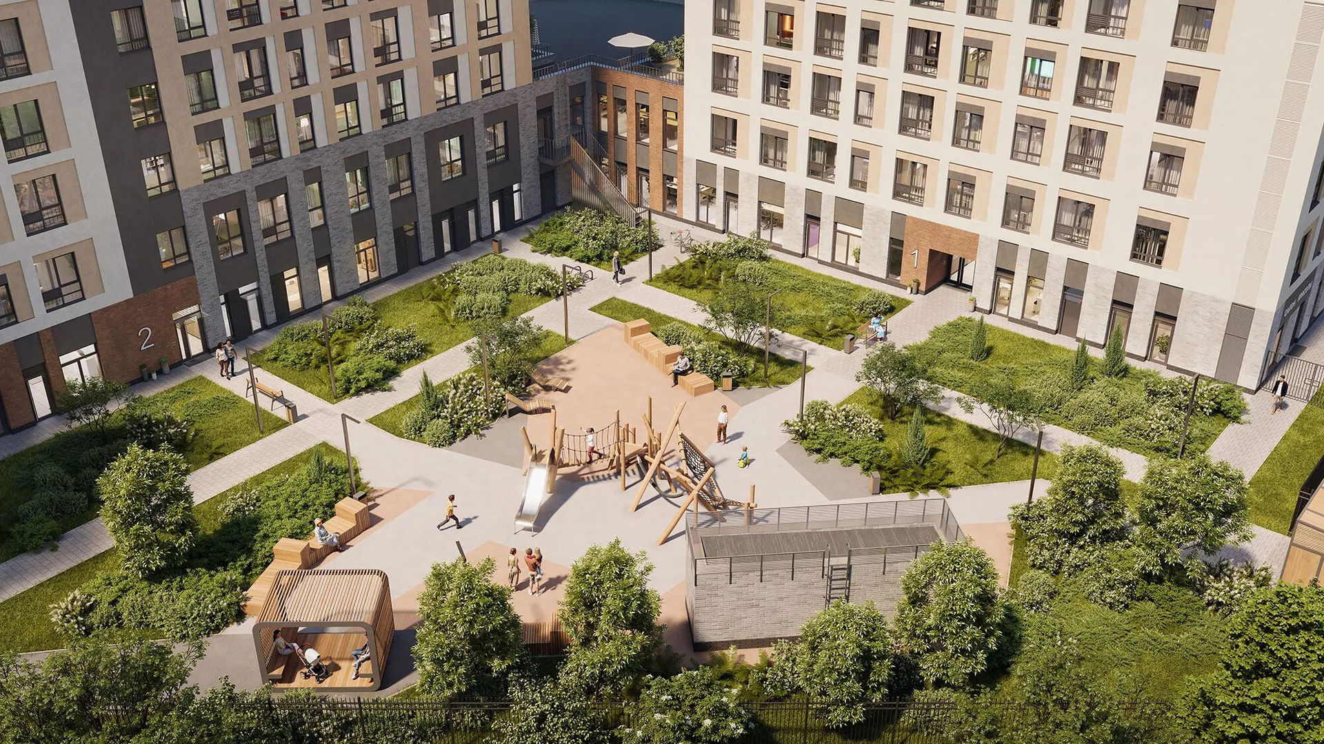На территории комплекса обустроен закрытый внутренний двор с детской площадкой (канатный комплекс, песочница, качели) и спортивной зоной с уличными тренажёрами. Также предусмотрены зоны отдыха и ландшафтное озеленение. Для автовладельцев доступен подземный паркинг на 62 машино‑места с доступом на лифте. Дополнительно оборудованы 25 кладовок и гостевые стоянки вдоль внешнего периметра. В холлах есть колясочные, у входов в парадные — велопарковки.
